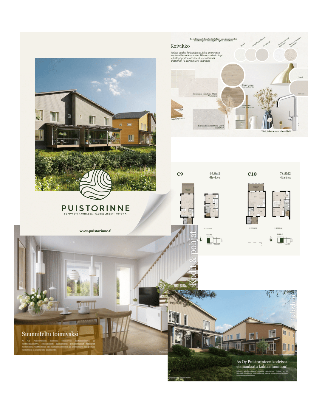 Kevytbrändäyksemme avulla kohteelle luotiin yhtenäinen ja houkutteleva ilme, joka tukee myyntiä. Toteutimme kokonaisuuden, joka sisältää muun muassa  logon, sloganin, laskeutumissivun, esitteen ja työmaakyltin – materiaalit, jotka vahvistavat brändiä ja erottavat kohteen kilpailijoistaan. Samalla varmistimme, että viestintä puhuttelee oikeaa kohderyhmää ja tuo esiin ne arvot, jotka tekevät Puistorinteen kaltaisista kohteista aidosti haluttuja.