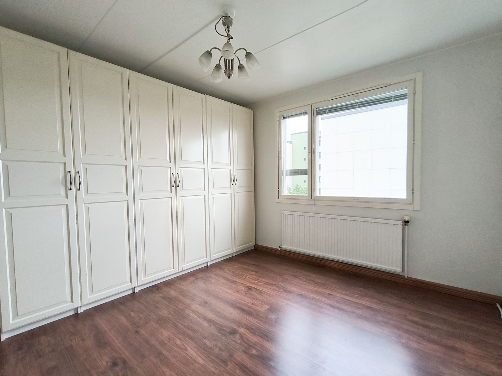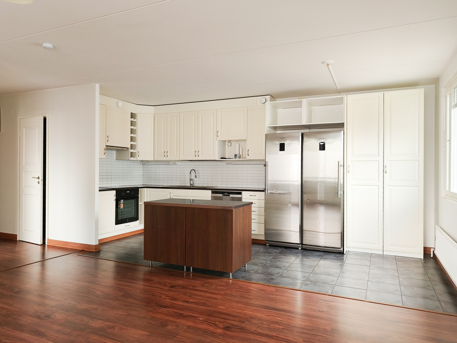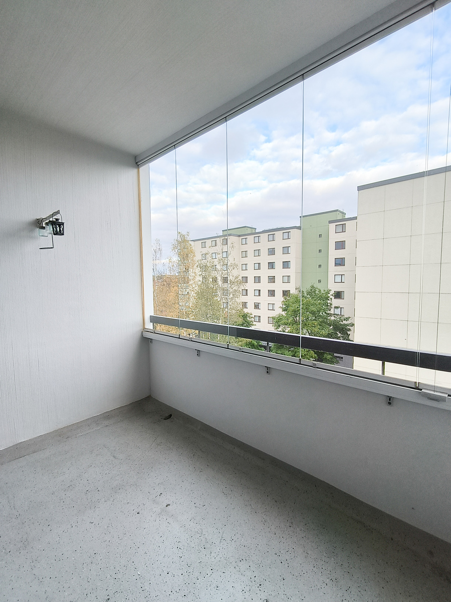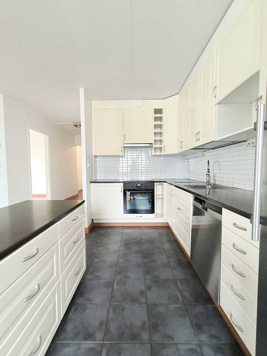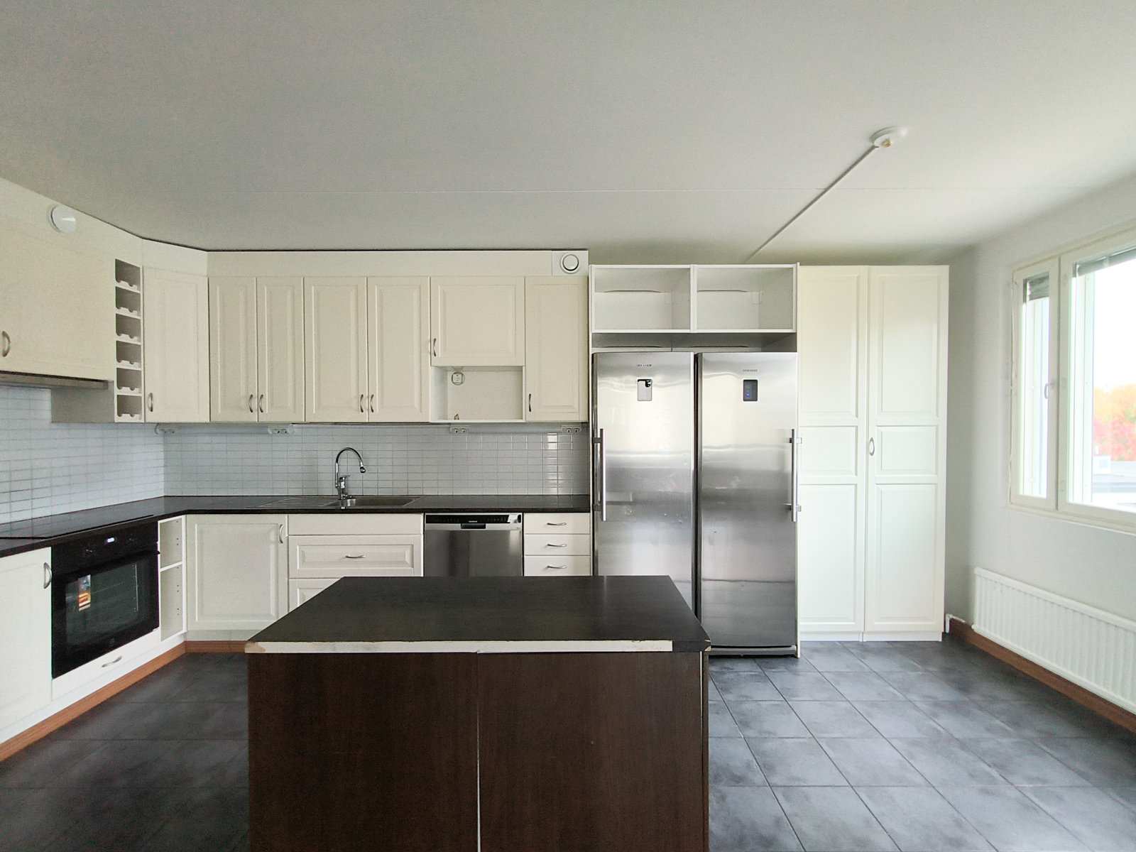 Tämän kodin sydämenä toimii avokeittiö-olohuone yhdistelmä, joka luo ison tilan ja mahdollistaa monia vaihtoehtoja sisustamiselle. Olohuoneesta on käynti lasitetulle parvekkeelle josta on rauhalliset ylimmän kerroksen näkymät. Avokeittiössä on paljon kaappi- ja laskutilaa, iso jääkaappi ja pakastin, induktioliesi, uusi uuni ja iso astianpesukone. Asunnon kaikki kolme makuuhuonetta ovat tilavia ja kahdesta niistä löytyy runsaasti kaappeja säilytykseen. Kylpyhuoneessa on tila päältä täytettävälle pyykinpesukoneelle. Erillinen wc.