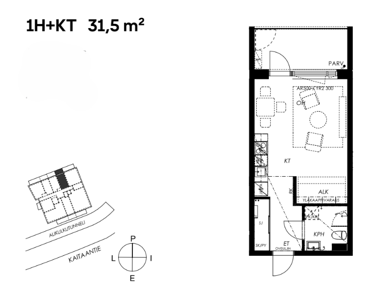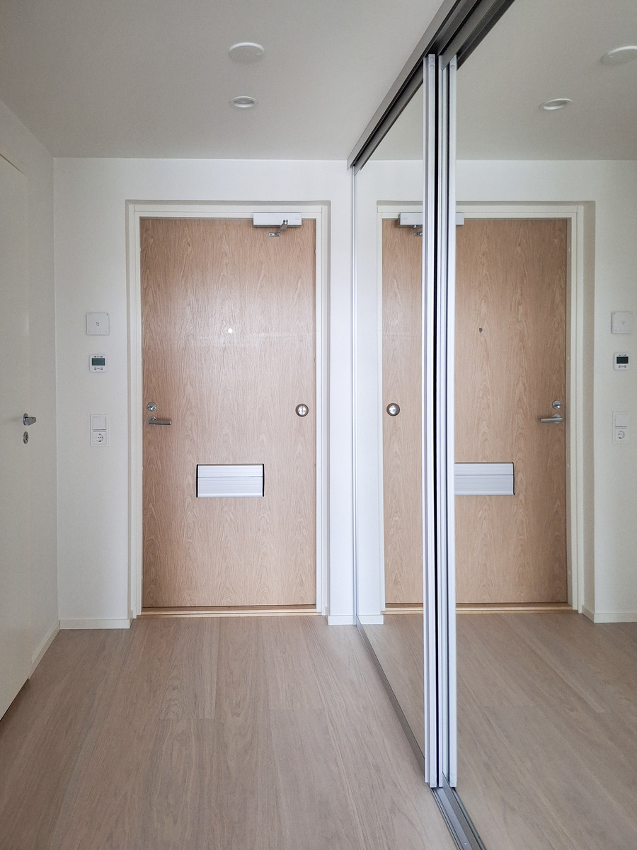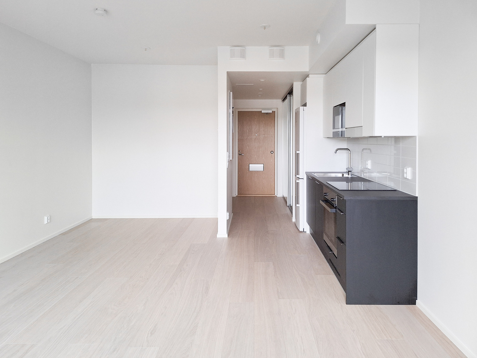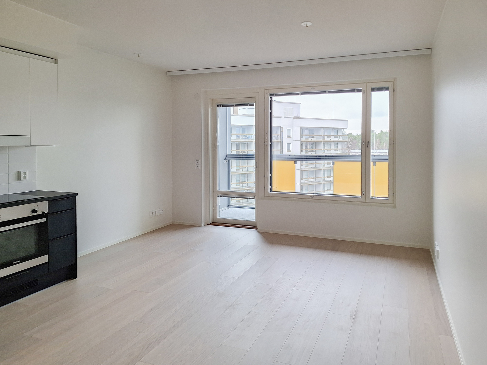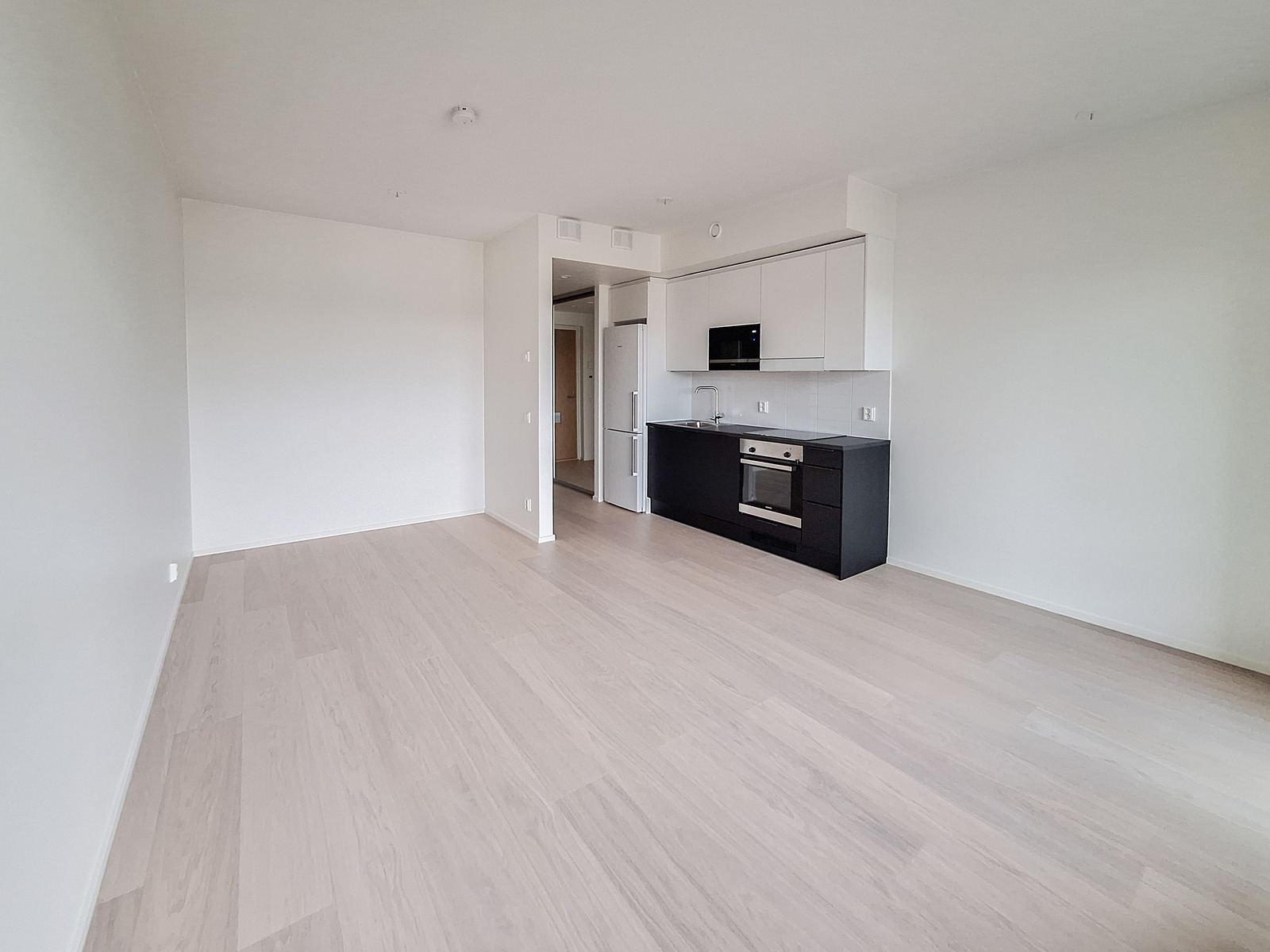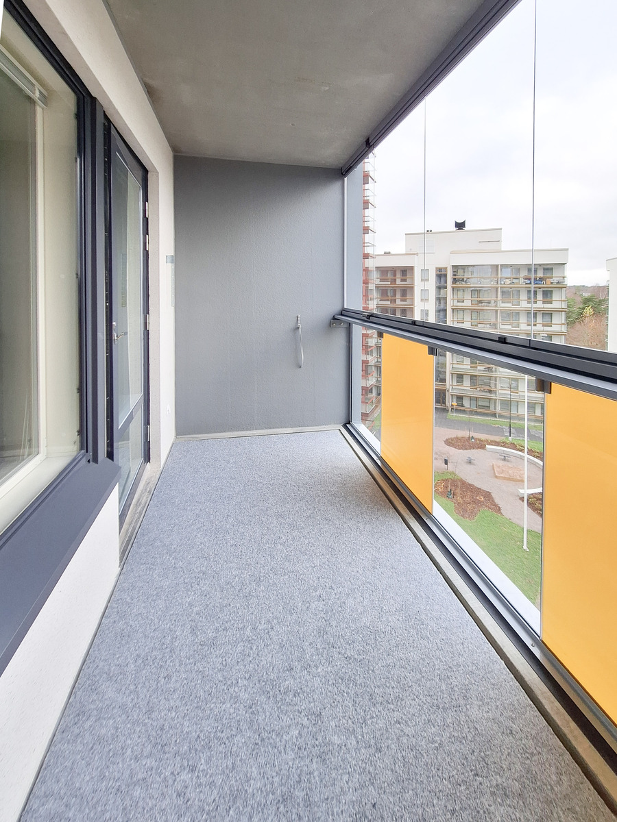 Tämä uudehko koti toimivalla pohjaratkaisulla tarjoaa mukavasti yksityisyyttä, kun suoraan vastapäätä ei ole taloa. Asunnon seinät ovat raikkaan valkoiset ja lattiat ylellistä parkettia. Modernista keittiöstä löytyy kaikki tarvittava kotikokin tarpeisiin astianpesukoneineen. Sängylle on oma nurkkaus, jolloin muu tila jää vapaasti sisustettavaksi. Huoneeseen mahtuukin helposti sekä sänky, sohva että ruokapöytä. Tyylikkäästi laatoitetussa kylpyhuoneessa on peilikaappi, kääntyvä suihkuseinä ja pesukoneliitäntä. Asunnon helmi on suuri, lasitettu parveke joka toimii lisähuoneena keväästä pitkälle syksyyn.