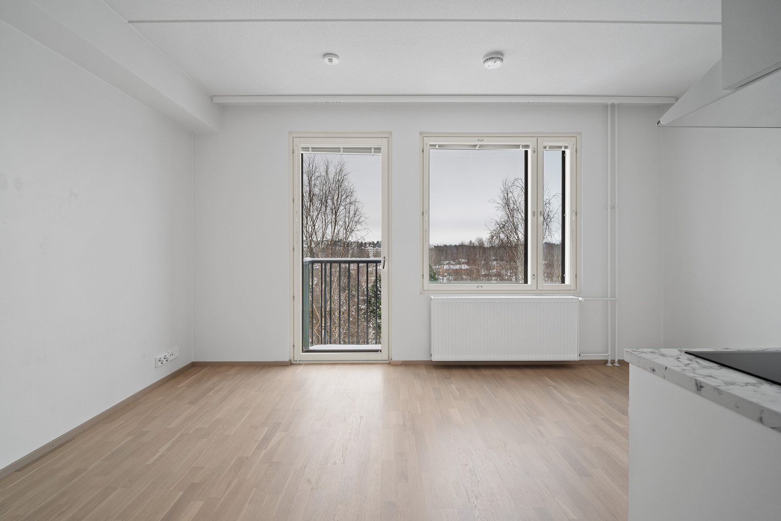 Asunnon 27 neliötä on suunniteltu fiksusti. Keittiöstä löytyy tarvittavat kodinkoneet ja erillisessä vaatehuoneessa on reilusti tilaa pitämään vaatteet ja tavarat järjestyksessä. Ikkunanäkymät sekä ranskalainen parveke suuntaavat Jokiuoman puiston suuntaan.
