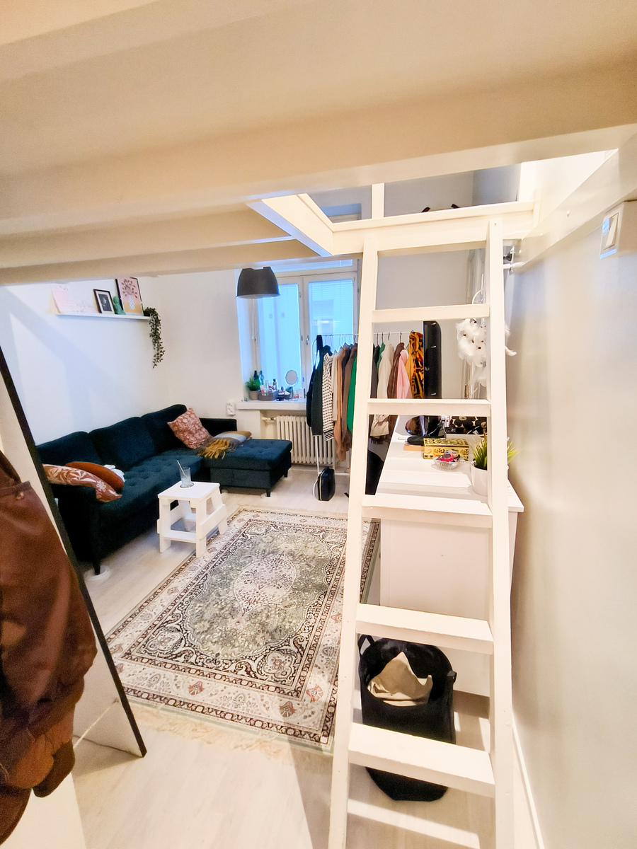 Tämän hyväkuntoisen kodin korkea huonekorkeus on mahdollistanut parven nukkumista varten ja näin tilaa jää enemmän oleskeluun. Keittiö on parven alapuolella ja kaappitilaa on mukavasti. Seinät ovat raikkaan valkoiset ja lattia kaunista vaaleaa laminaattia. Kylpyhuone on moderni ja tyylikäs.