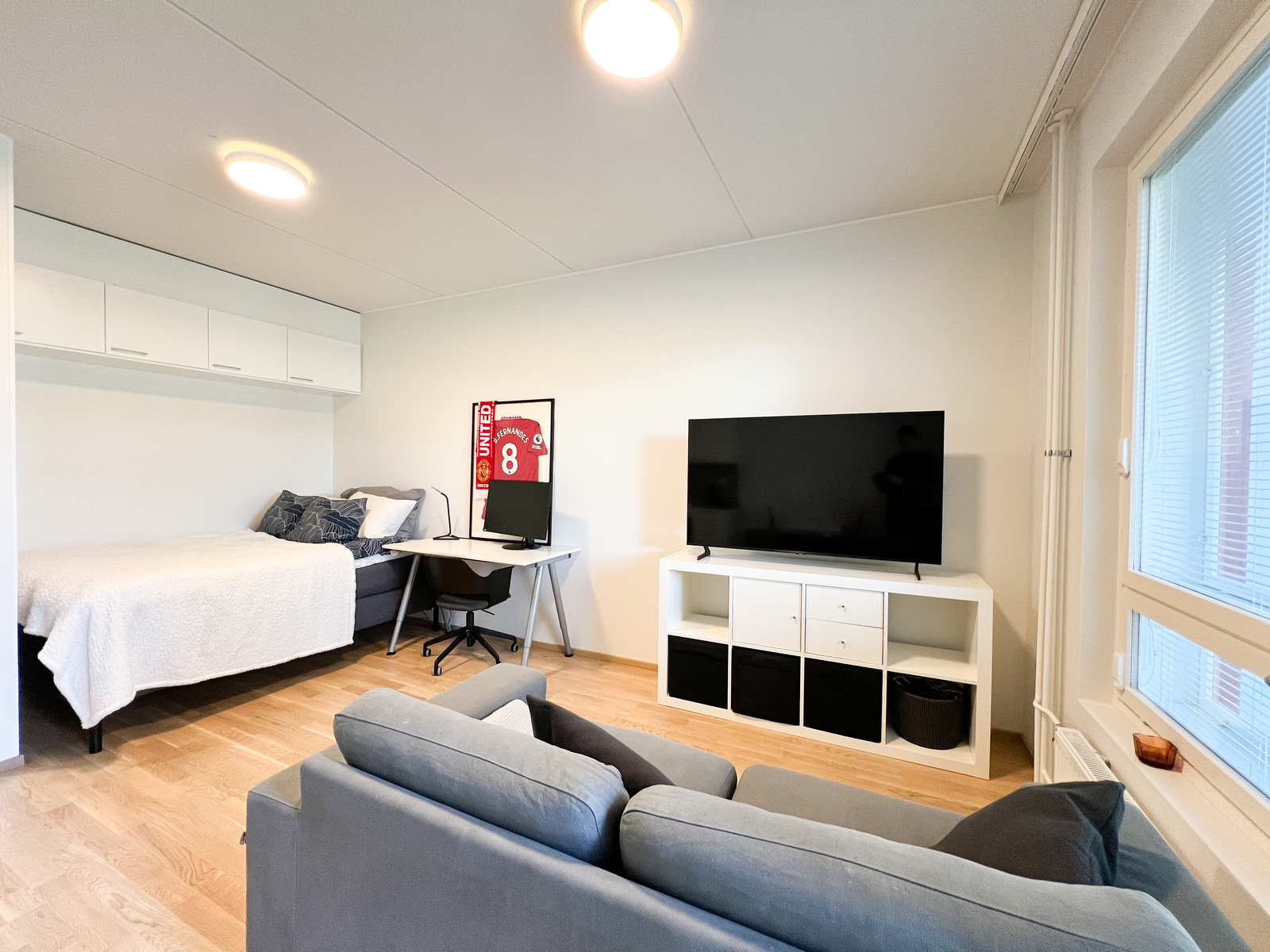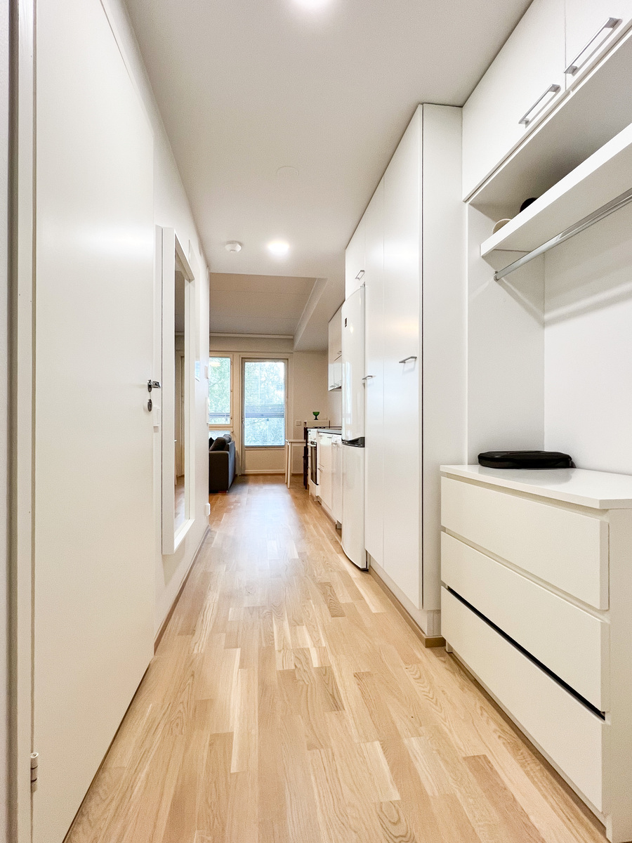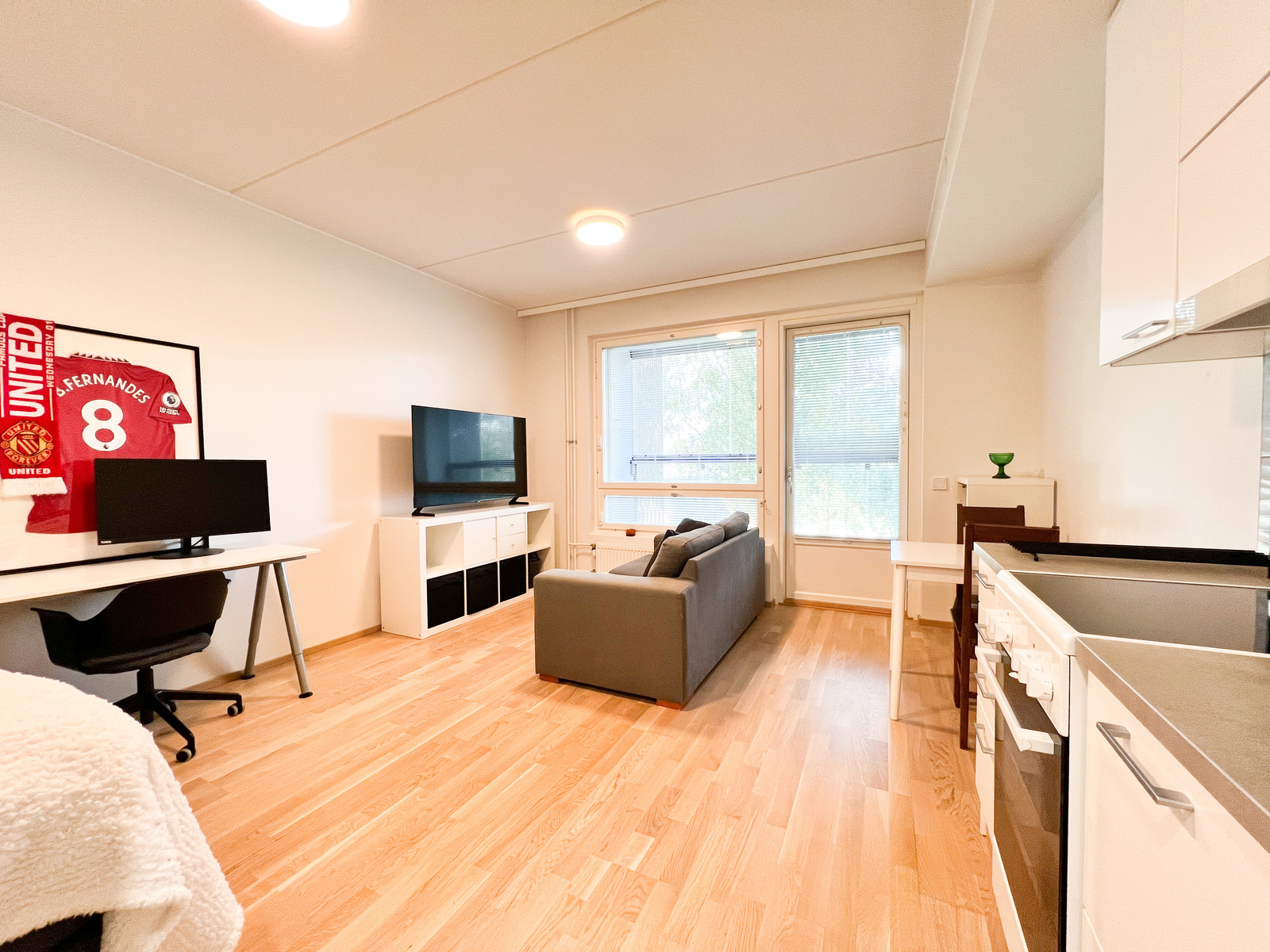 Tämä käytännössä uudenveroinen yksiö hurmaa maisemillaan ja toimivalla pohjaratkaisullaan. Huoneiston kunnosta on pidetty erinomaista huolta, ja laadukkaat pintamateriaalit, moderni keittiö sekä kauniisti laatoitettu kylpyhuone tekevät arjesta miellyttävää. Tilavalta lasitetulta parvekkeelta avautuvat rauhalliset näkymät taloyhtiön takapihalle ja kanavalle, mikä tarjoaa hienon lisän asumiseen.