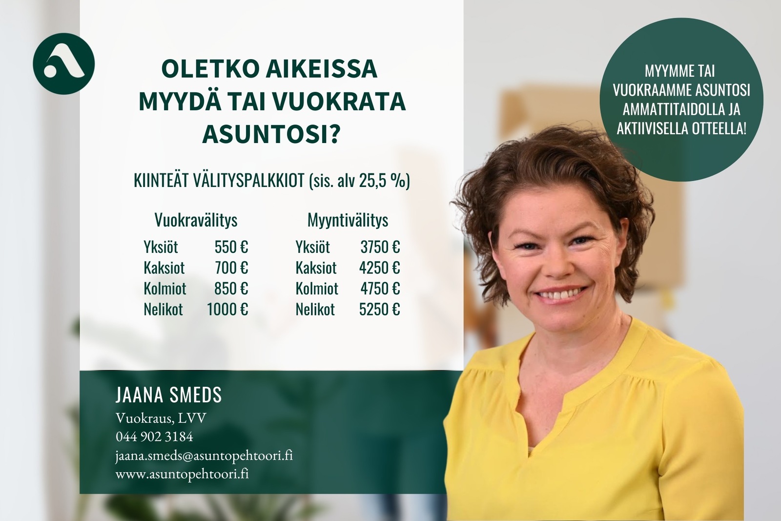Voisiko tämä olla sinun seuraava kotisi? Täytä tietosi asuntohakemukselle, niin olemme sinuun yhteydessä: https://www.asuntopehtoori.fi/hakemus (valitse välittäjäksi Jaana Smeds)