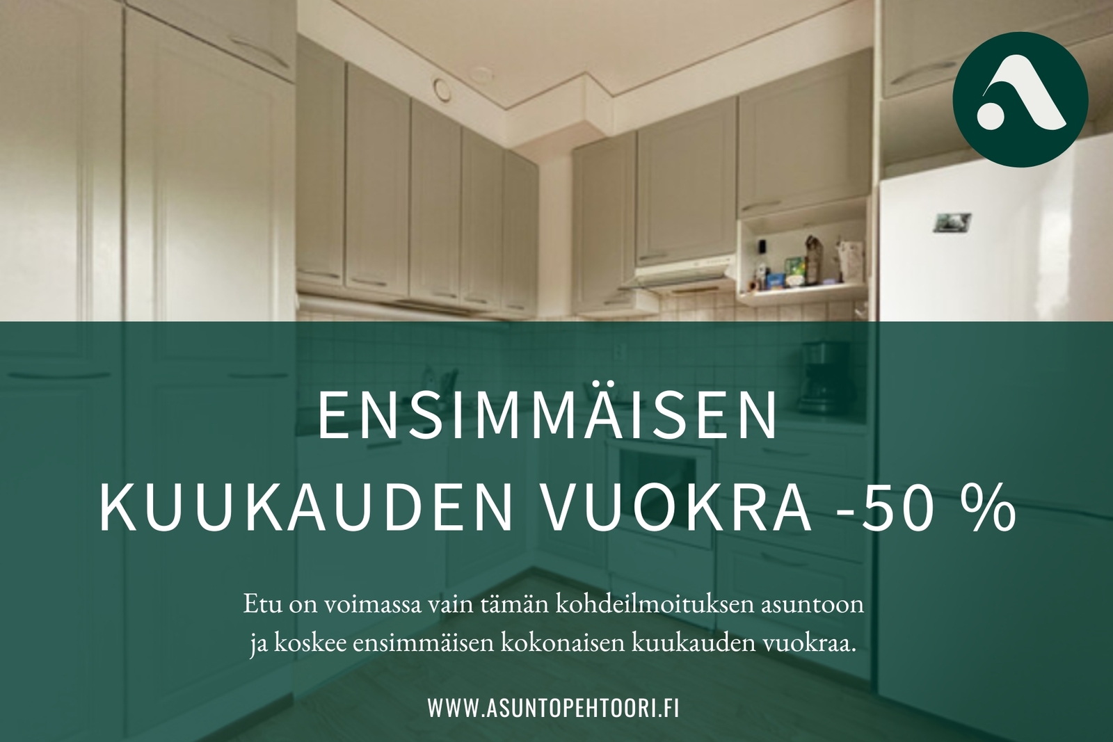 Iso, ylimmän kerroksen kotoisa kaksio metsänäkymillä – ensimmäisen kokonaisen kuukauden vuokra puoleen hintaan!