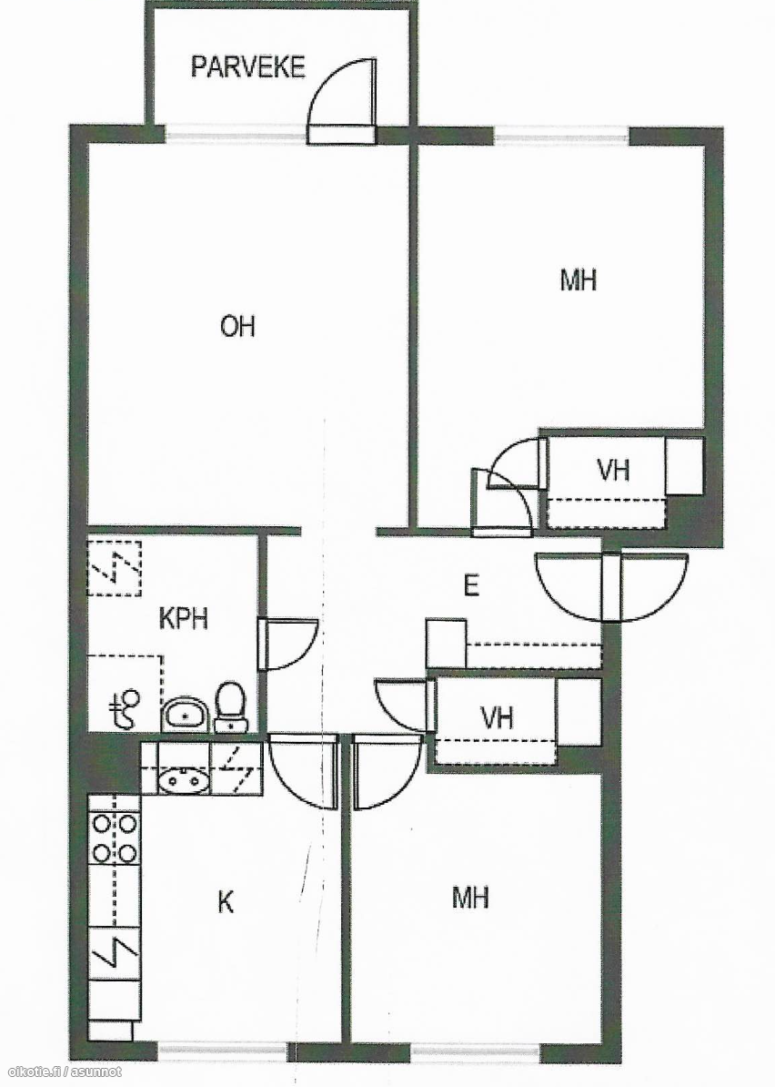 | Huoneiston kokoonpano | 3h + k + kph + 2x vh + lasit.parv. |