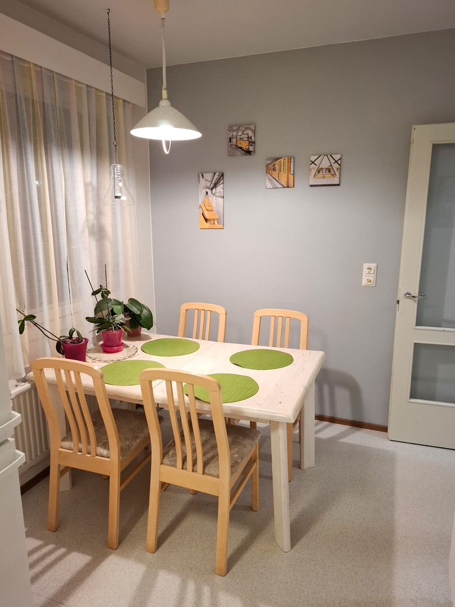 Asunnossa on siistit pinnat ja hyvin tilaa esimerkiksi pienelle perheelle. Erillisessä keittiössä on tilaa pöytäryhmälle ja vaaleat kaapistot. Lattiat ovat helppohoitoista muovimattoa ja seinät maalattu valkoisella, joka tekee huoneista raikkaan näköisen. Kylpyhuoneessa on peilikaappi ja liitäntä pyykinpesukoneelle. Vaatehuoneista ei ole tässä asunnossa pulaa, sillä niitä on neljä.