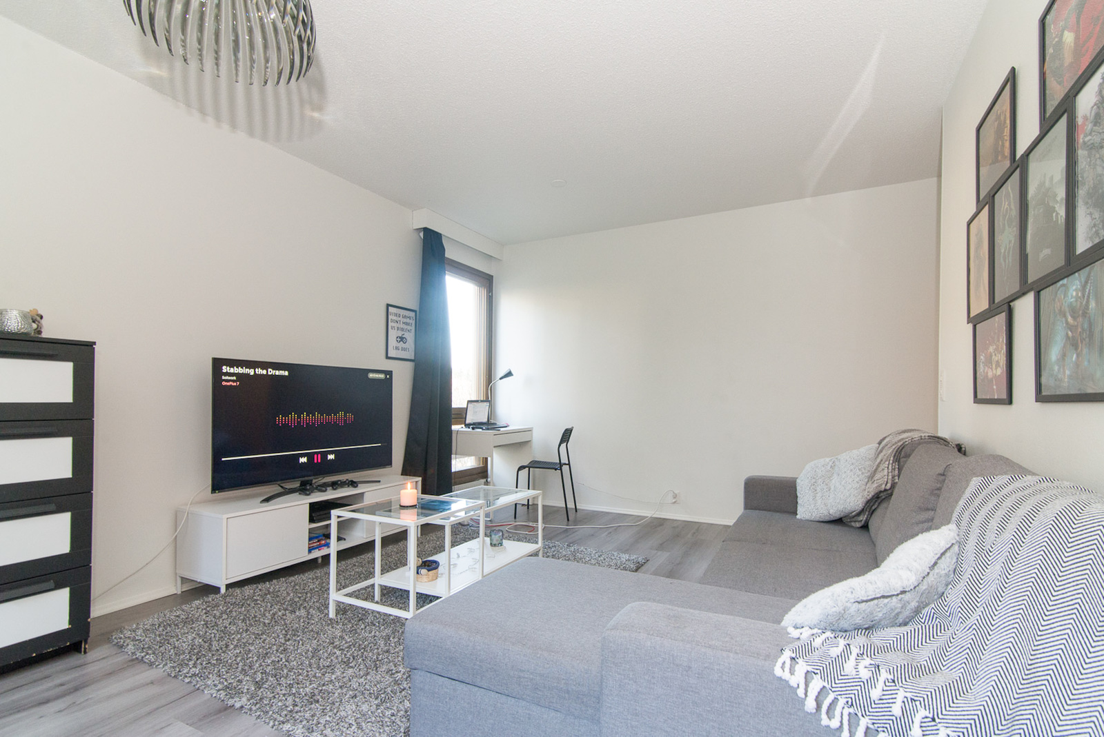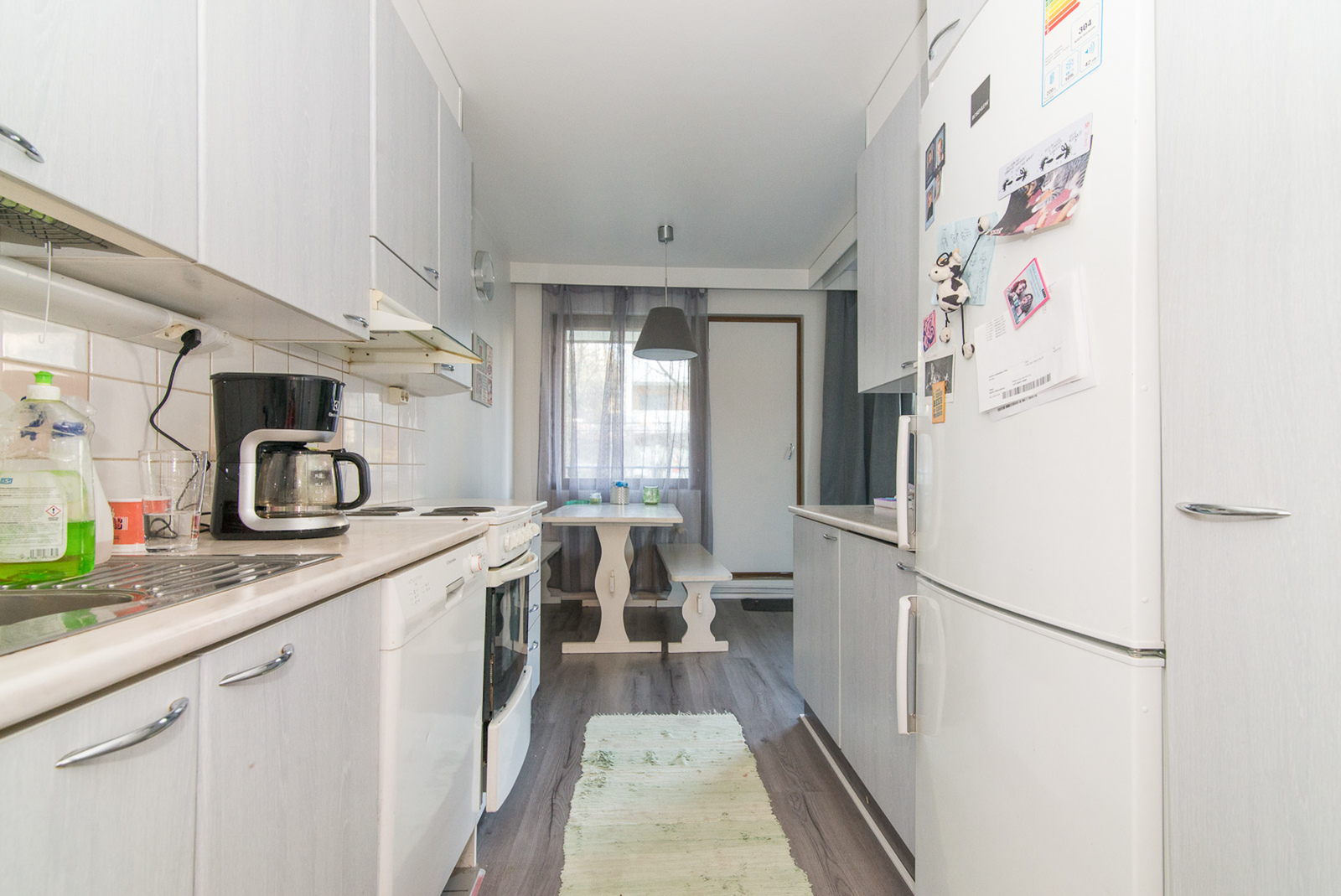 Asunnossa on kokonaan laatoitettu kylpyhuone, jossa pesukoneliitäntä ja erillinen wc. Asunto on ensimmäisessä kerroksessa, mutta ei kuitenkaan maantasalla. Olohuoneen ja keittiön välissä on kulku parvekkeelle. Olohuoneen lattiassa on kaunis puukuosinen laminaatti ja seinät maalattu valkoisella. Keittiössä on jääkappi-pakastin ja asunnossa oleva astianpesukone ja liesi.