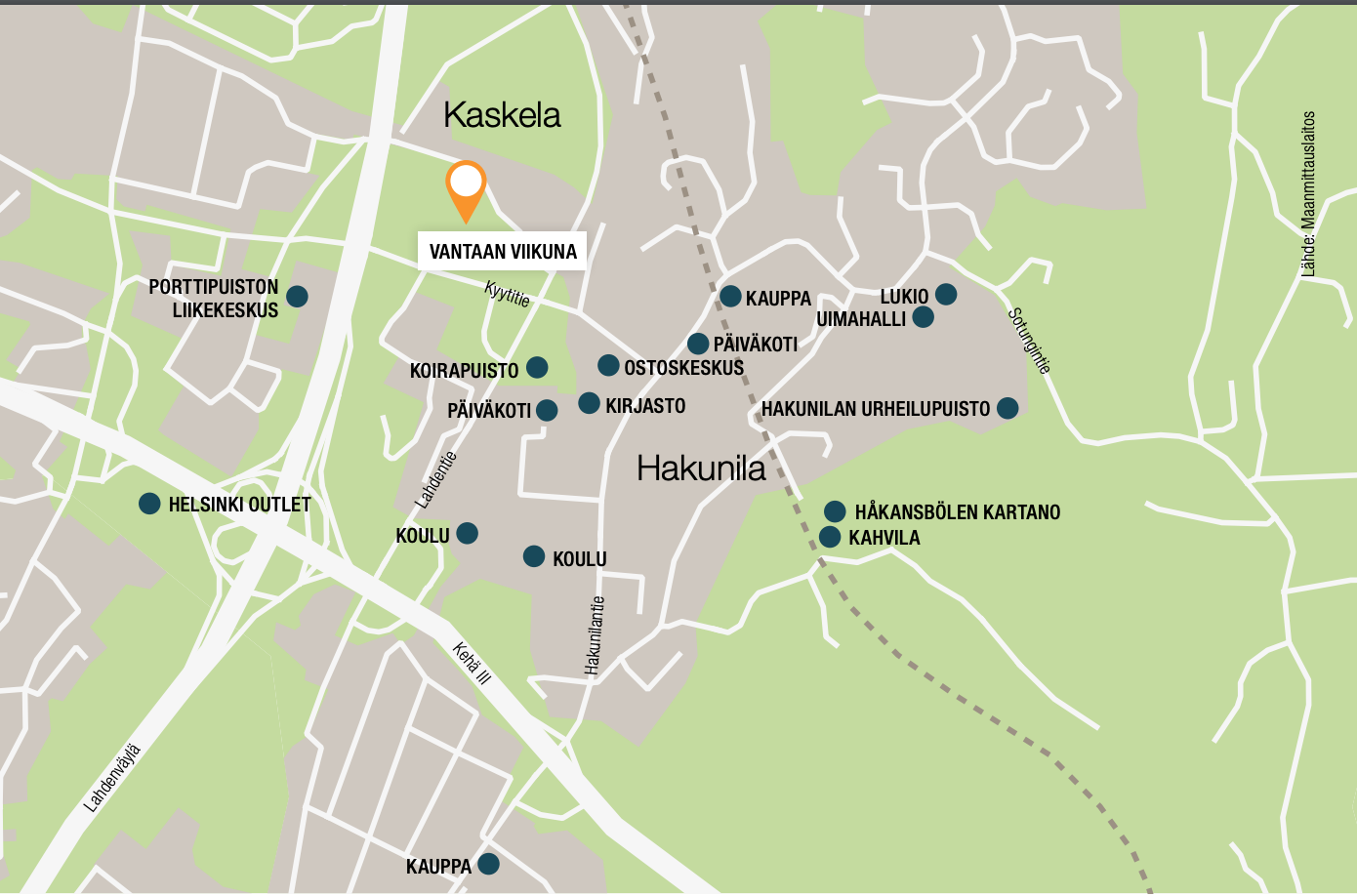 Taloyhtiö sijaitsee viehättävän metsikön laidalla Kaskelanrinteessä. Kaskelanrinne on luonnonläheinen ja rauhallinen asuinalue Kaskelan pientaloalueen ja Hakunilan palveluiden kainalossa. Kulkuyhteydet ovat loistavat niin autoilijalle, julkisten käyttäjille kuin pyöräilystä nauttiville. Lähin bussipysäkkikin on alle 200 m päässä. Myös suunnitteilla oleva Vantaan ratikka kulkisi kotikorttelin vierestä. Hakunilan palvelut löytyvät ihan vierestä ja shoppailijaa ilahduttaa myös Porttipuiston ja suositun Helsinki Outletin sijainti alle kahden kilometrin päässä. Ulkoilun ja liikunnan riemua löytyy niin lähiluonnosta kuin Hakunilan monipuolisesta urheilupuistosta.