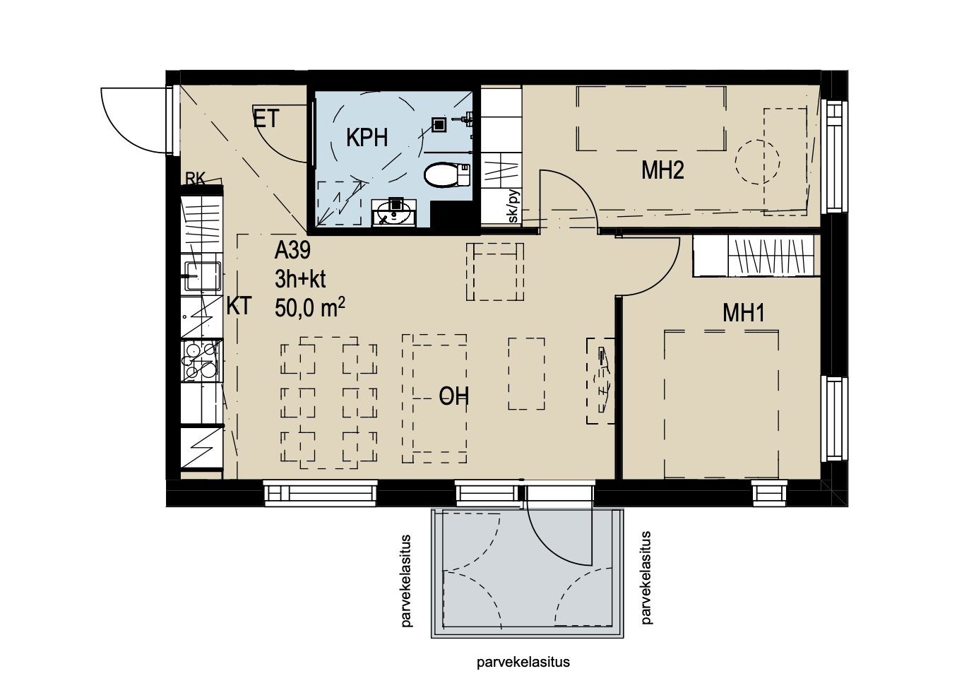 Huoneiston kokoonpano | 3h+avok+lasit.p |