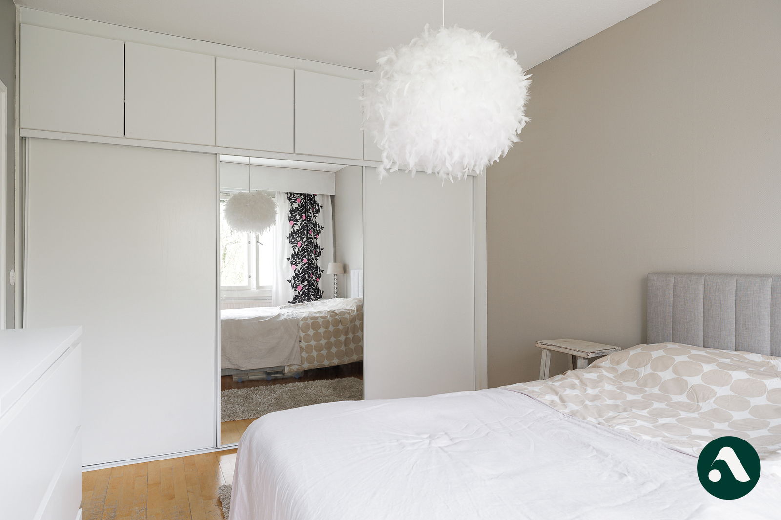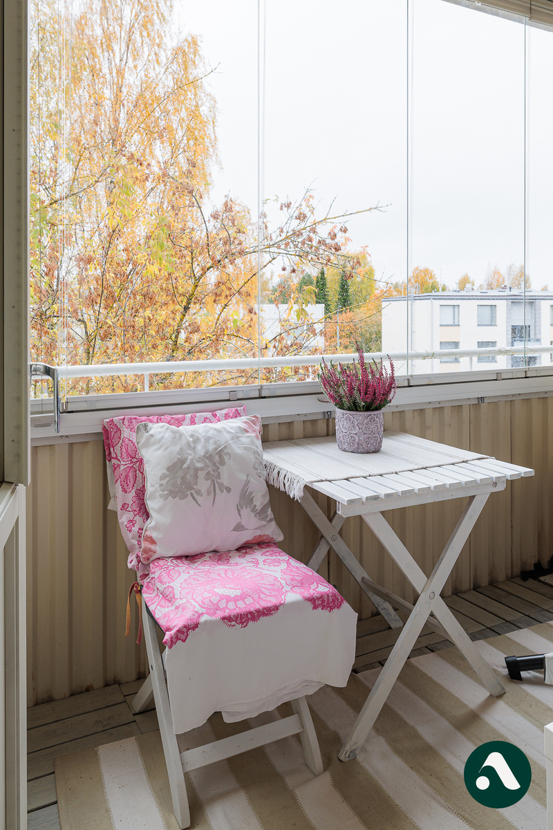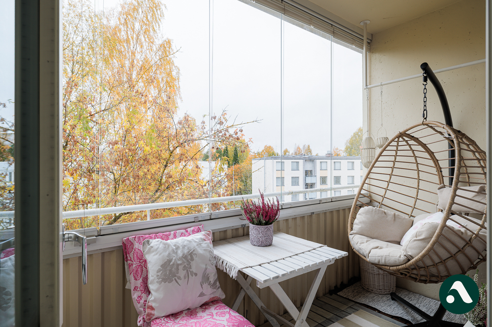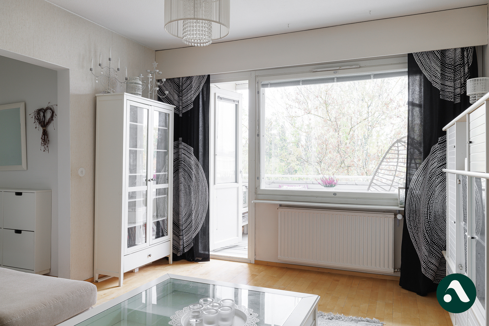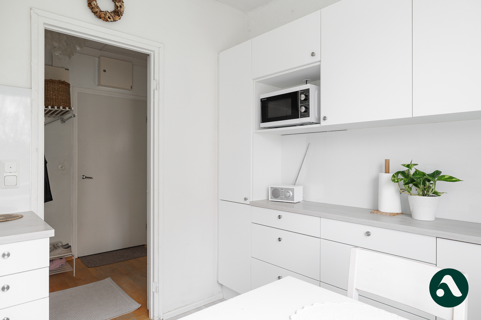 Ylimmän kerroksen kaunis koti tarjoaa toimivan pohjaratkaisun. Tyylikäs ja käytännöllinen keittiö on uusittu kokonaan, ja putkiremontin yhteydessä valmistunut kylpyhuone hurmaa modernilla ilmeellään. Olohuoneesta on käynti lasitetulle länsiparvekkeelle, josta avautuvat rauhalliset näkymät. Makuuhuoneessa on runsaasti säilytystilaa kaapistojen muodossa, ja huoneiston yleisilme on siisti ja viihtyisä.