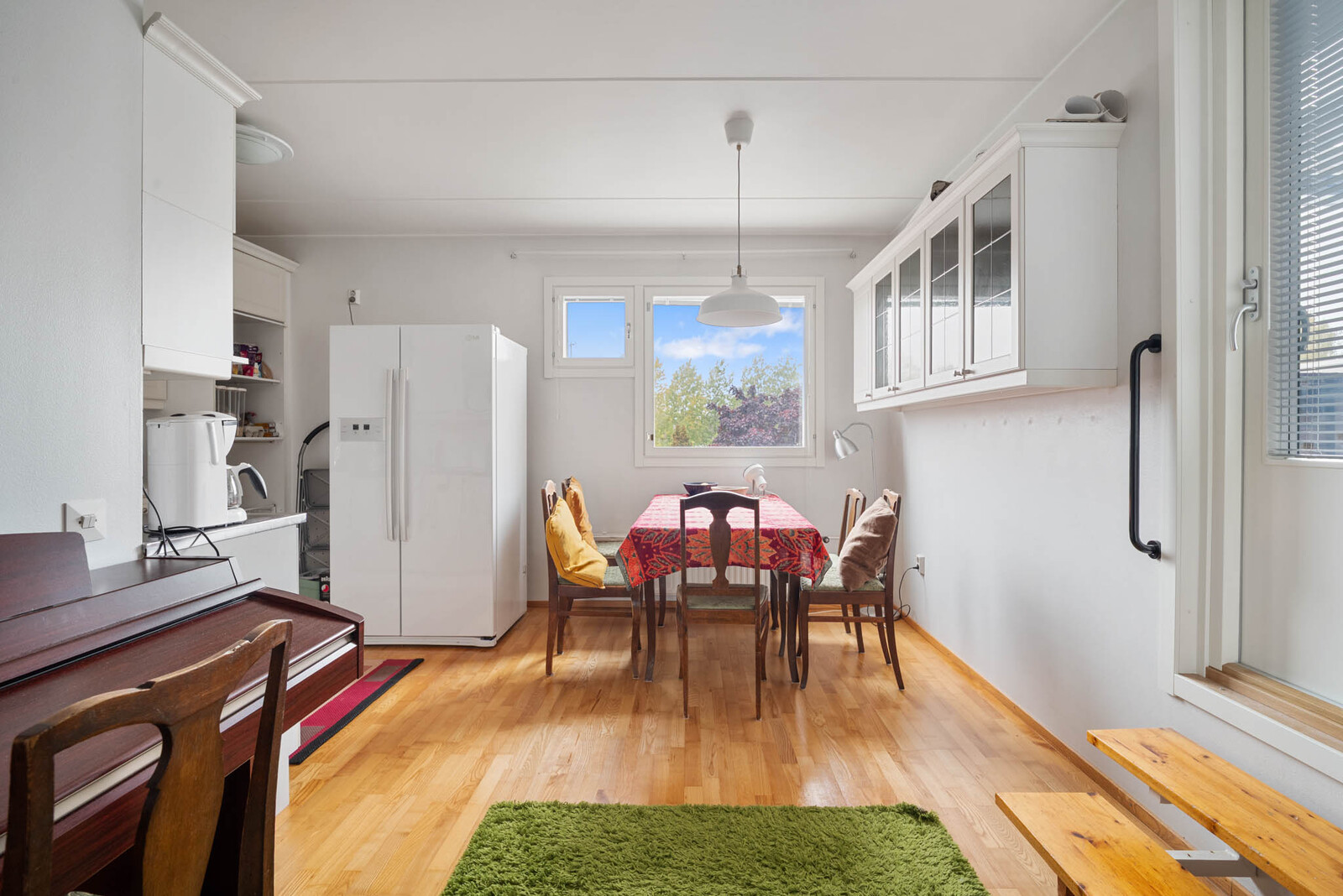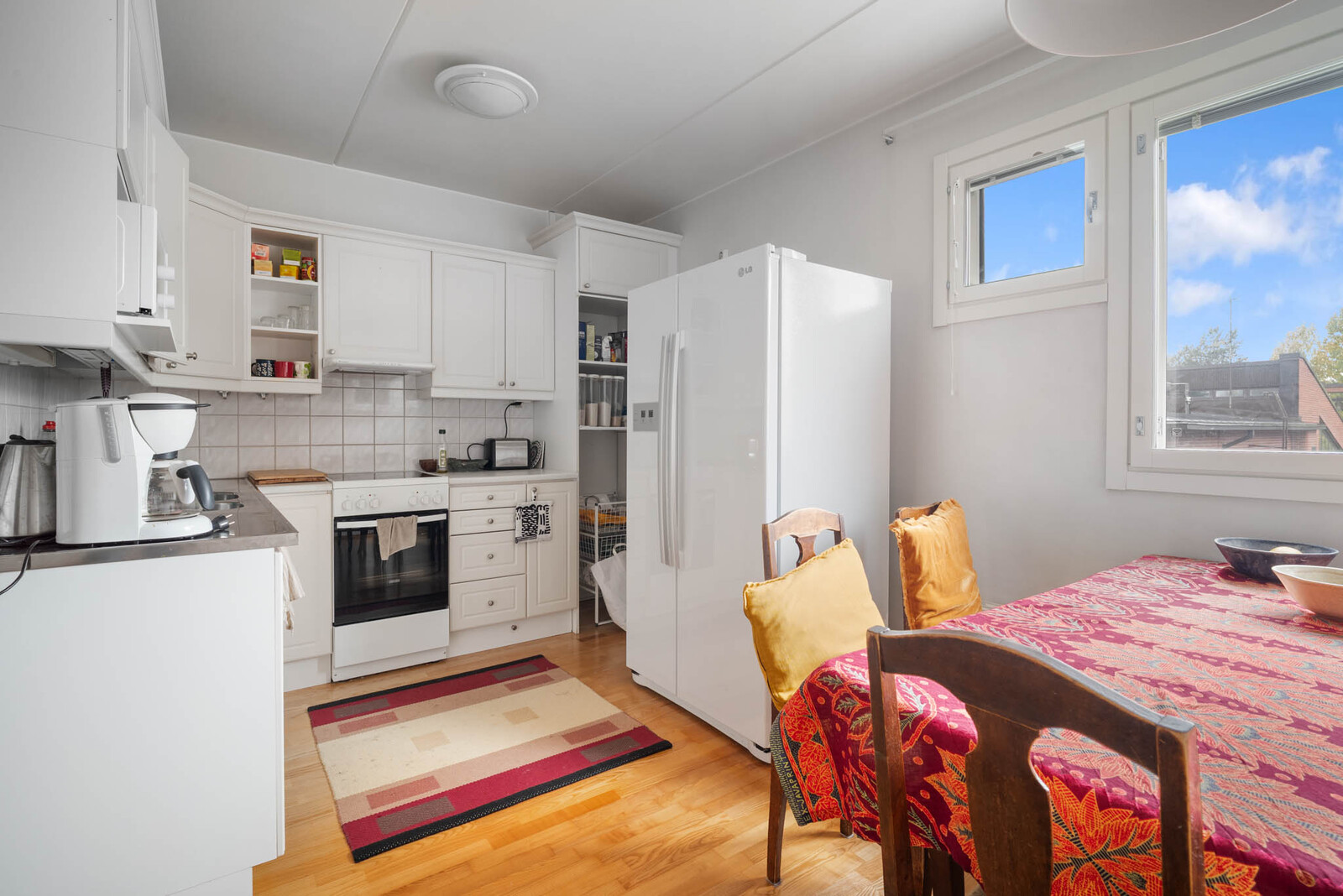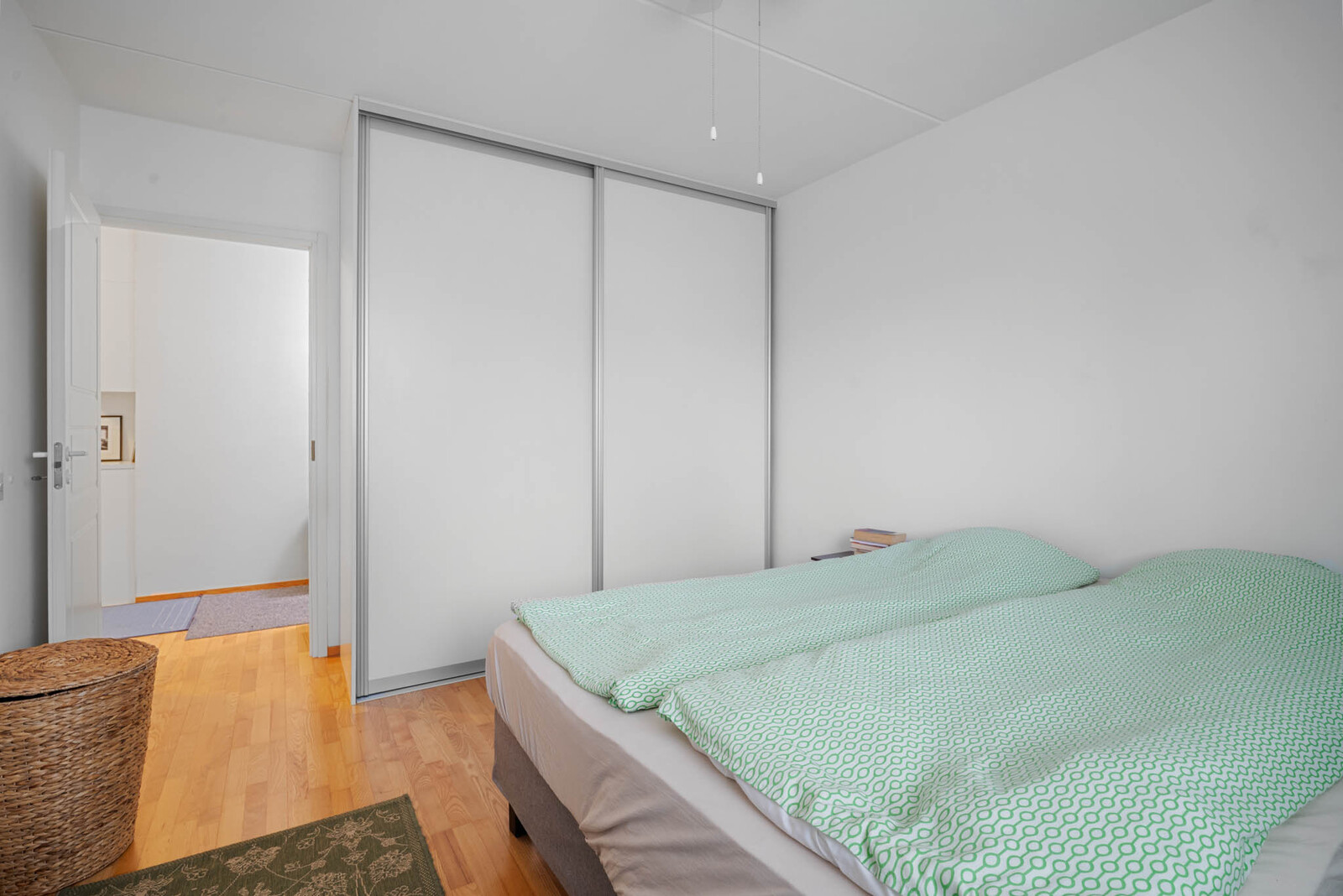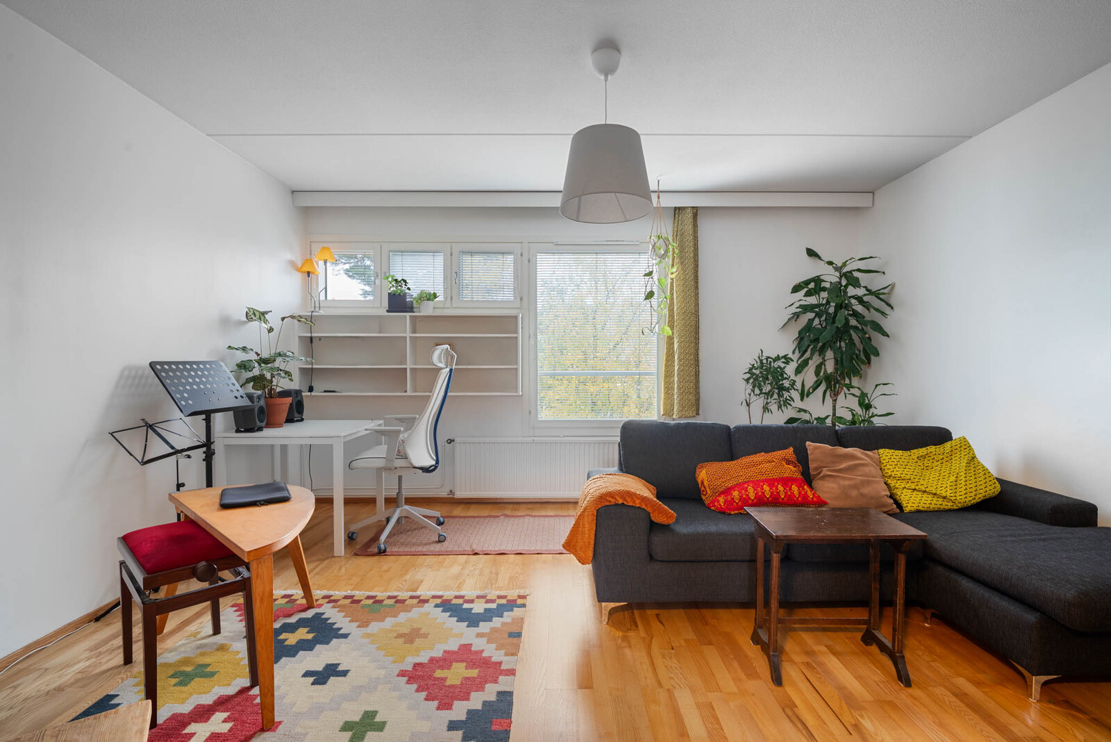 Pohjaratkaisu on hyvä ja huoneet tilavia. Olohuoneen saa kätevästi erotettua liukuovella omaksi rauhalliseksi tilakseen. Keittiössä riittää neliöitä niin kokkailuun kuin suuremmallekin ruokailuryhmälle. Arjen sujuvuuden takaavat tilava kylpyhuone sekä mainiot säilytystilat. Koti sijaitsee talon ylimmässä kerroksessa ja ikkunoista sekä lasitetulta parvekkeelta avautuu avarat näkymät.