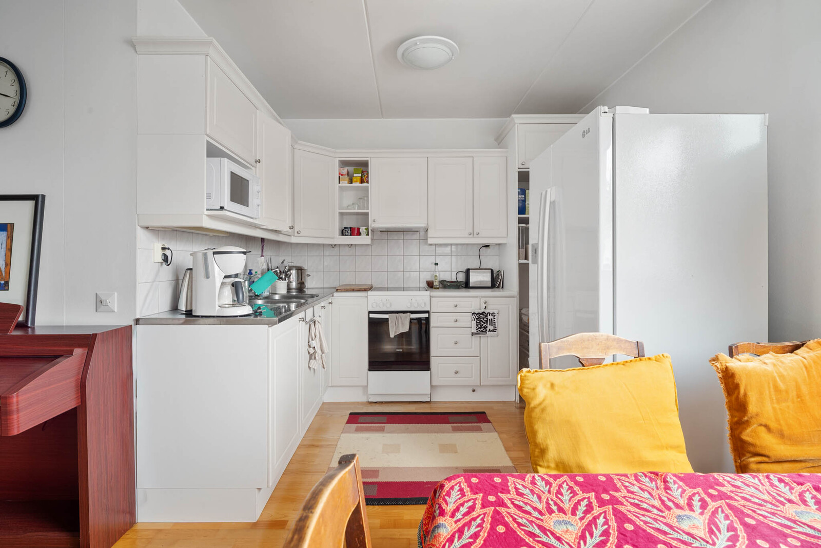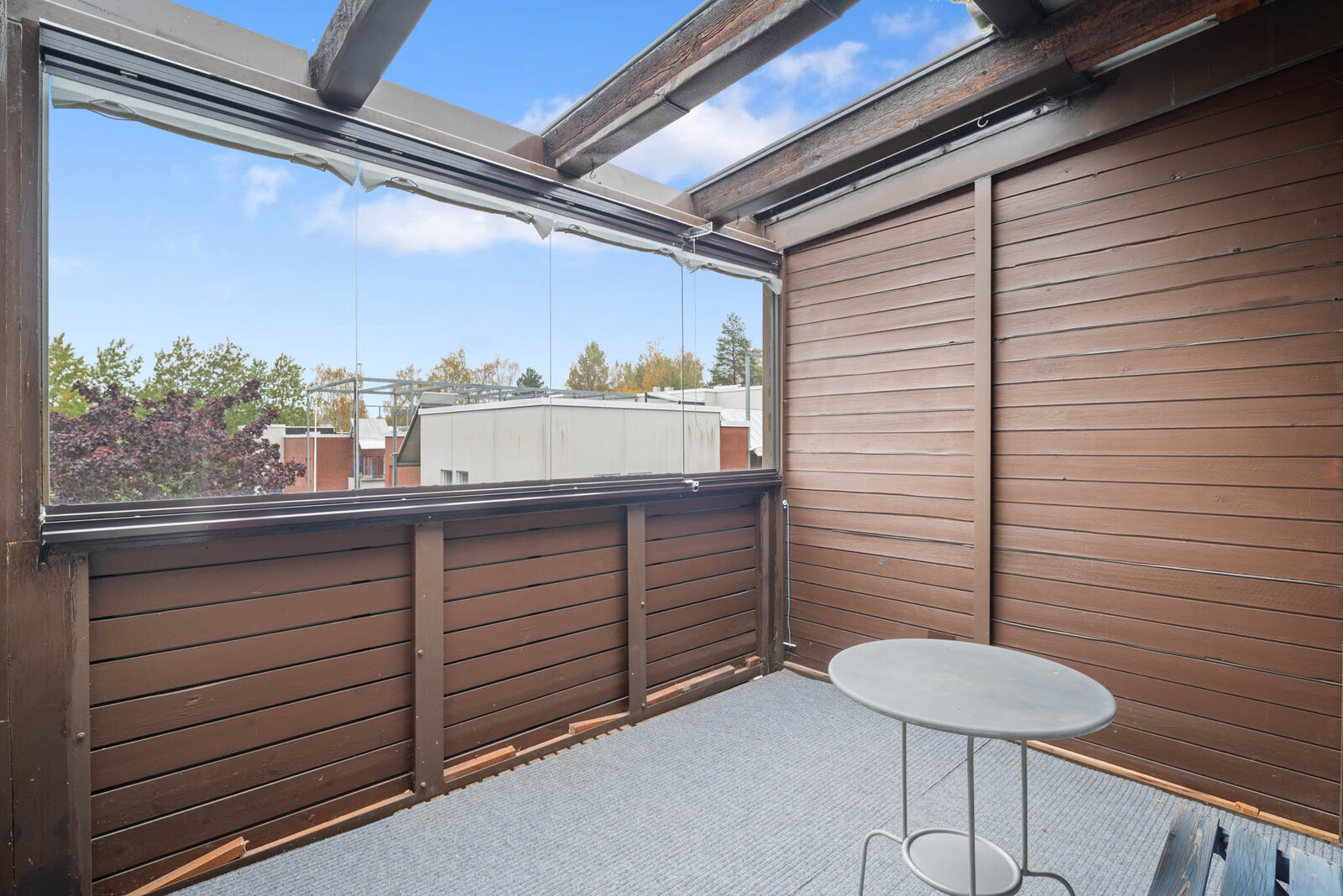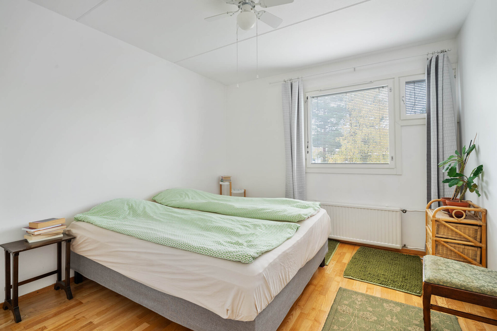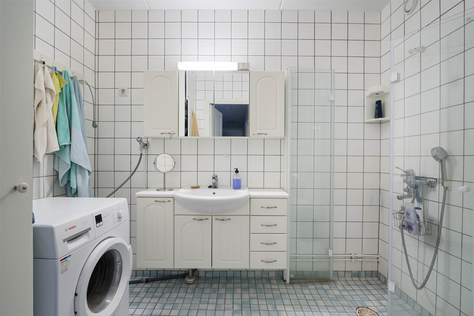 Pohjaratkaisu on hyvä ja huoneet tilavia. Olohuoneen saa kätevästi erotettua liukuovella omaksi rauhalliseksi tilakseen. Keittiössä riittää neliöitä niin kokkailuun kuin suuremmallekin ruokailuryhmälle. Arjen sujuvuuden takaavat tilava kylpyhuone sekä mainiot säilytystilat. Koti sijaitsee talon ylimmässä kerroksessa ja ikkunoista sekä lasitetulta parvekkeelta avautuu avarat näkymät.