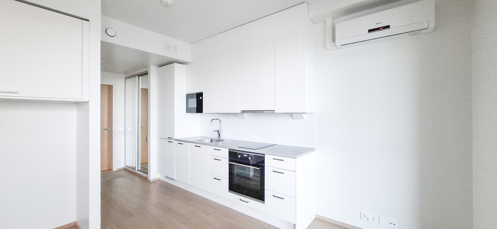 Modernin avokeittiön ilme on tyylikäs mustine kodinkoneineen ja vaaleine kaapistoineen. Hyvin varustellusta keittiöstä löytyy integroidut induktioliesi ja uuni, astianpesukone, sekä mikroaaltouuni. Tilava kylpyhuone on hyvin varusteltu ja sieltä löytyy muun muassa pesukoneliitäntä ja sopiva paikka koneelle/pesutornille. Kylpyhuoneeseen on asennettu lattialämmitys asumismukavuutta lisäämään. Eteisessä on suuri lattiaista kattoon ulottuva peililiukuovikaapisto ja alkovissa on seinään kiinnitetyt kaapistot, joiden alle mahtuu vaikka sänky tai sohva.