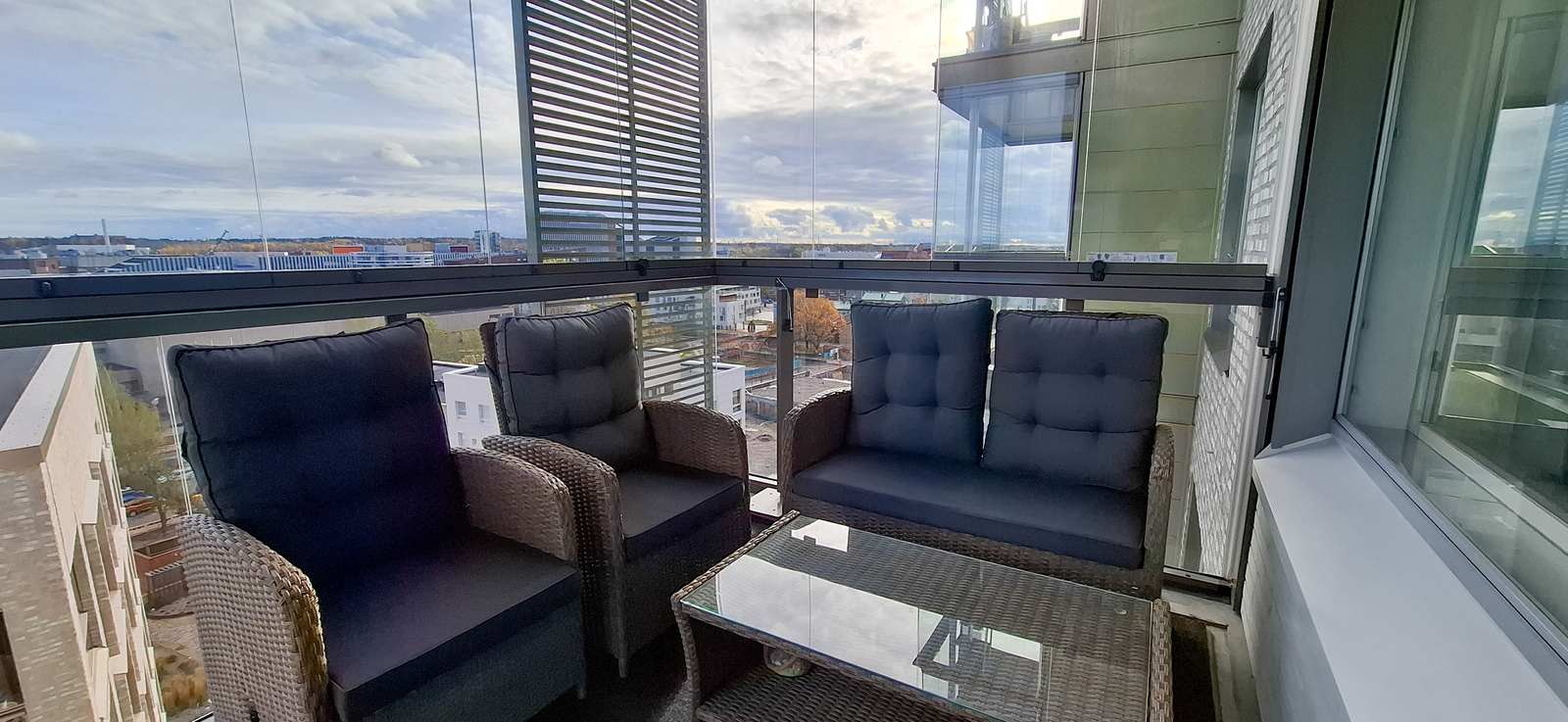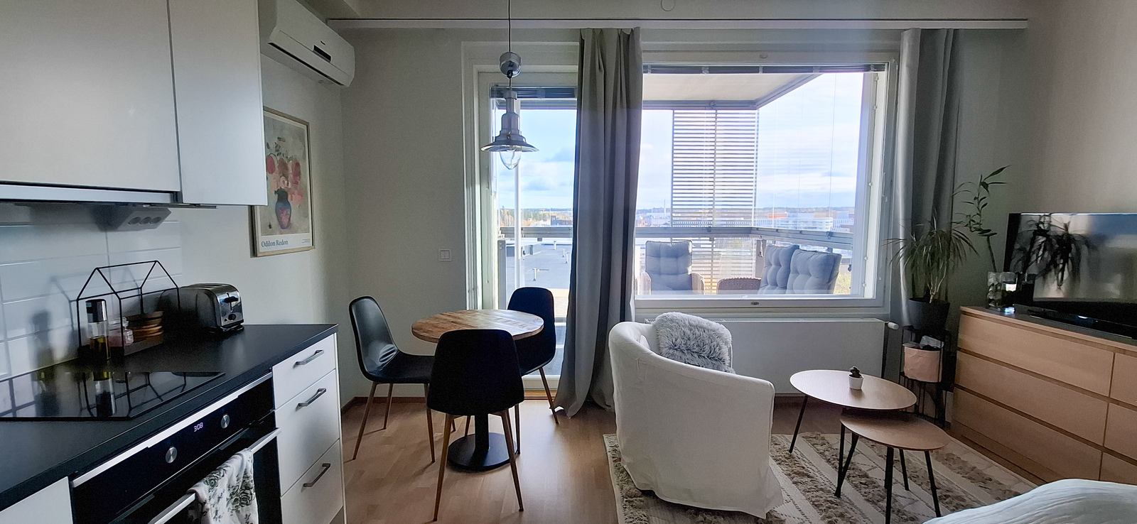 Kymmenennen kerroksen yksiö lasitetulla parvekkeella ja viilennyslaitteella, loistavalla sijainnilla Tikkurilasta.