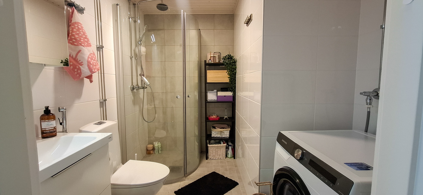 Modernin avokeittiön ilme on tyylikäs mustine kodinkoneineen ja vaaleine kaapistoineen. Hyvin varustellusta keittiöstä löytyy integroidut induktioliesi ja uuni, astianpesukone, sekä mikroaaltouuni. Tilava kylpyhuone on hyvin varusteltu ja sieltä löytyy muun muassa pesukoneliitäntä ja sopiva paikka koneelle/pesutornille. Kylpyhuoneeseen on asennettu lattialämmitys asumismukavuutta lisäämään. Eteisessä on suuri lattiaista kattoon ulottuva peililiukuovikaapisto ja alkovissa on seinään kiinnitetyt kaapistot, joiden alle mahtuu vaikka sänky tai sohva.