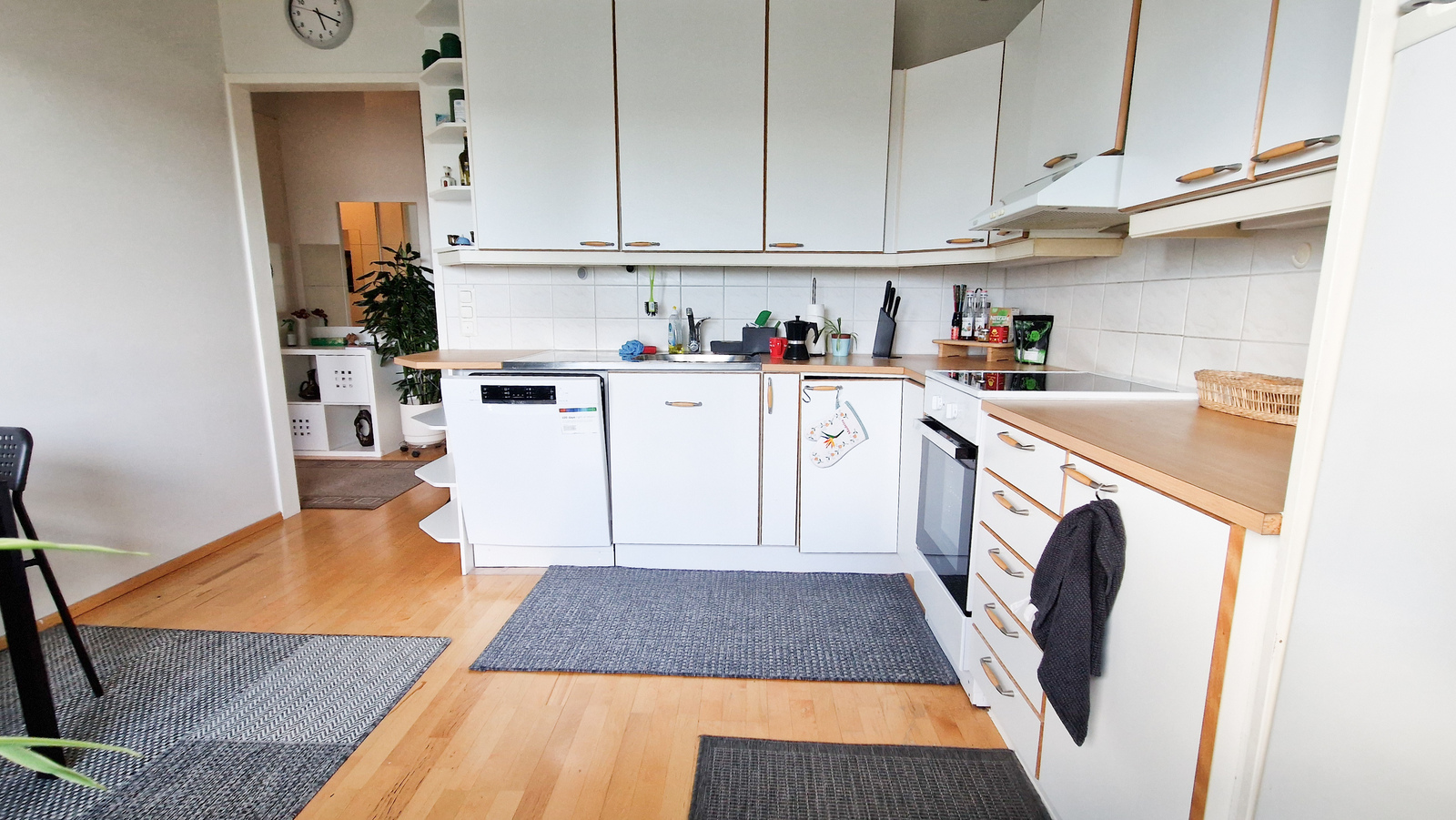 Erillinen keittiö tarjoaa runsaasti tilaa sekä ruoanlaittoon että ruokailuun. Avara olohuone mukautuu monenlaisiin tarpeisiin – sinne mahtuu suurempikin sohvaryhmä, ja tilaa jää hyvin myös esimerkiksi etätyöpisteelle. Oleskelutilat jatkuvat luontevasti suojaisalle, lasitetulle parvekkeelle, joka tarjoaa viihtyisän lisähuoneen keväästä syksyyn. Myös makuuhuoneessa on reilusti tilaa ja avaruutta, mikä tekee siitä miellyttävän rauhallisen levähdyspaikan.