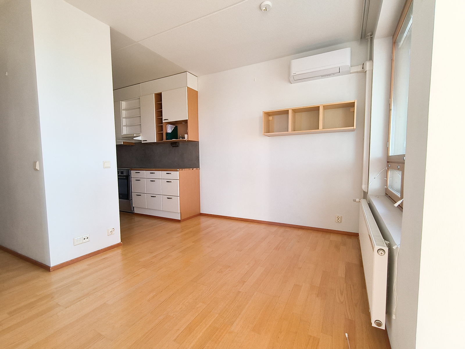 Asunnolla on viilentävä ilmalämpöpumppu, joten kesähelteillä viileät yöunet on taattu.