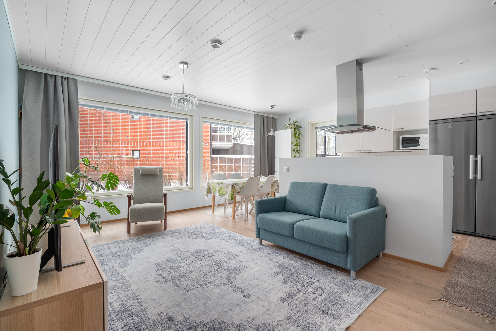Viihtyisä avara olohuone yhdistettynä saarekkeelliseen avokeittiöön mahdollistaa mukavan yhdessäolon. Toimiva eteinen ja sen yhteydessä oleva suihku, sekä tilavat kodinhoitotilat helpottavat arjen sujuvuutta.