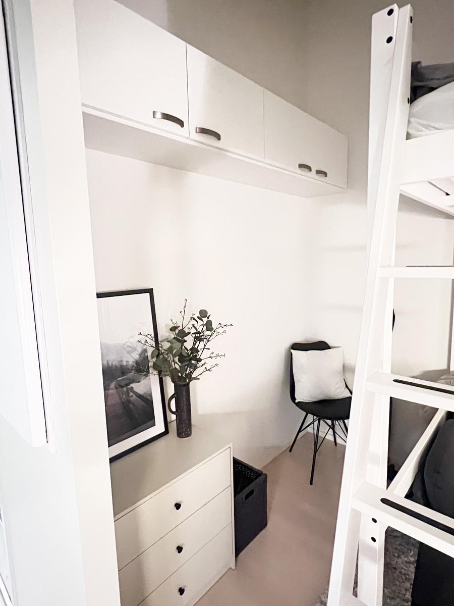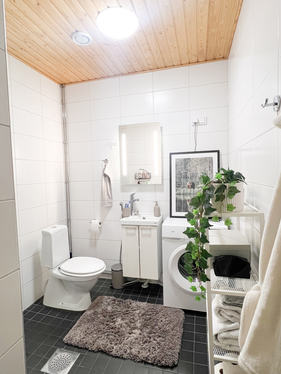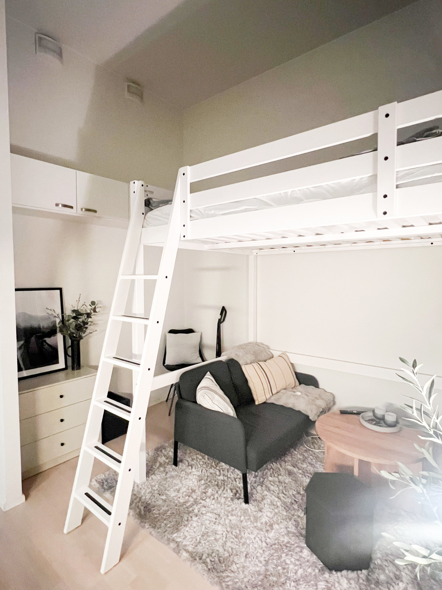 Asunnossa on laadukkaat laminaattilattiat, vaaleat pinnat ja keittiöstä löytyy arkea sujuvoittamaan astianpesukone, liesitaso, erillisuuni sekä jääkaappi pakastinlokerolla. Kylpyhuoneessa on luonnollisesti liitäntä pyykinpesukoneelle ja omalla isolla parvekkeela viihtyy aikaisesta keväästä pitkälle syksyyn. Asunnossa on poikkeuksellisen korkea huonekorkeus ja kuten kuvista näkyy, saa tilan hyödynnettyä erittäin tehokkaasti ja kätevästi parvisängyllä. :)
