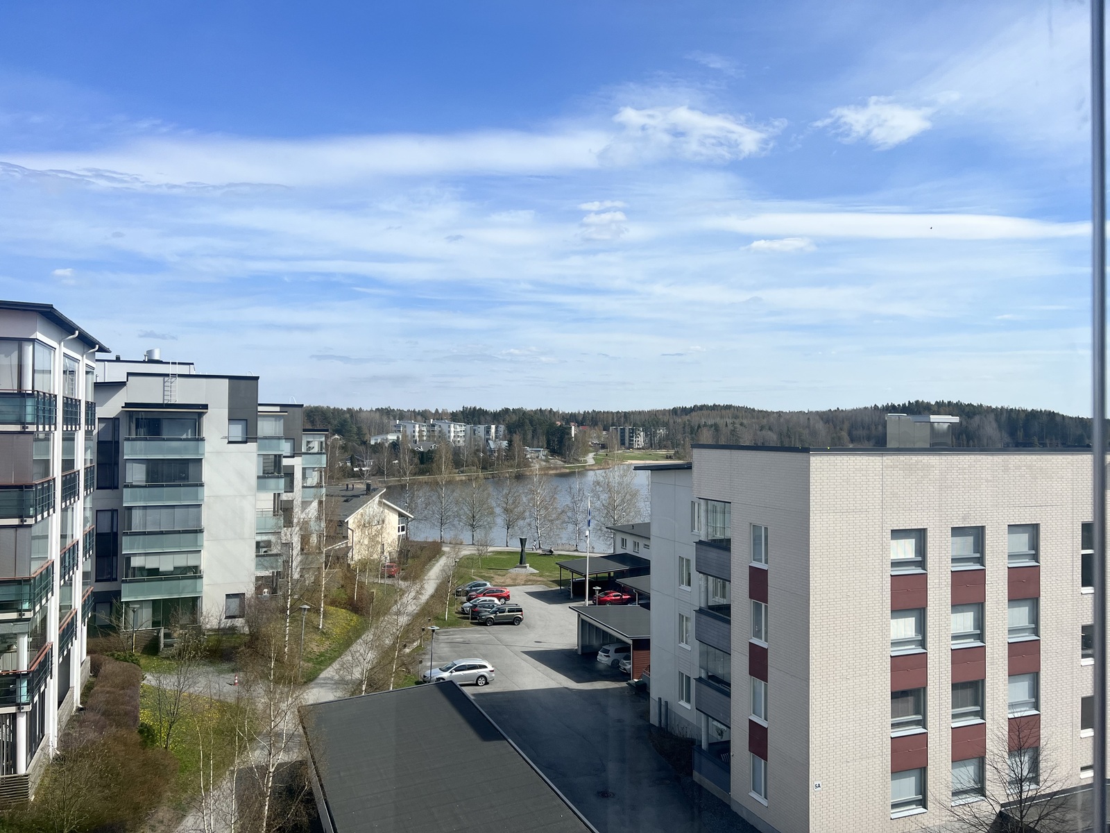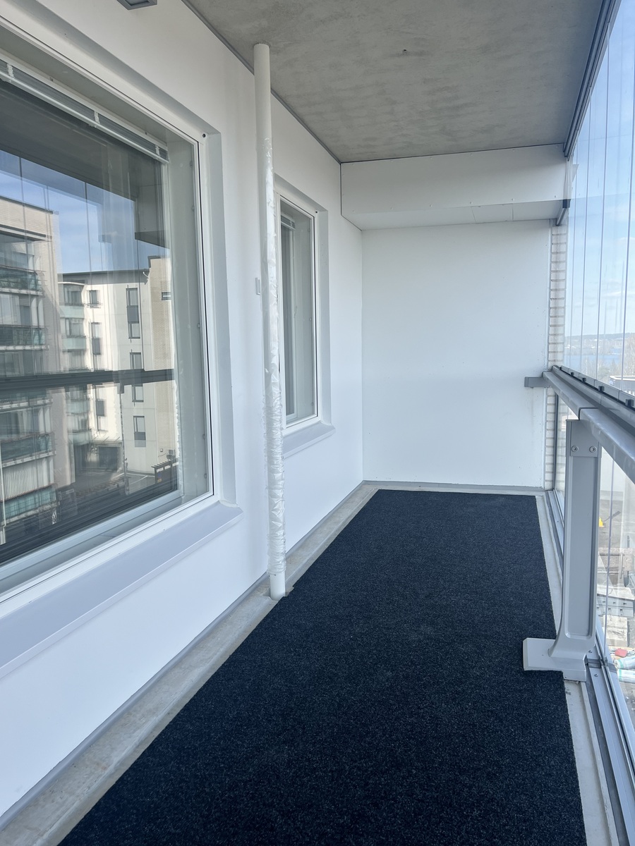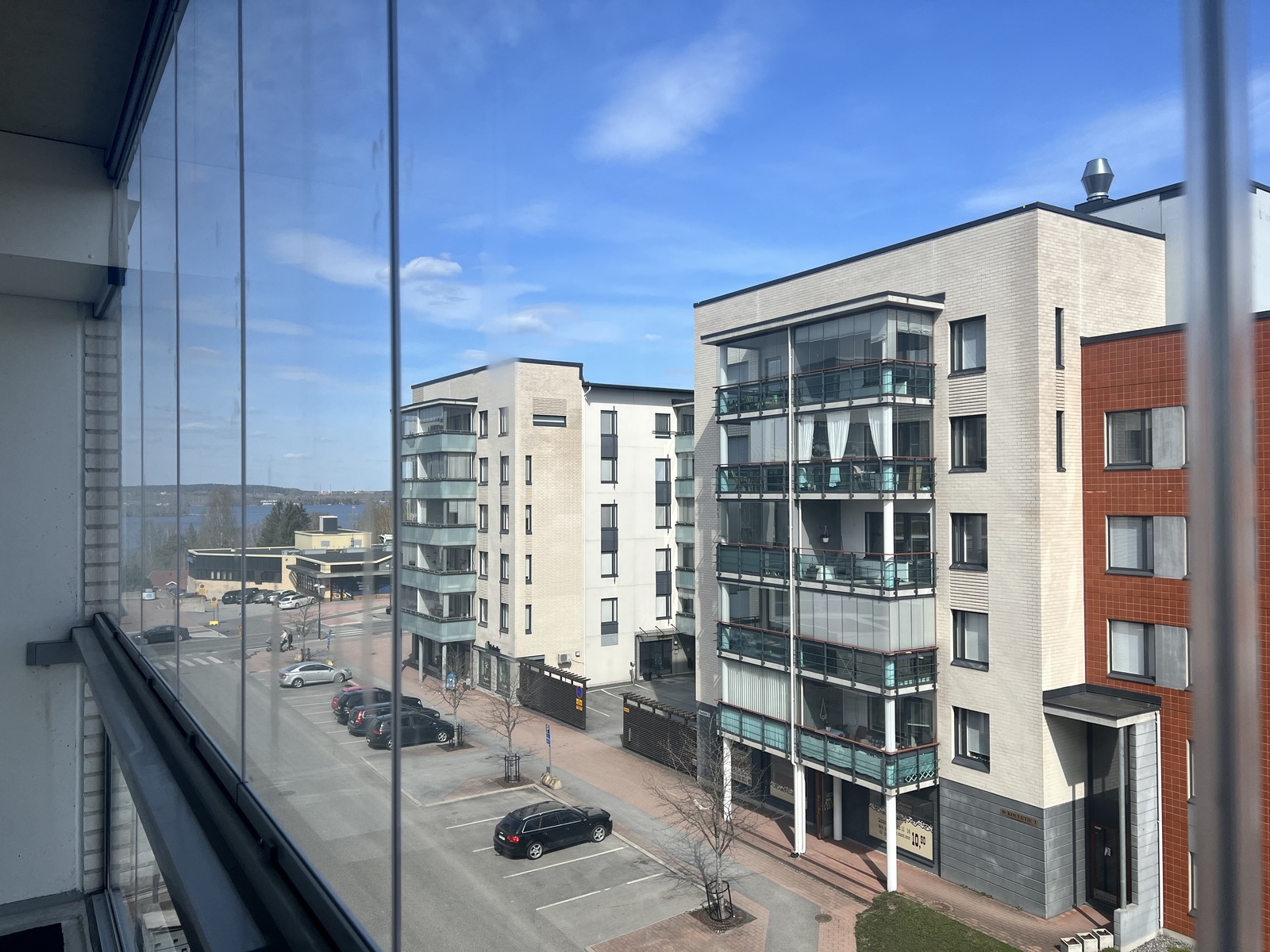 Tässä asunnossa on olohuoneessa matalalle ulottuvat ikkunat, mikä tekee asunnosta kauniin valoisan. Olohuoneesta on käynti hulppealle, koko asunnon levyiselle lasitetulle parvekkeelle ja maisemat avautuvat Vähäjärven suuntaan. Oleskelutilojen lattiana on kaunis ja kestävä vinyylikorkki ja keittiön työpöydän tasona trendikäs musta, marmorimaisesti kuvioitu taso. Eteisessä on tyylikkäät peili-liukuovet, jotka lisäävät valoisuuden tuntua entisestään. Pesuhuoneessa on luonnollisesti paikka pyykinpesukoneelle.