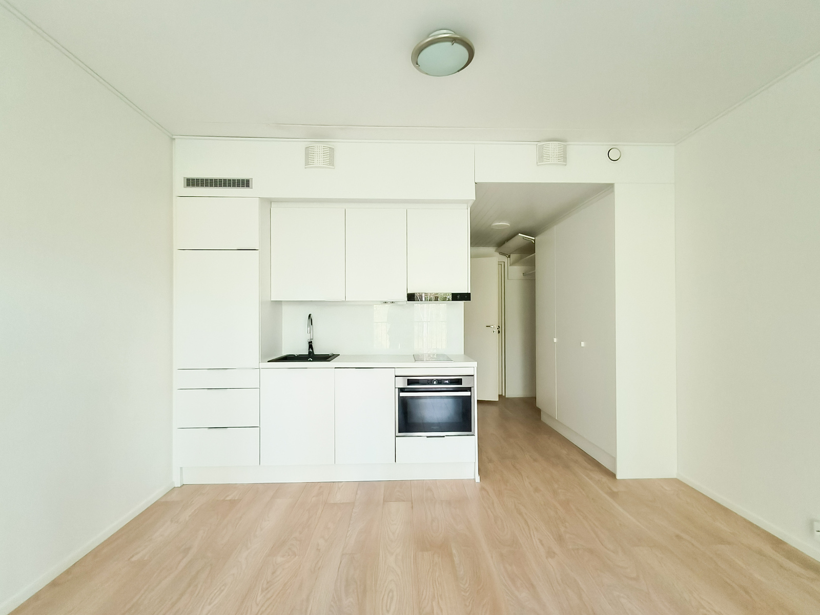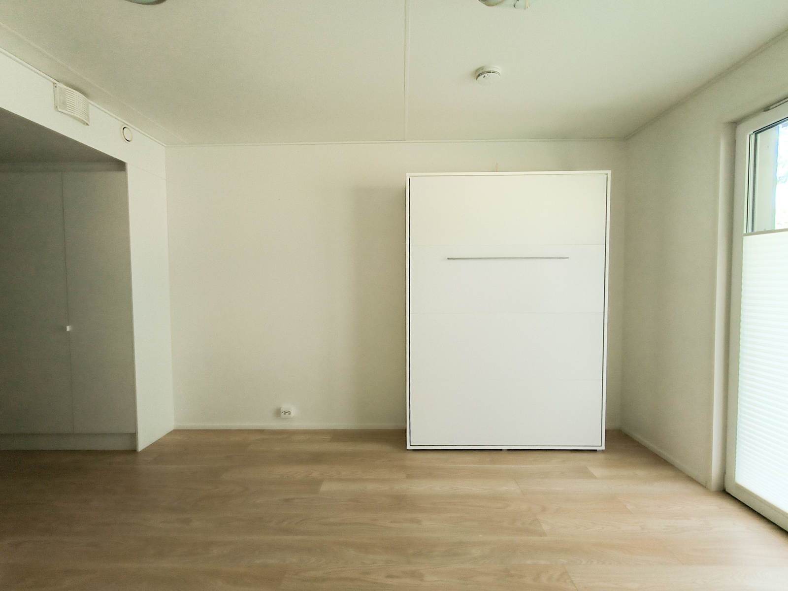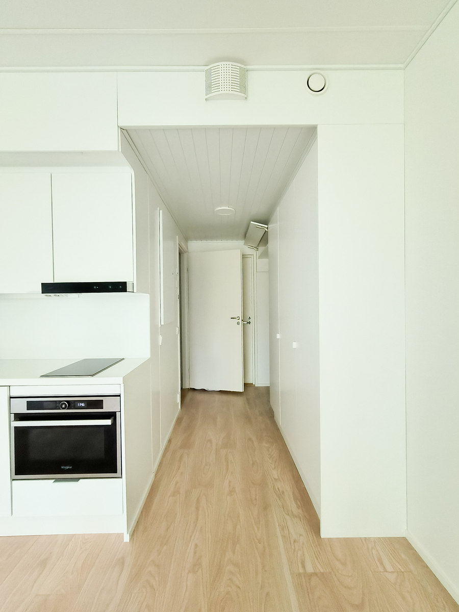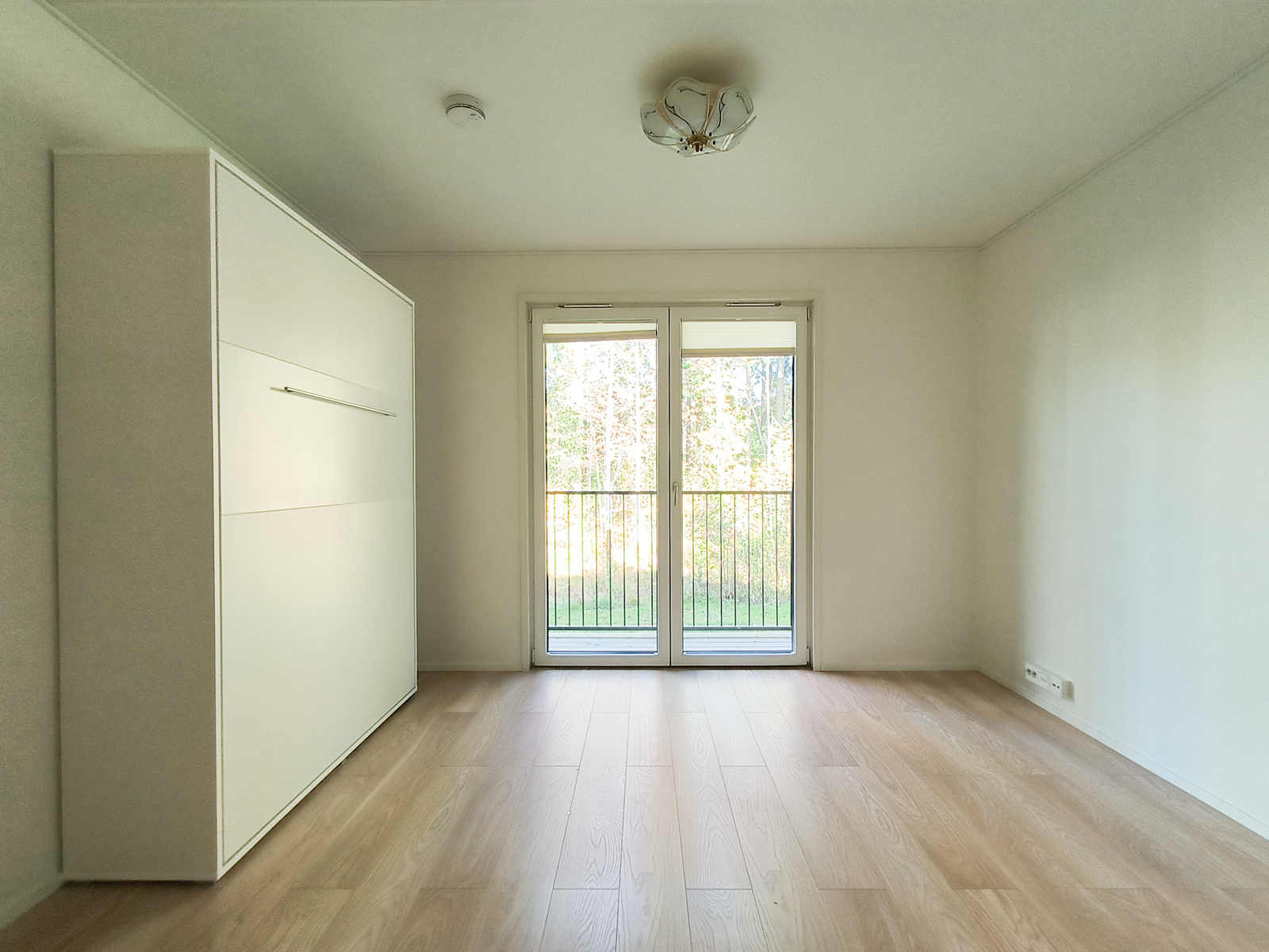 Tämän kodin pohjaratkaisu on toimiva ja helposti kalustettavissa. Asunnolla on valmiina seinäsänky 160cm, jonka vuokralainen voi ottaa käyttöönsä omilla patjoilla. Avokeittiöstä löytyy hyvin kaappitilaa ja astianpesukone helpottamaan arkea. Kylpyhuone on tilava ja edestä täytettävälle pyykinpesukoneelle on oma paikkansa laskutason alla. Asunnon näkymät ovat metsän suuntaan vehrein ja rauhallisin näkymin. Oleskelutilojen lattiat ovat vaalean puunsävyistä laminaattia ja seinät raikkaan valkoiset. Eteisen yhteydessä on ulkovaatteille pitkä tanko ja useampi vaatekaappi säilytykseen.