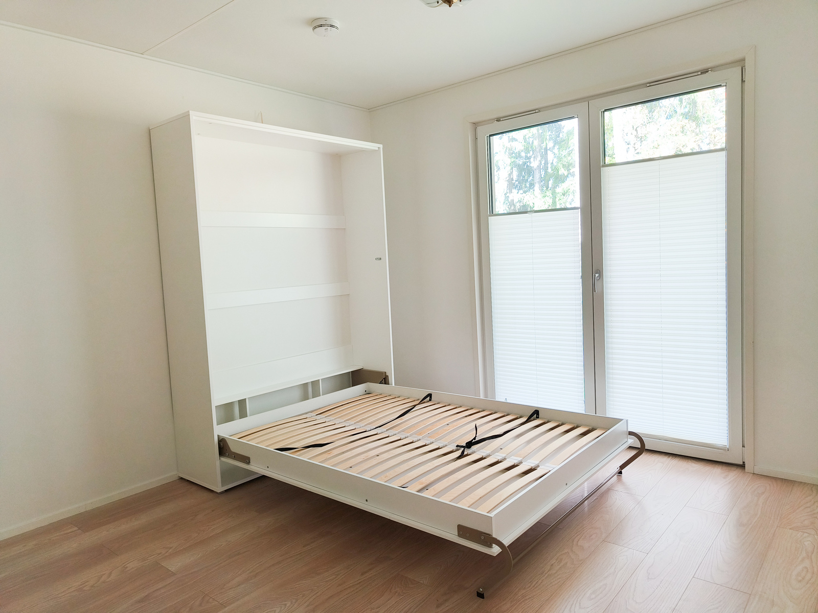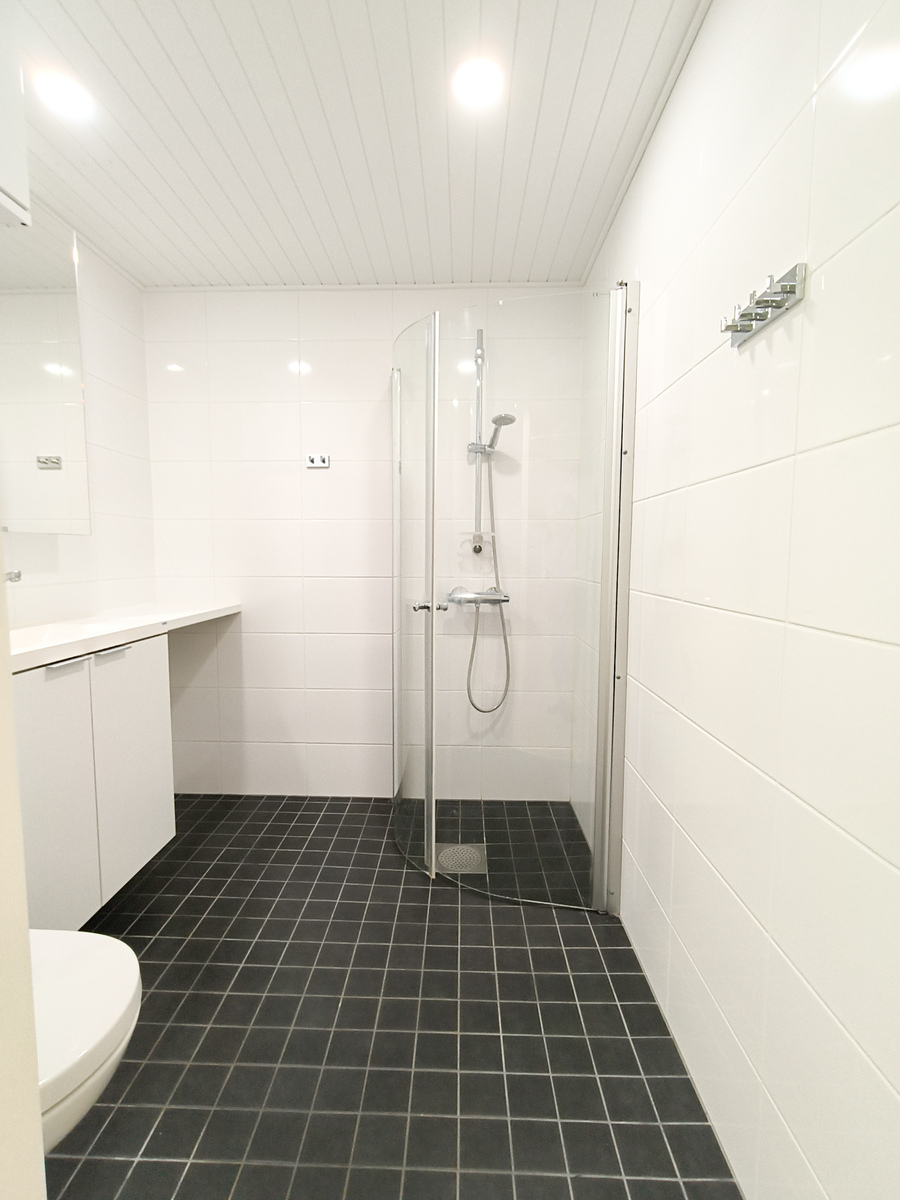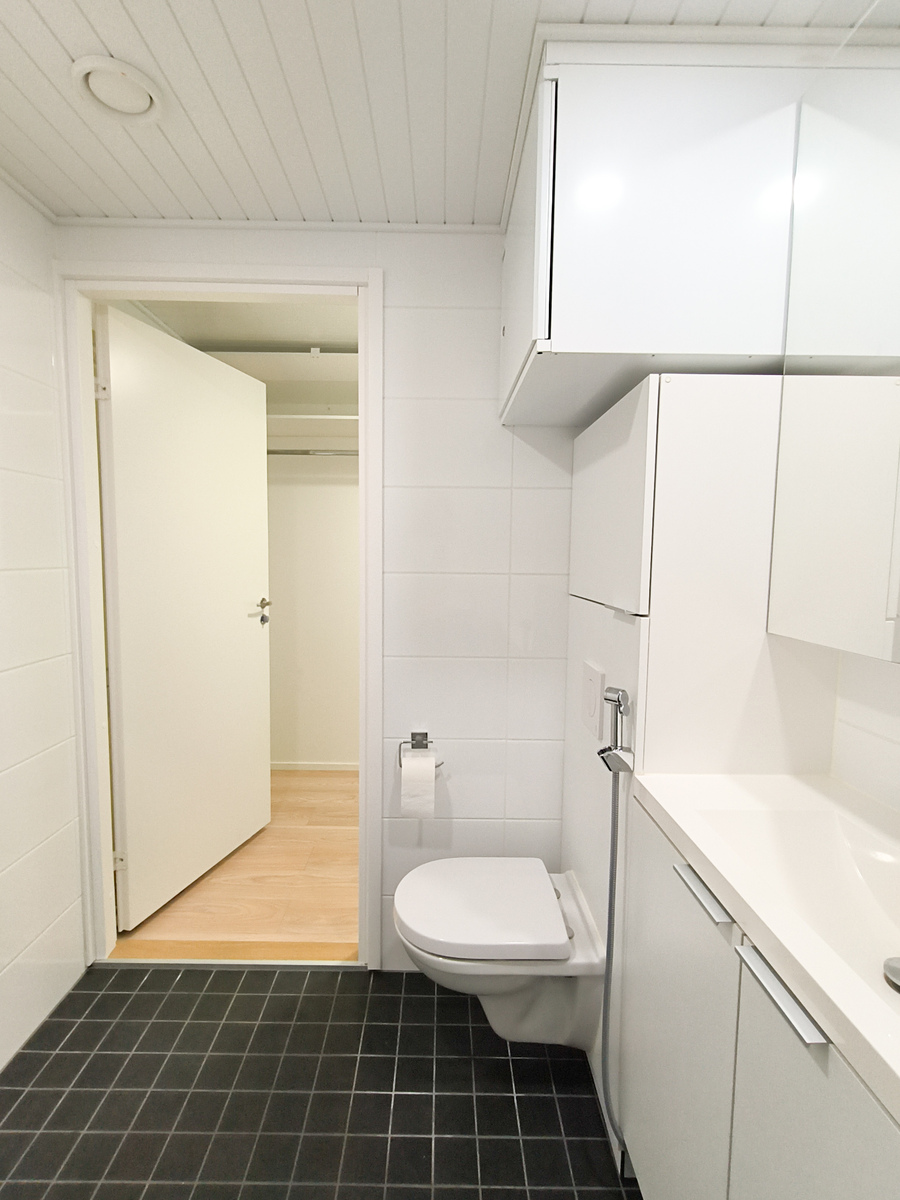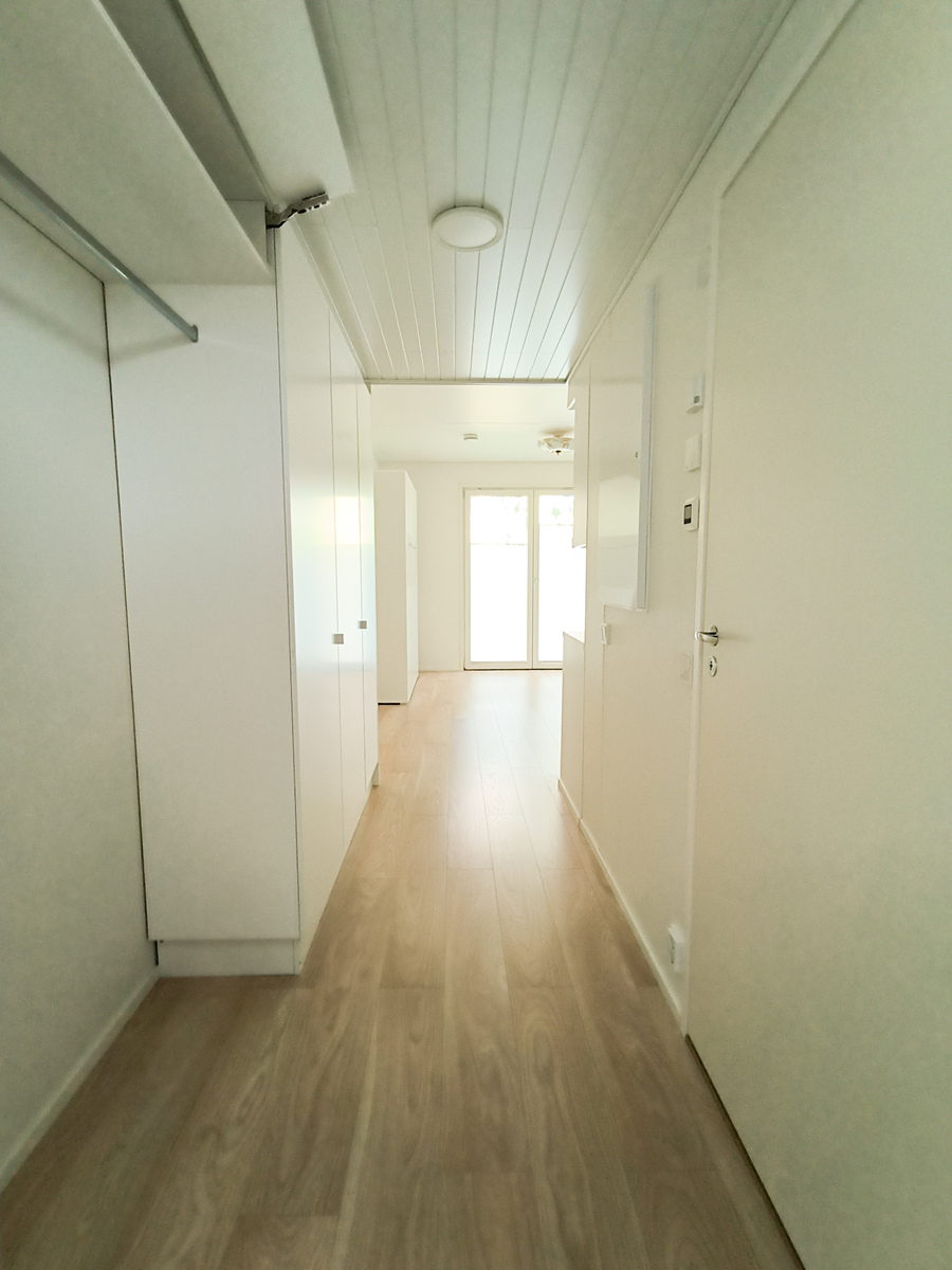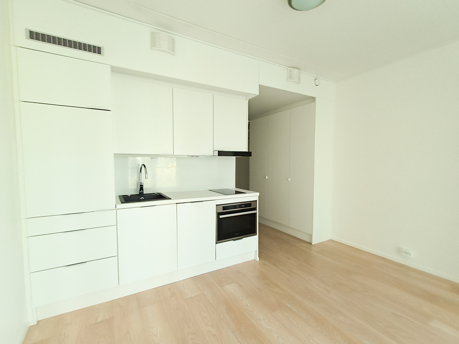 Tämän kodin pohjaratkaisu on toimiva ja helposti kalustettavissa. Asunnolla on valmiina seinäsänky 160cm, jonka vuokralainen voi ottaa käyttöönsä omilla patjoilla. Avokeittiöstä löytyy hyvin kaappitilaa ja astianpesukone helpottamaan arkea. Kylpyhuone on tilava ja edestä täytettävälle pyykinpesukoneelle on oma paikkansa laskutason alla. Asunnon näkymät ovat metsän suuntaan vehrein ja rauhallisin näkymin. Oleskelutilojen lattiat ovat vaalean puunsävyistä laminaattia ja seinät raikkaan valkoiset. Eteisen yhteydessä on ulkovaatteille pitkä tanko ja useampi vaatekaappi säilytykseen.