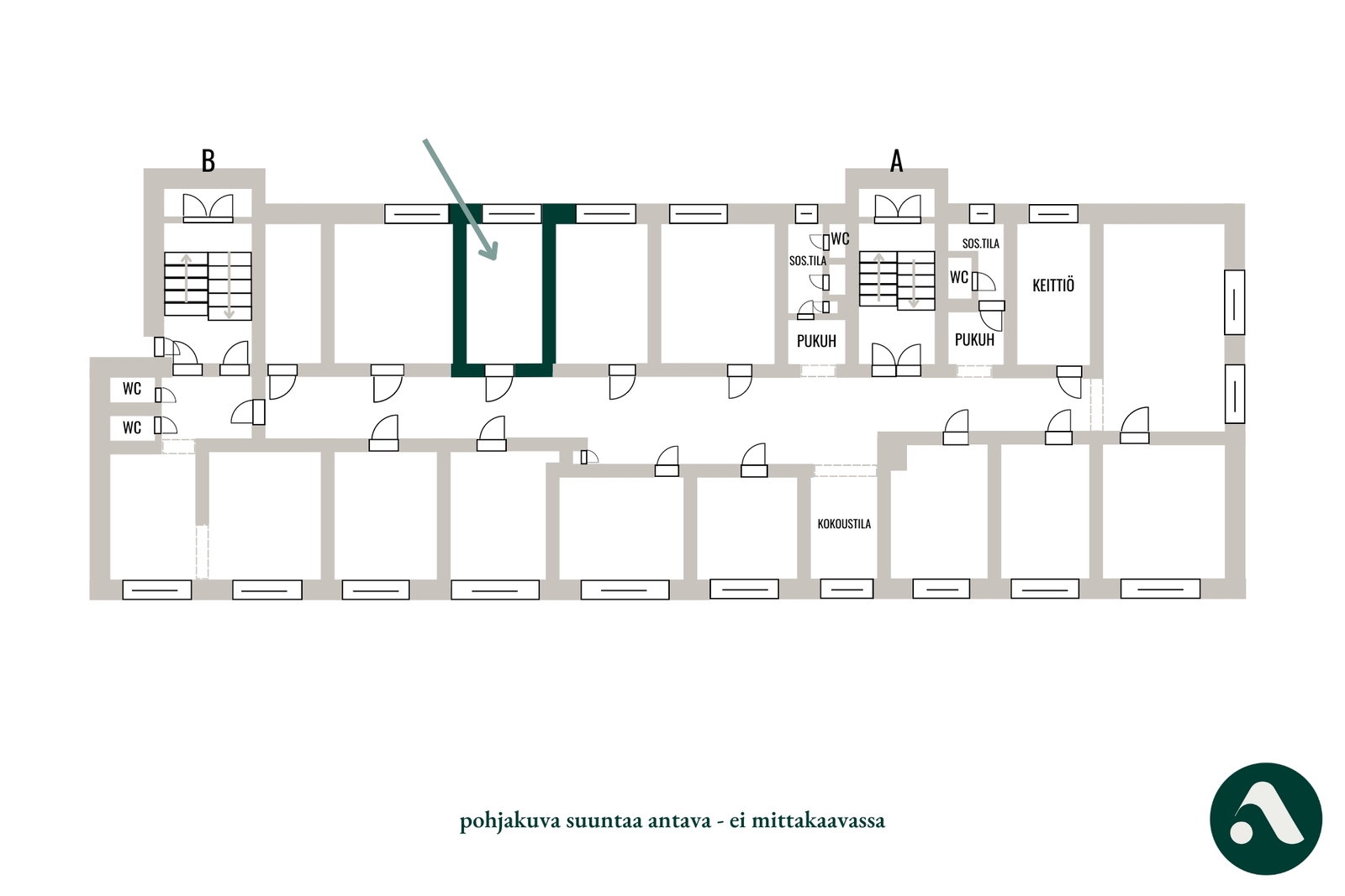 Vuokrattava huone (LT 11) on osa useamman liikehuoneen kokonaisuutta. Oman huoneen lisäksi sinulla onkin käytettävissä neuvotteluhuone, yhteiset keittiötilat sekä wc- ja pesutilat. Yhteisen käytävän varrella on pieni odotuspiste mahdollisille asiakkaille. Vuokraan sisältyvät tehokas netti, vesi ja yhteisten tilojen siivous. Vuokra on 280€ + sähkö 20 €/kk.