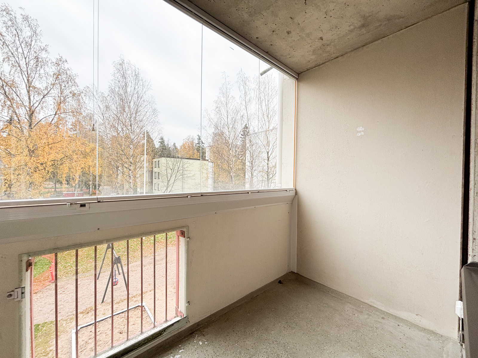 Asunnossa on tehokkaasti suunniteltu pohjaratkaisu, joka tekee neliöistä toimivat ja helposti kalustettavat. Erillinen keittiö tarjoaa hyvin tilaa ruuanlaittoon. Sängylle on paikka alkovissa ja huoneeseen sijoitat esimerkiksi sohvan ja tv-tason. Eteisen kaapistoissa on hyvin säilytystilaa.  Lasitettu parveke tarjoaa mukavan lisätilan arkeen – siellä voi nauttia aamukahvit tai viettää rentouttavia iltoja pitkälle syksyyn. Kylpyhuone on juuri uusittu ja siellä on liitäntä pesukoneelle.