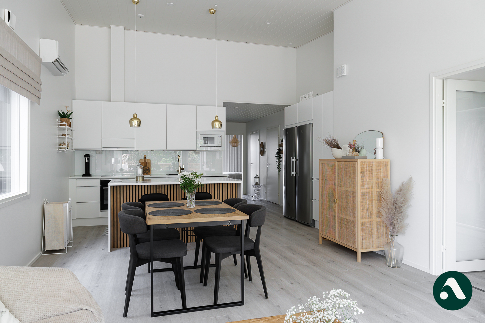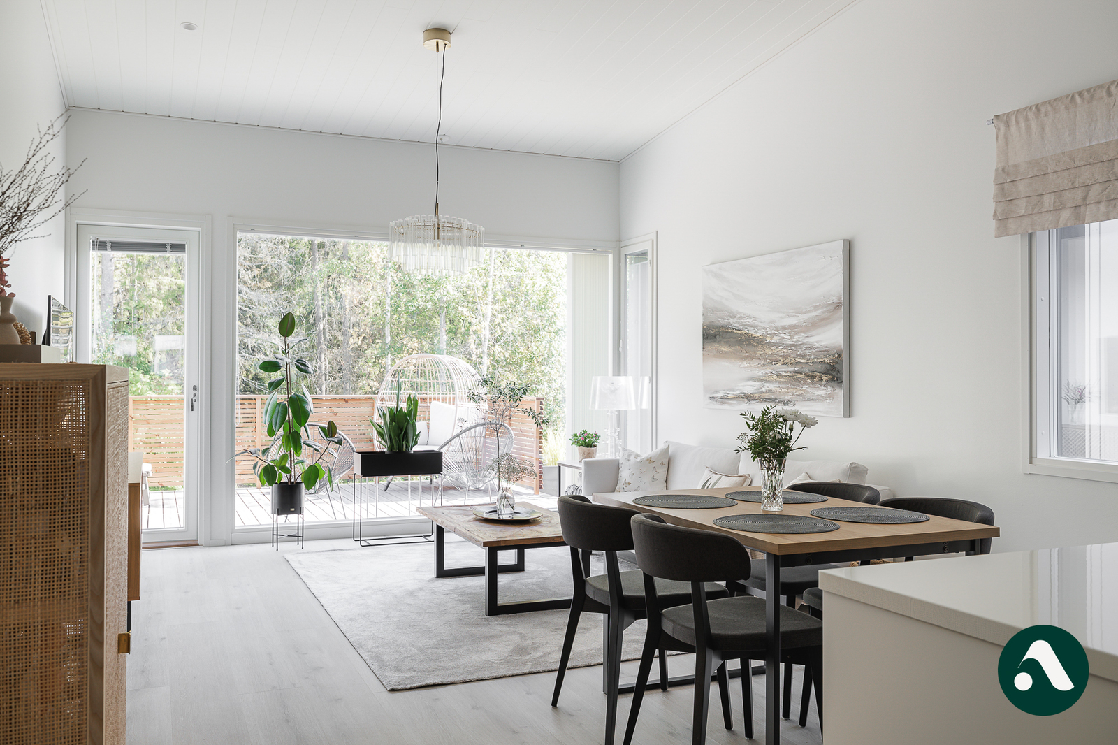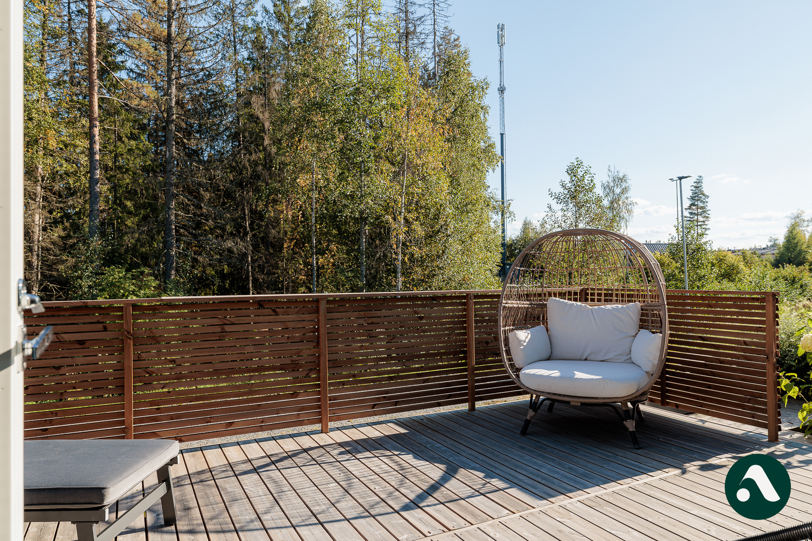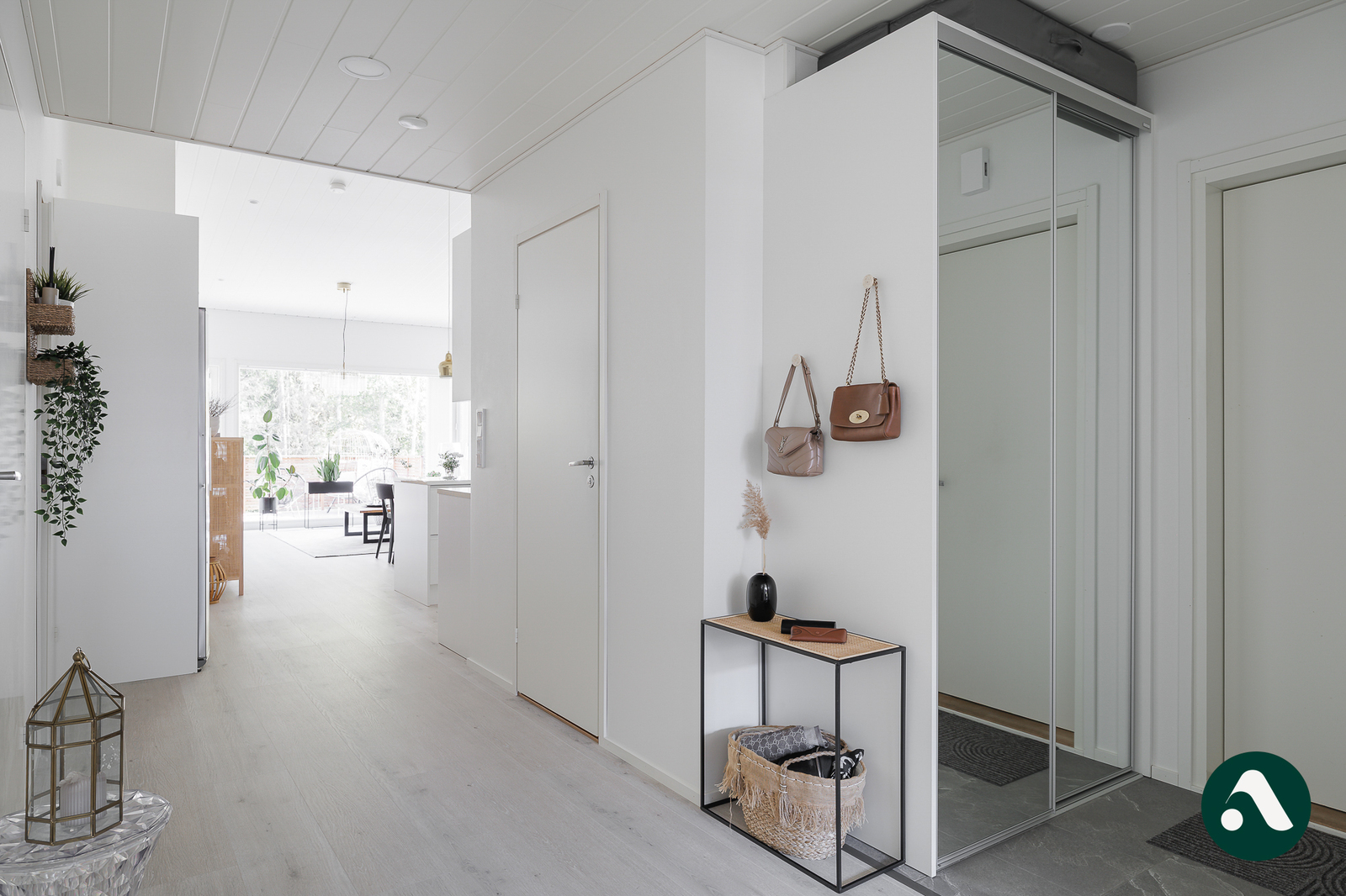 Tässä vuonna 2021 valmistuneessa kodissa on jo rakennusvaiheessa tehty runsaasti tasokorotuksia, jotka tekevät arjesta erityisen viihtyisää. Takapihan terassia on laajennettu, lattiat on viimeistelty tyylikkäällä ja kestävällä vinyylikorkilla, ja kodin varusteluun kuuluu muun muassa ilmalämpöpumppu, aamiaiskaappi sekä vesipiste kodinhoitohuoneessa. Lisäksi löytyy laatoitettu erillis-wc ja monia muita laadukkaita yksityiskohtia. Erinomainen pohjaratkaisu, poikkeuksellisen korkea huonekorkeus ja suuret ikkunat tuovat asuntoon runsaasti valoa ja avaruutta – ikkunoista avautuvat myös upeat metsämaisemat. Talo on erinomaisesti pidetty ja käytännössä uutta vastaavassa kunnossa.