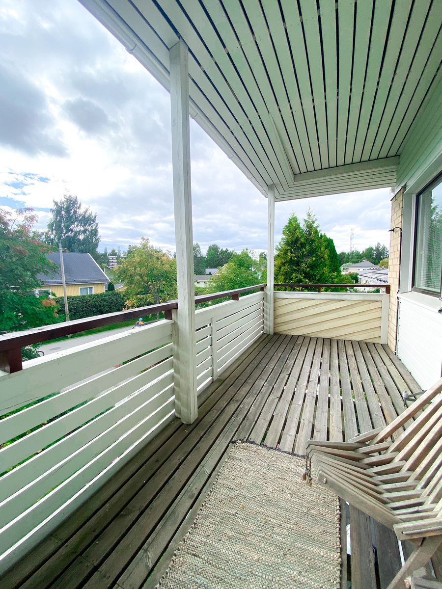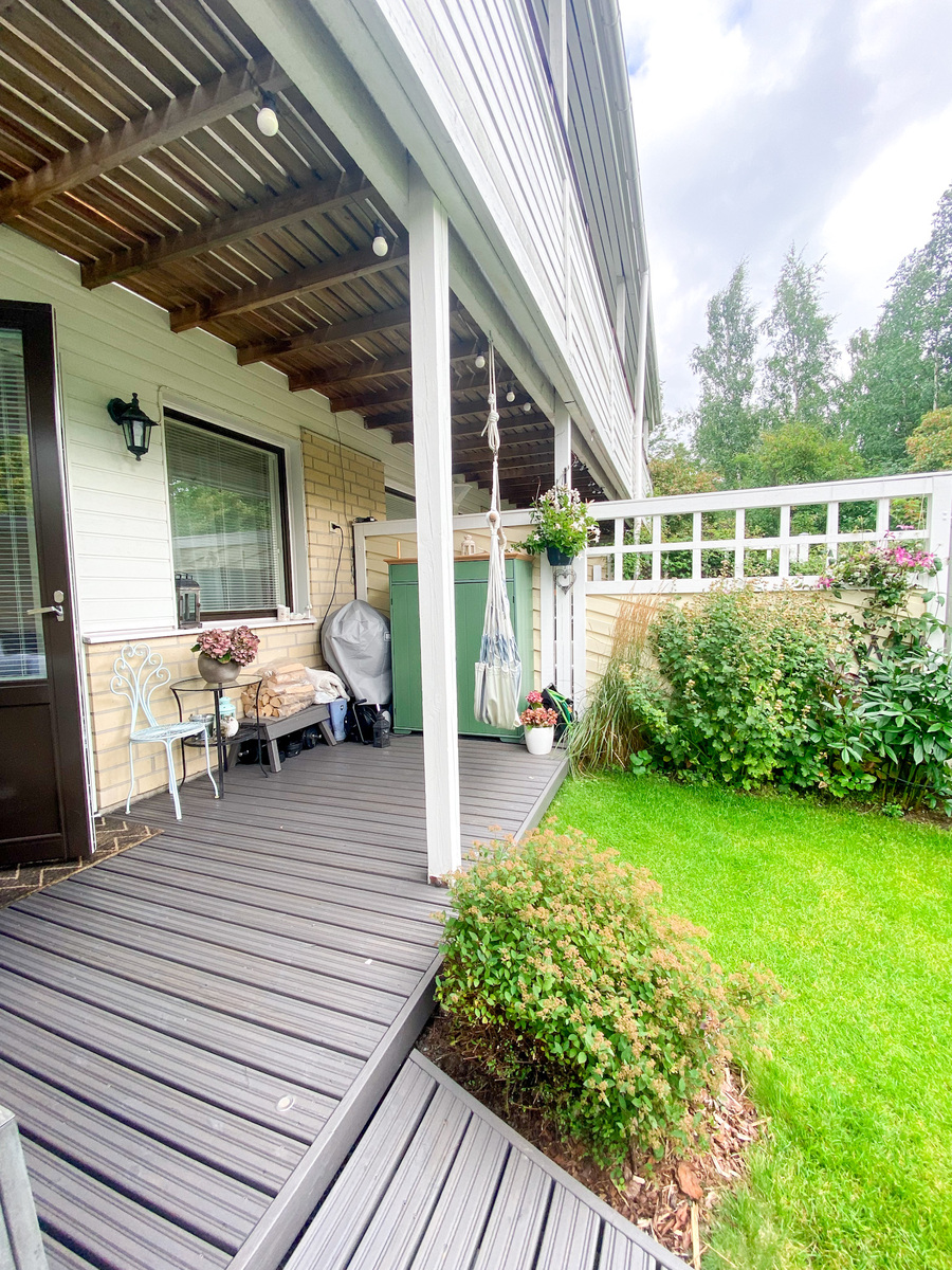 Tässä asunnossa kauniit laminaattilattiat ja seinät tapetoitu. Keittiöstä löytyy muun muassa astianpesukone, jääkaappi/pakastin, tilaa ruokapöydälle sekä runsaasti kaappitilaa. Olohuoneessa kauniit tapetit ja laminaattilattiat. Olohuoneen yhteydestä kulku omalle terassille mihin mahtuu hyvin esimerkiksi terassikalusteet ja grilli. Alakerrasta löytyy olohuoneen sekä keittiön lisäksi myös tilava vaatehuone sekä erillinen wc. Yläkerrassa molemmat makuuhuoneet, kylpyhuone/sauna sekä parveke. Isomman makuuhuoneen yhteydestä löytyy oma tilava parveke. Kylpyhuoneessa valmiiksi asennettuna pyykinpesukone sekä kuivausrumpu.