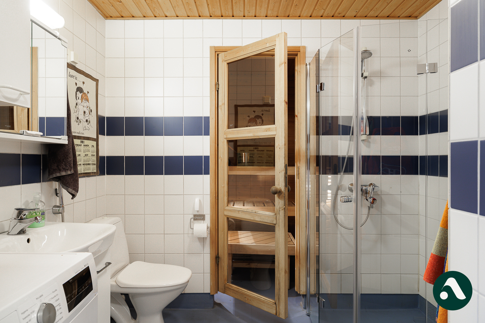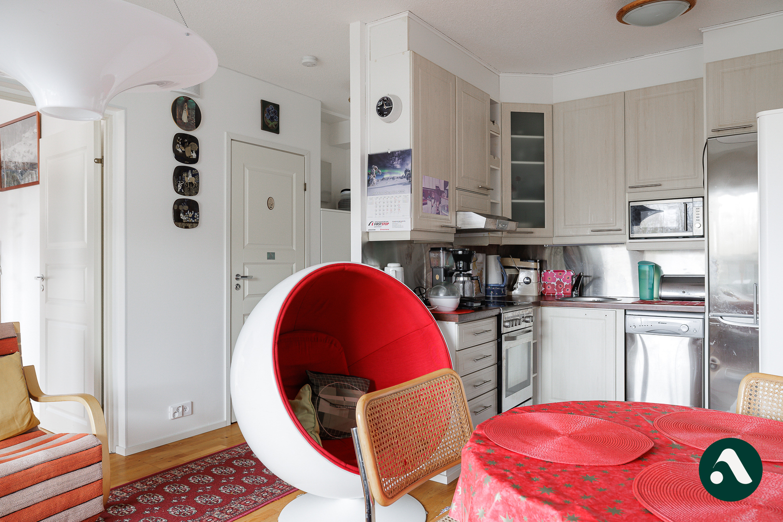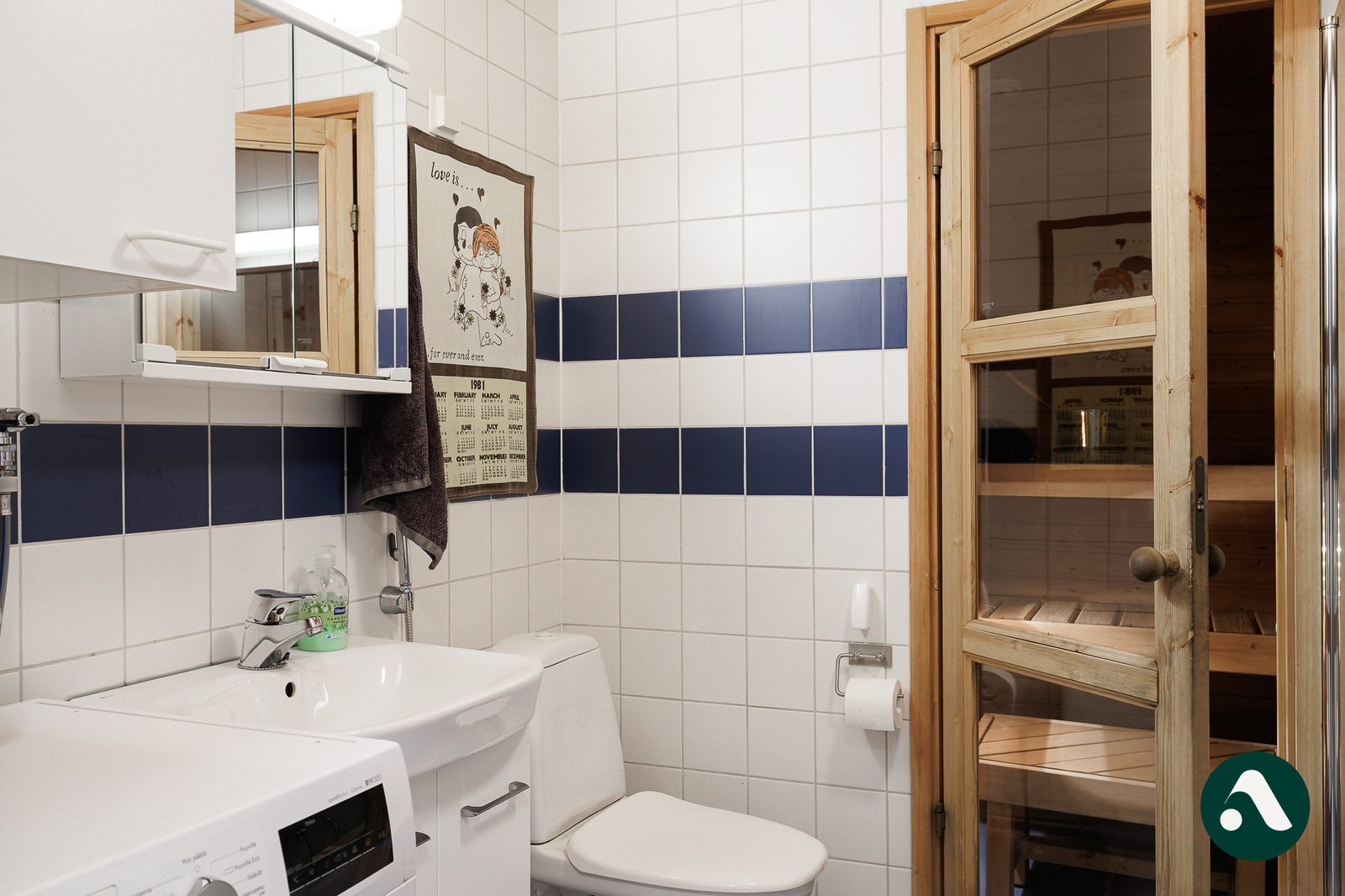 Tupakeittiö on erittäin toimiva ja sen kautta on kulku lasitetulle parvekkeelle. Keittiössä on hyvin työ- ja säilytystilaa. Kylpyhuoneeseen mahtuu hienosti pyykinpesukone ja koko asunnon kruunaa reippaan kokoinen sauna!
