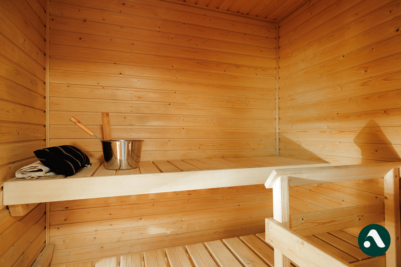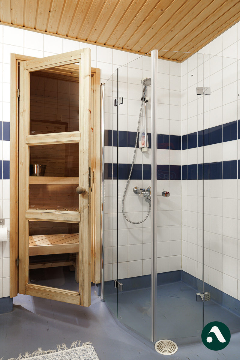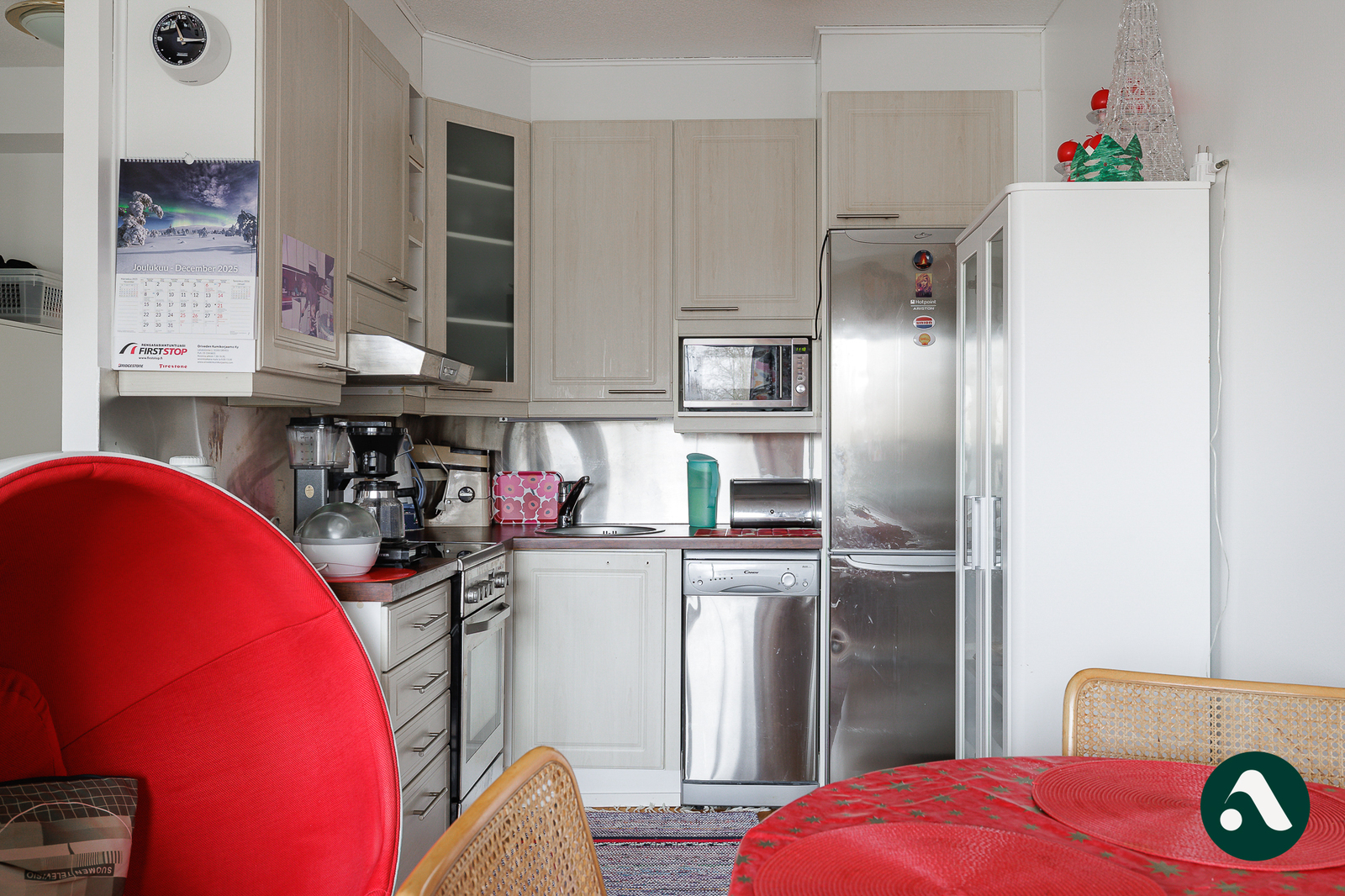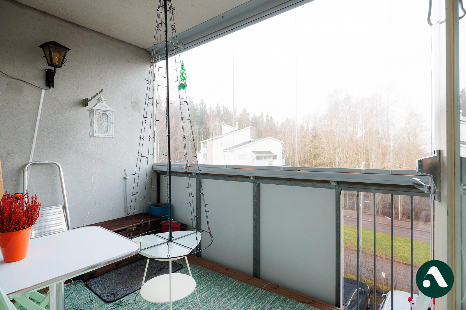 Tupakeittiö on erittäin toimiva ja sen kautta on kulku lasitetulle parvekkeelle. Keittiössä on hyvin työ- ja säilytystilaa. Kylpyhuoneeseen mahtuu hienosti pyykinpesukone ja koko asunnon kruunaa reippaan kokoinen sauna!