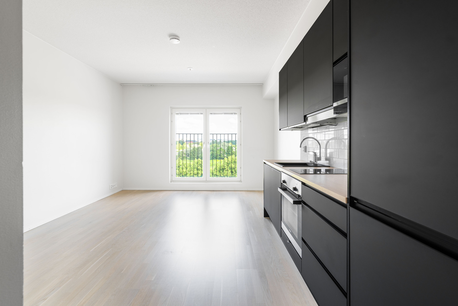 Asunnossa on tyylikkäät, mustat keittiökalusteet ja avara pohjaratkaisu. Katseenvangitsijana toimii kaunis, kaksiovinen ranskalainen parveke, joka tuo valoa ja ilmettä tilaan. Huoneisto on hyvässä kunnossa, joten remonttitarpeita ei ole.