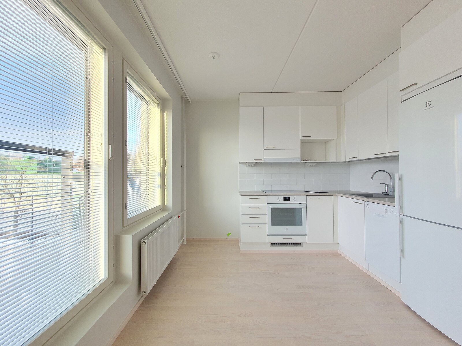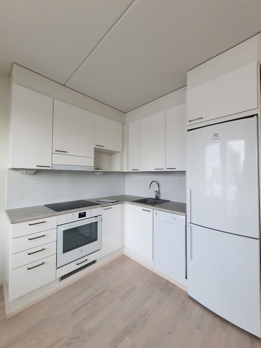 Tämän kodin seinät ovat raikkaan valkoiset ja lattiat ylellistä parkettia. Modernista, kauniin vaaleasta keittiöstä löytyy kaikki tarvittava kotikokin tarpeisiin astianpesukoneineen. Keittiö on mukavasti omassa nurkkauksessaan jolloin et joudu nukkumaan samassa tilassa missä kokkaat ja sinne mahtuu myös pieni ruokapöytä. Tyylikkäästi laatoitetussa kylpyhuoneessa on peilikaappi, kääntyvä suihkuseinä ja pesukoneliitäntä. Asunnossa on myös ranskalainen parveke. Lisäksi kellarissa sijaitsee huoneistokohtainen varastokomero.