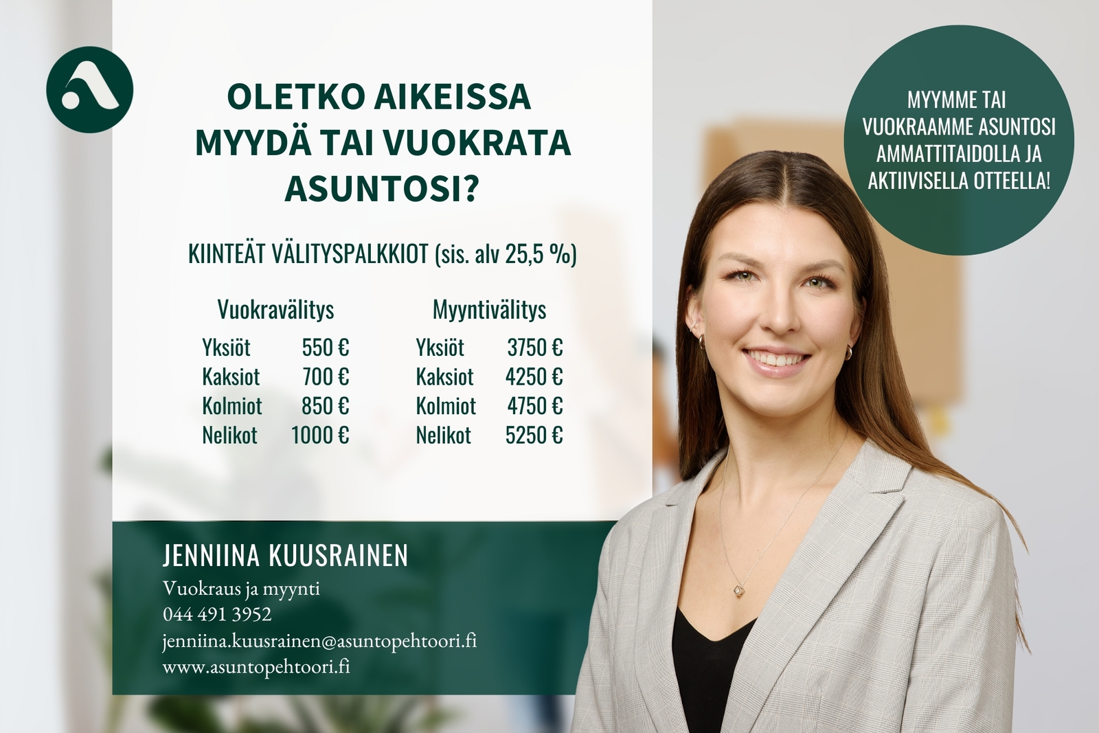Täytä lomake ja välittäjä on sinuun yhteydessä mahdollisimman pian näytön sopimiseksi.