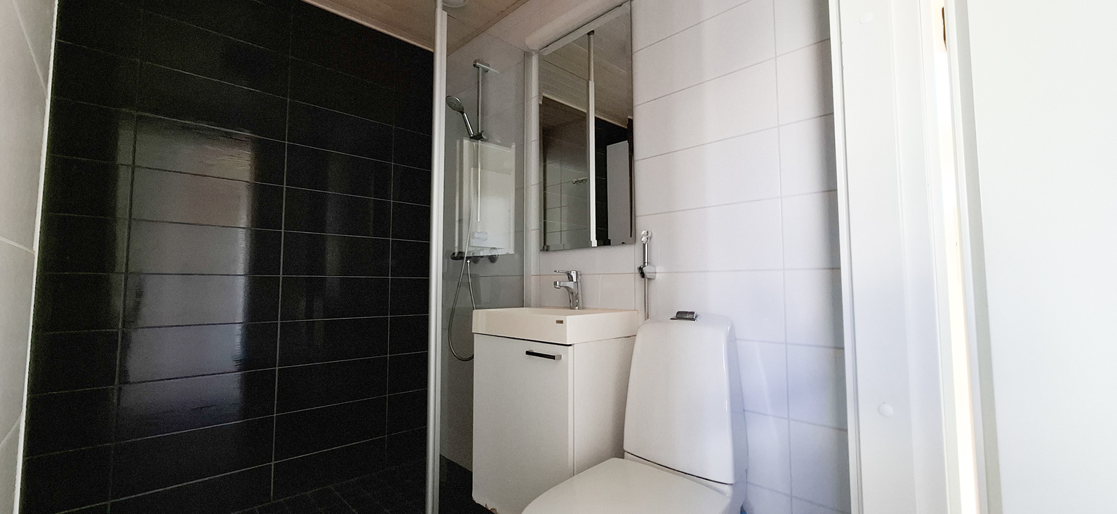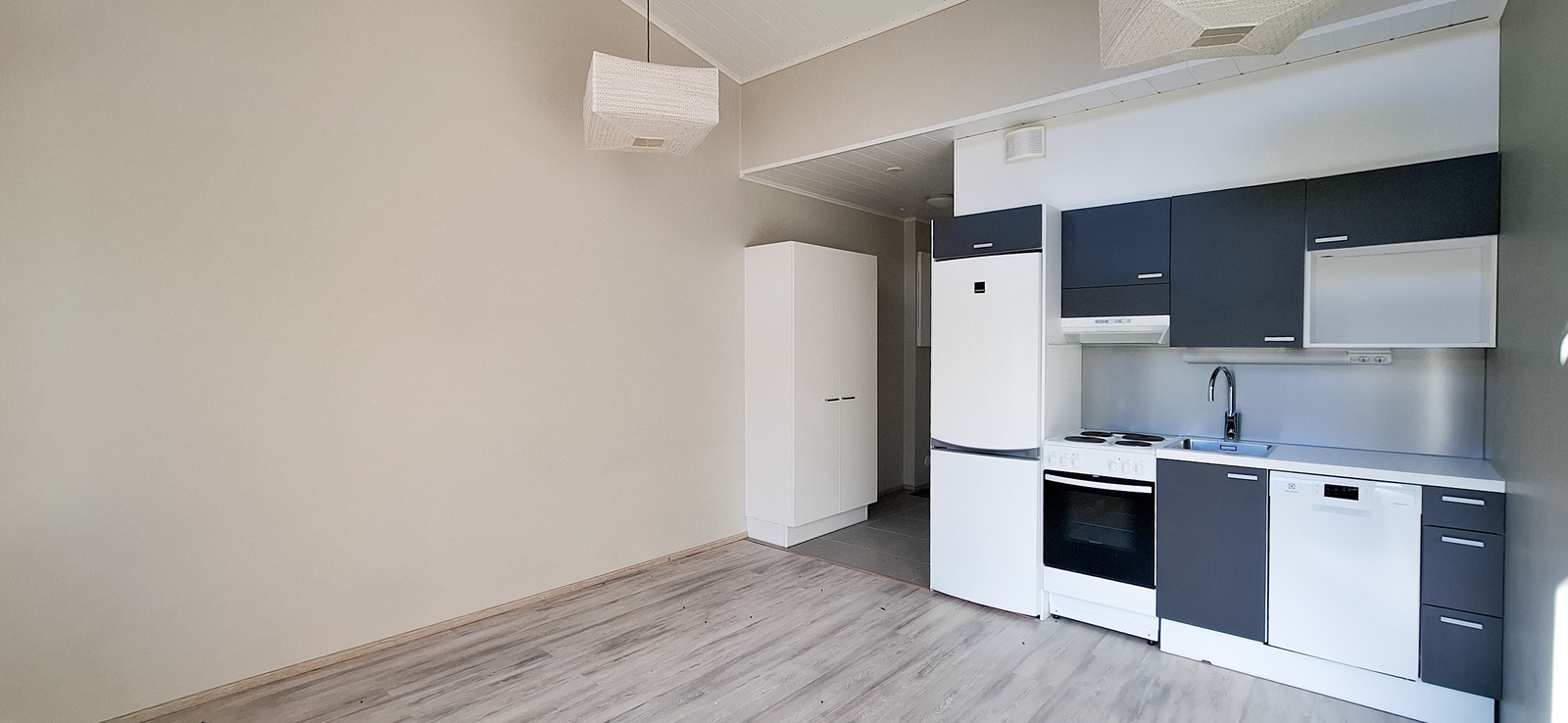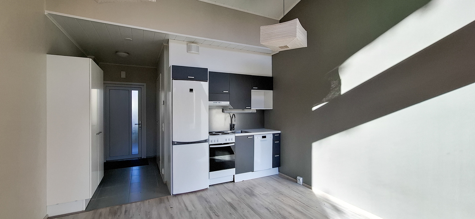 Tässä kodissa on tehokas pohjaratkaisu, huikean korkea huonekorkeus 3,9 m ja lähes lattiasta kattoon yltävät ikkunat. Avokeittiöstä löytyy kaikki tarvittavat kodinkoneet sujuvaan arkeen ja eteisen yhteydessä on vaatekaappi säilytykseen. Huonetilan lattia on helppohoitoista laminaattia ja eteisessä on käytännöllinen laatoitus. Kylpyhuoneessa on tila pyykinpesukoneelle.