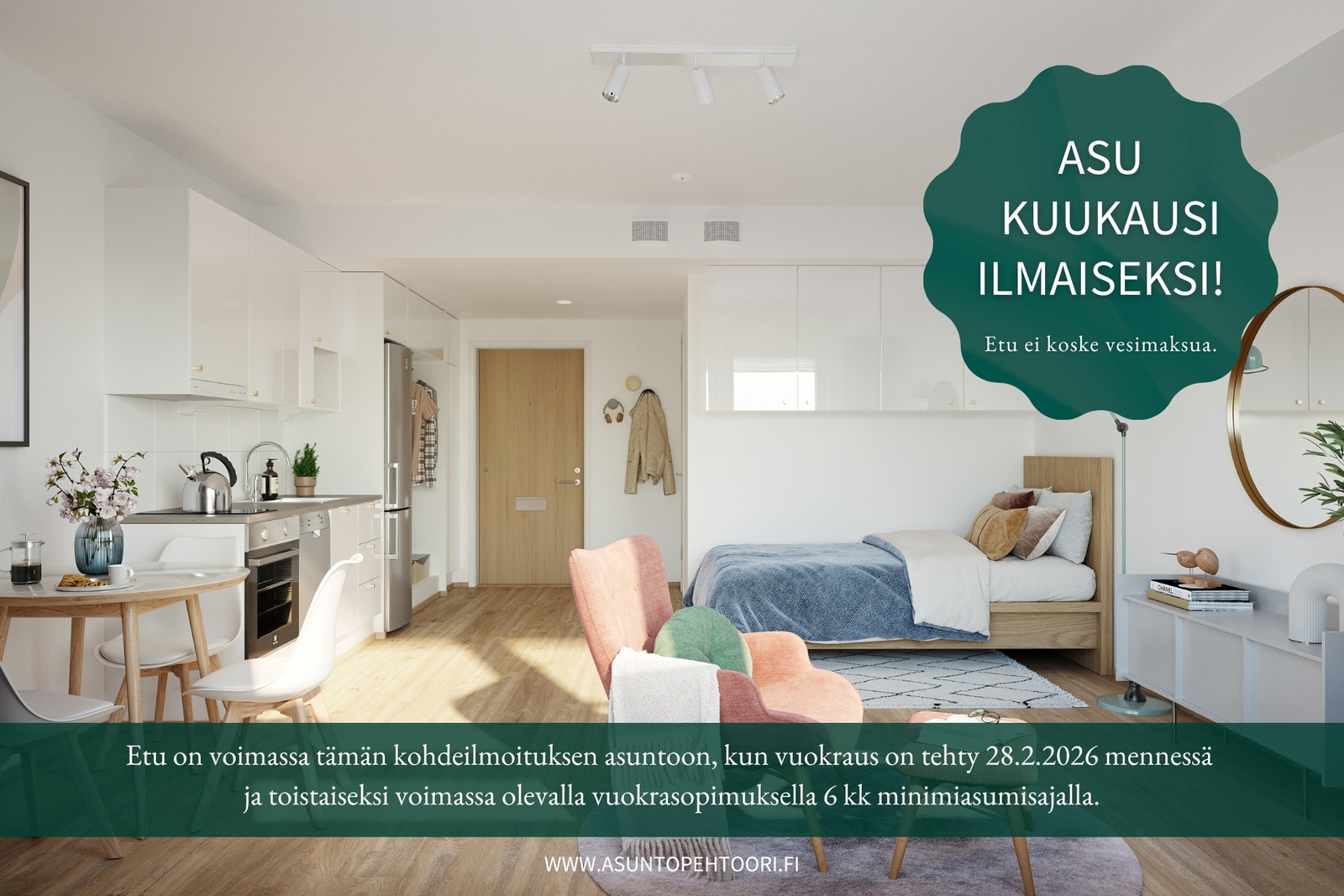 Kampanjaehdot: Kampanja voimassa Juli Lamminpään Taiteilija asuntoihin, joihin solmitaan toistaiseksi voimassa oleva vuokrasopimus 6 kuukauden minimiasumisajalla. Jotta voit hyödyntää kampanjamme, asunnon vuokraus on tehtävä verkkosivuillamme 1.2.-28.2.2026 välisenä aikana. Vuokrauksen yhteydessä maksettu ennakkovuokra vähennetään kolmannelta täyden kuun vuokralaskulta ja kampanjaetu vähennetään neljänneltä täyden kuun vuokralaskulta. Mikäli sopimus on kestänyt alle 4 kuukautta, kampanjaetua ei hyödynnetä eikä sitä hyvitetä vuokralaskulta. Mikäli sopimus irtisanotaan ennen minimiasumisajan päättymistä, aiemmin hyvitetty kampanjaetu laskutetaan viimeisessä vuokralaskussa. Kampanjaetua ei voi hyödyntää aiemmin tehtyihin vuokrasopimuksiin eikä etua voi yhdistää muihin kampanjoihin. Kampanjaetua ei voi hyödyntää sopimusmuutoksissa, asunnonvaihdoissa Juli-kodista toiseen minimiasumisaikana tai jos vuokranmaksu ei ole ajan tasalla. Kampanjaetu ei koske vesimaksua.