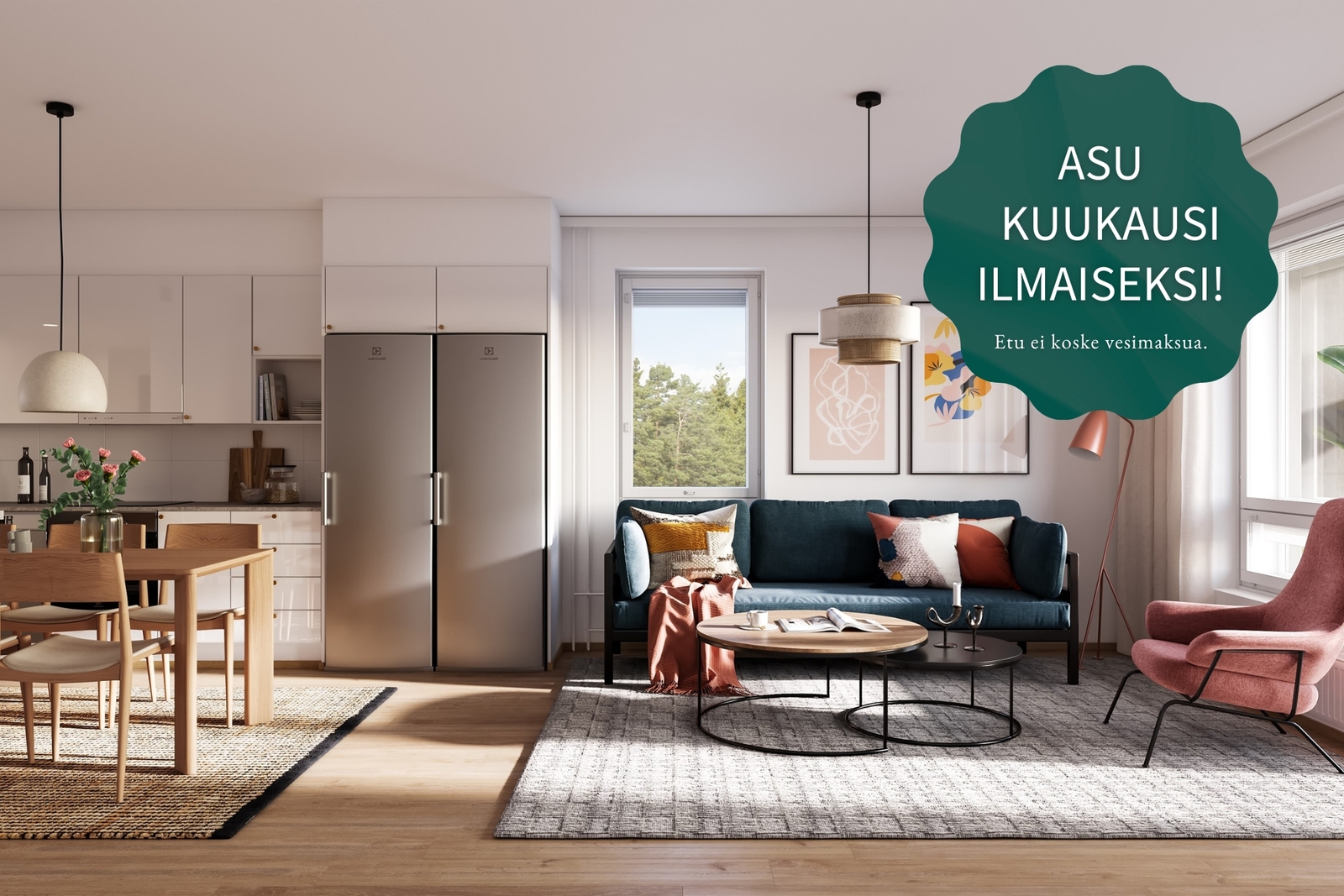 Kampanjaehdot: Kampanja voimassa Juli Lamminpään Taiteilija asuntoihin, joihin solmitaan toistaiseksi voimassa oleva vuokrasopimus 12 kuukauden minimiasumisajalla. Jotta voit hyödyntää kampanjamme, asunnon vuokraus on tehtävä verkkosivuillamme 6.10.-31.10.2025 välisenä aikana. Vuokrauksen yhteydessä maksettu ennakkovuokra vähennetään kolmannelta täyden kuun vuokralaskulta ja kampanjaetu vähennetään neljänneltä täyden kuun vuokralaskulta. Mikäli sopimus on kestänyt alle 4 kuukautta, kampanjaetua ei hyödynnetä eikä sitä hyvitetä vuokralaskulta. Mikäli sopimus irtisanotaan ennen minimiasumisajan päättymistä, aiemmin hyvitetty kampanjaetu laskutetaan viimeisessä vuokralaskussa. Kampanjaetua ei voi hyödyntää aiemmin tehtyihin vuokrasopimuksiin eikä etua voi yhdistää muihin kampanjoihin. Kampanjaetua ei voi hyödyntää sopimusmuutoksissa, asunnonvaihdoissa Juli-kodista toiseen minimiasumisaikana tai jos vuokranmaksu ei ole ajan tasalla. Kampanjaetu ei koske vesimaksua.