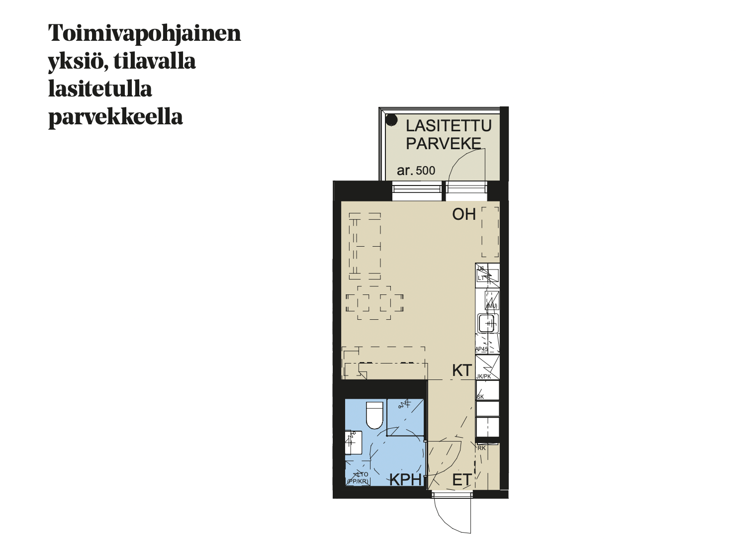 Asunnon suuret ikkunat ja iso lasitettu parveke luovat tilavan ja valoisan ilmeen. Moderni ja hyvin varusteltu keittiö, iso kylpyhuone, reilu säilytys- ja kaappitila sekä asuntoon valmiiksi asennetut sälekaihtimet ja verhokiskot muodostavat erittäin toimivan kokonaisuuden. Lattiamateriaalina laadukas ja kestävä vinyylilankku, joka luo kodikasta tunnelmaa. Seinät ovat kauniin valkoiset, mikä antaa tilalle raikkaan ja avaran ilmeen.