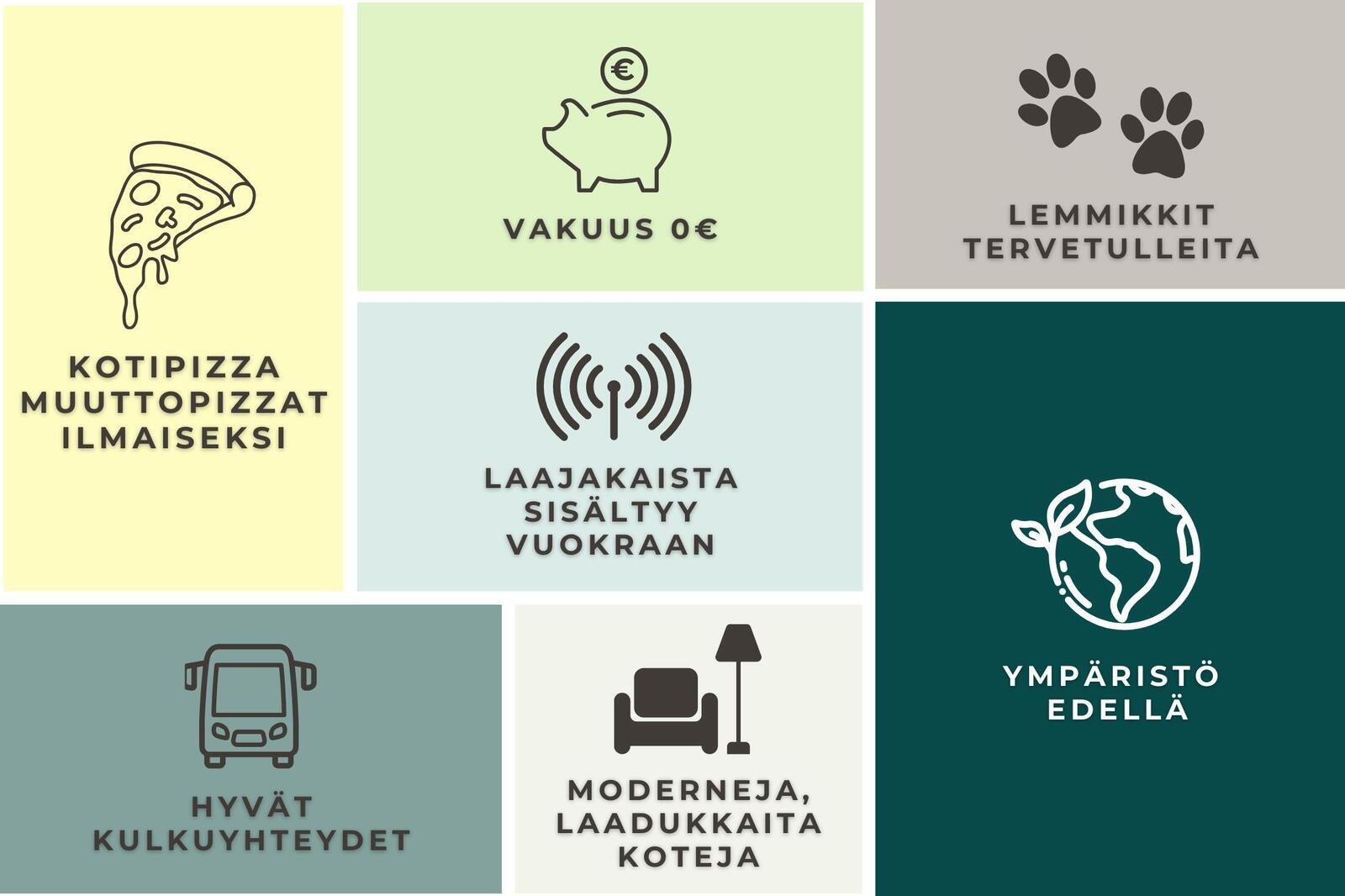HUOM! Vakuus 0 € ja kerrostalossa viihtyvät lemmikit ovat tervetulleita. 🙂