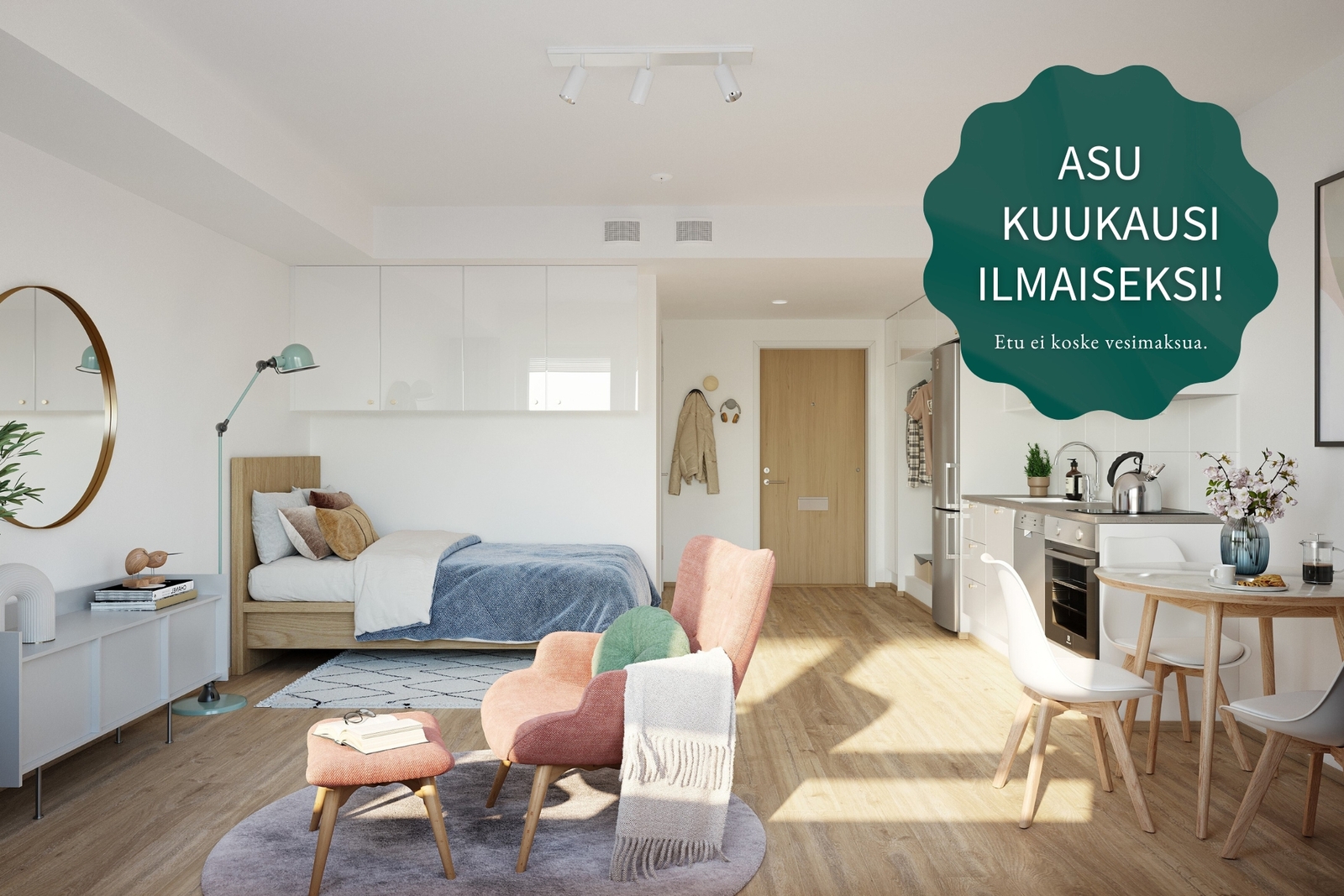 Kampanjaehdot: Kampanja voimassa Juli Lamminpään Runoilija asuntoihin, joihin solmitaan toistaiseksi voimassa oleva vuokrasopimus 12 kuukauden minimiasumisajalla. Jotta voit hyödyntää kampanjamme, asunnon vuokraus on tehtävä verkkosivuillamme 1.12.-31.12.2025 välisenä aikana. Vuokrauksen yhteydessä maksettu ennakkovuokra vähennetään kolmannelta täyden kuun vuokralaskulta ja kampanjaetu vähennetään neljänneltä täyden kuun vuokralaskulta. Mikäli sopimus on kestänyt alle 4 kuukautta, kampanjaetua ei hyödynnetä eikä sitä hyvitetä vuokralaskulta. Mikäli sopimus irtisanotaan ennen minimiasumisajan päättymistä, aiemmin hyvitetty kampanjaetu laskutetaan viimeisessä vuokralaskussa. Kampanjaetua ei voi hyödyntää aiemmin tehtyihin vuokrasopimuksiin eikä etua voi yhdistää muihin kampanjoihin. Kampanjaetua ei voi hyödyntää sopimusmuutoksissa, asunnonvaihdoissa Juli-kodista toiseen minimiasumisaikana tai jos vuokranmaksu ei ole ajan tasalla. Kampanjaetu ei koske vesimaksua.