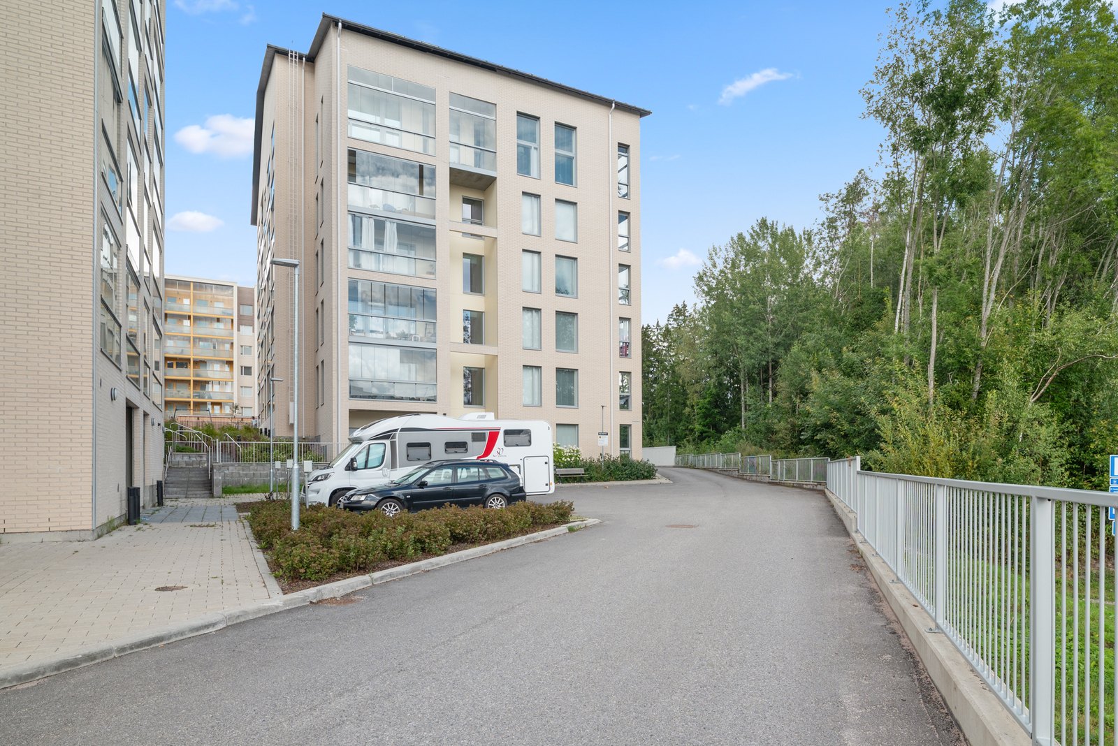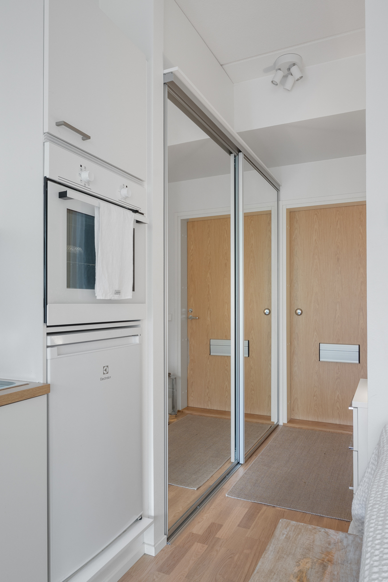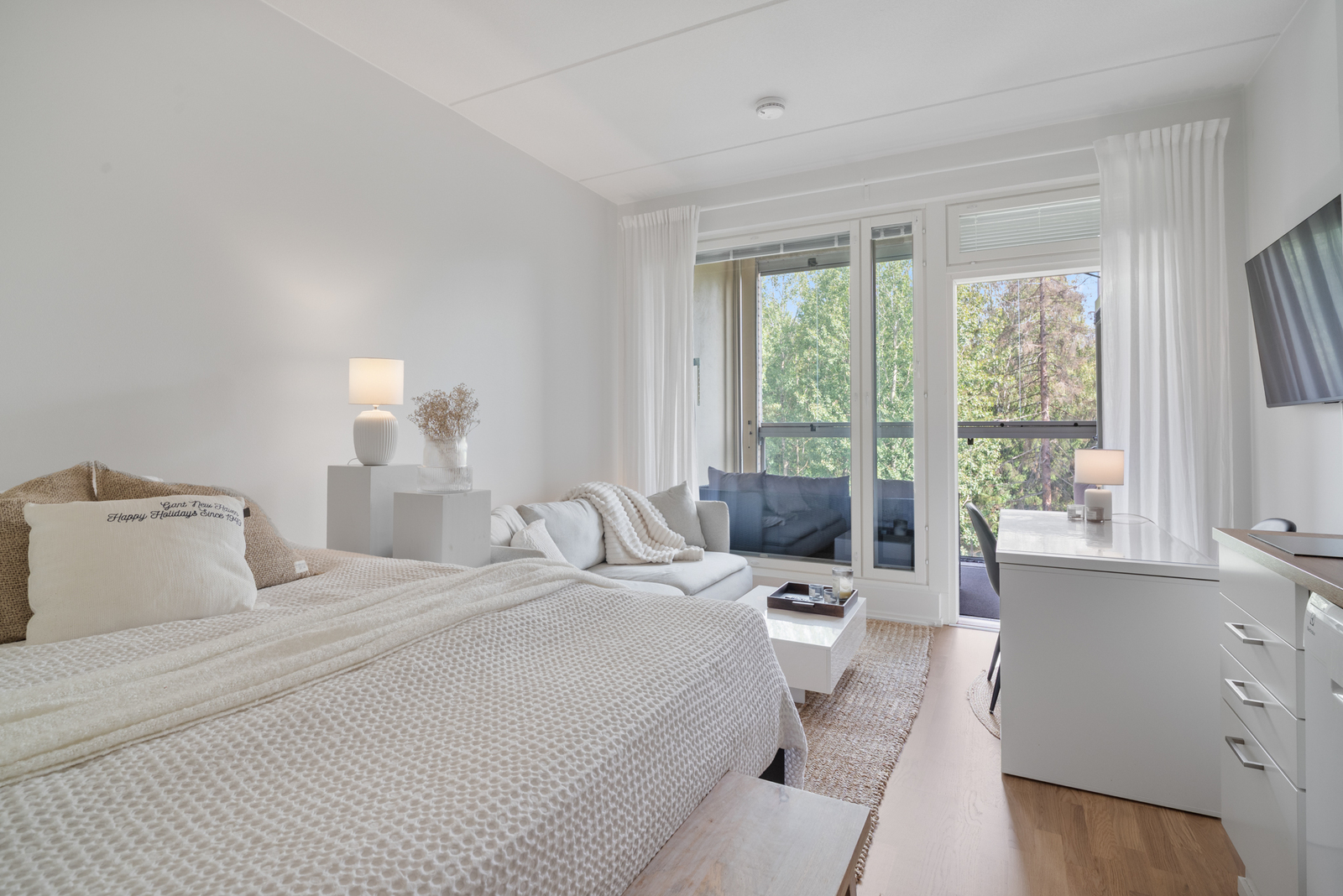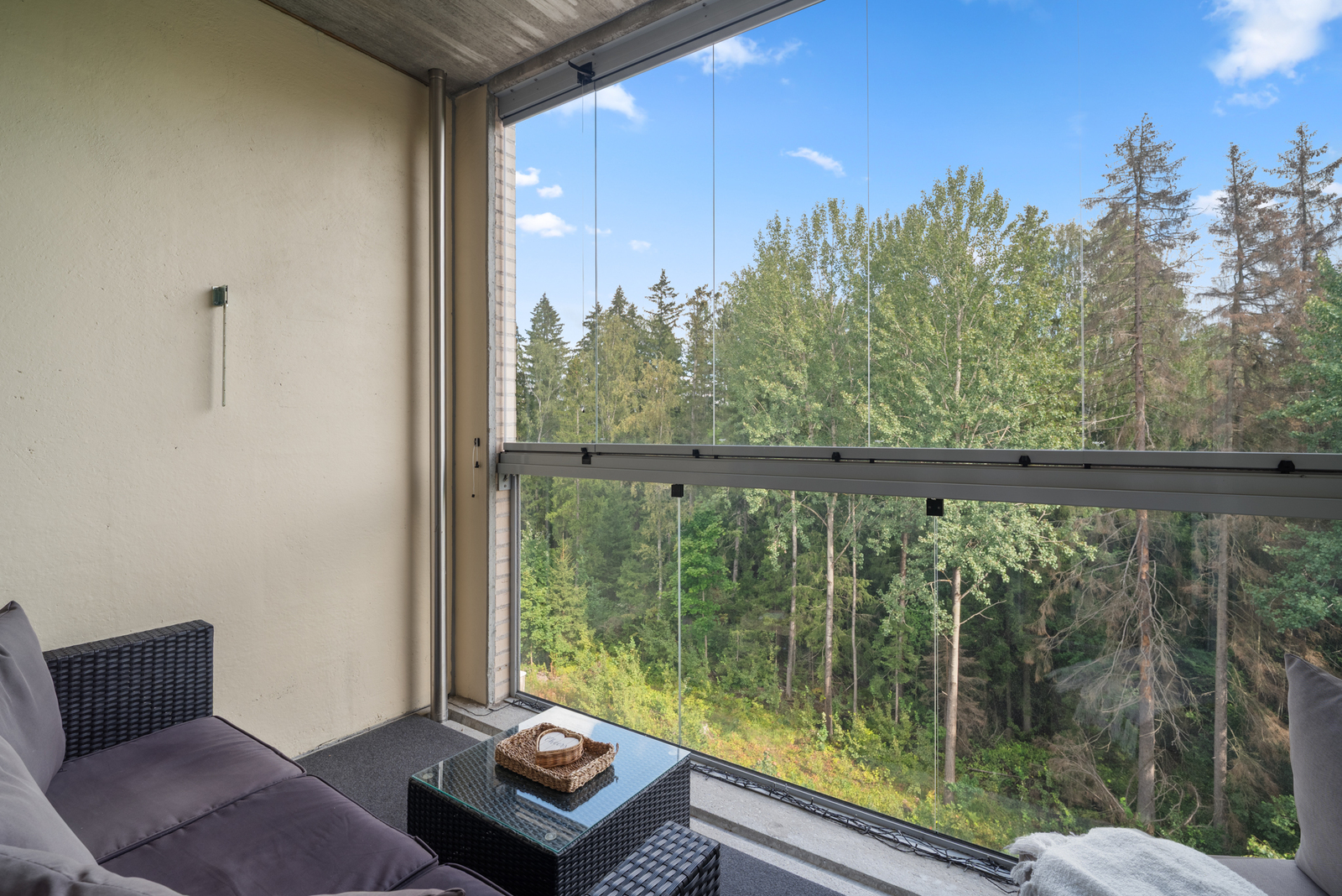 Tämän kauniin kodin pohjaratkaisu on toimiva ja tehokas. Avokeittiössä on kaikki tarvittavat kodinkoneet sujuvaan arkeen ja vaatteille säilytystilaa löytyy eteisen liukuovikaapistosta. Viidennen kerroksen näkymät ovat rauhallisen vehreät metsään päin. Asunnon levyinen lasitettu parveke tarjoaa lisähuoneen keväästä pitkälle syksyyn. Tyylikkäässä kylpyhuoneessa on paikka pyykinpesukoneelle tai vaikka pesutornille. Asunnon lattiat ovat laadukasta parkettia ja seinät raikkaan valkoiset!