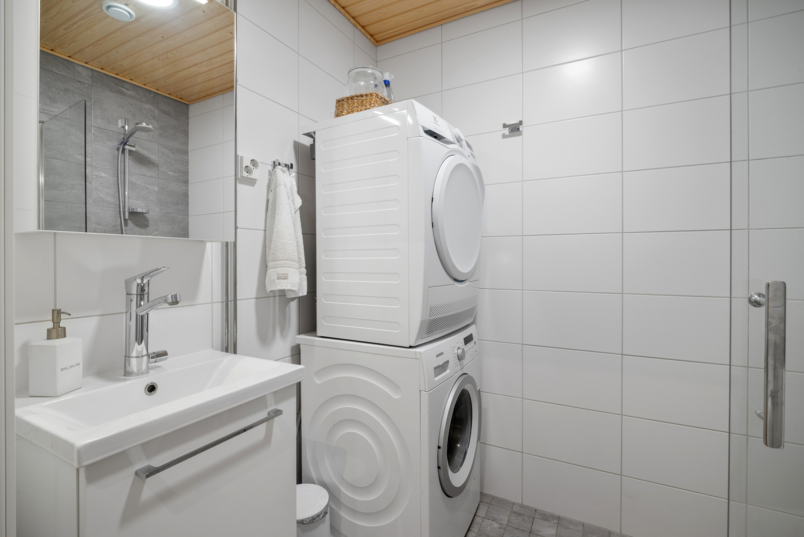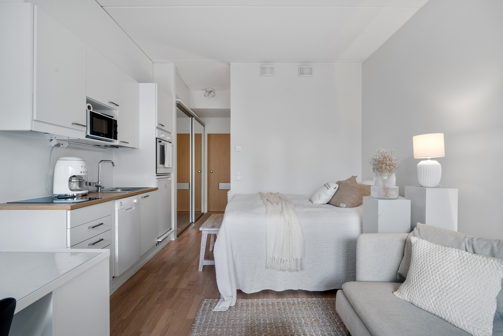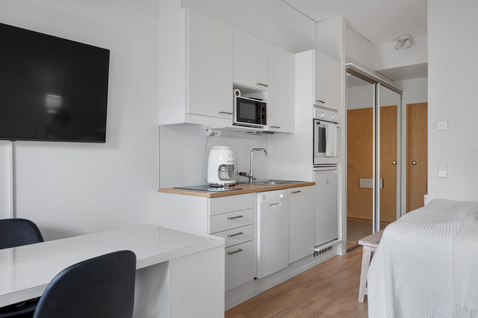 Tämän kauniin kodin pohjaratkaisu on toimiva ja tehokas. Avokeittiössä on kaikki tarvittavat kodinkoneet sujuvaan arkeen ja vaatteille säilytystilaa löytyy eteisen liukuovikaapistosta. Viidennen kerroksen näkymät ovat rauhallisen vehreät metsään päin. Asunnon levyinen lasitettu parveke tarjoaa lisähuoneen keväästä pitkälle syksyyn. Tyylikkäässä kylpyhuoneessa on paikka pyykinpesukoneelle tai vaikka pesutornille. Asunnon lattiat ovat laadukasta parkettia ja seinät raikkaan valkoiset!