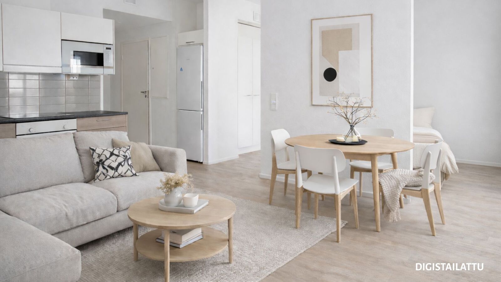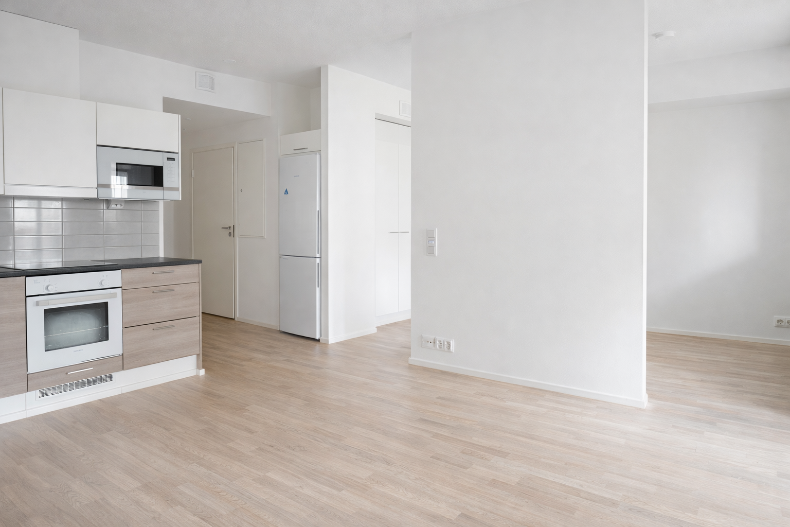 Asunnossa on laadukkaat parkettilattiat ja avokeittiö, joka yhdistyy saumattomasti olohuoneeseen. Modernissa keittiössä on mm. astianpesukone, tilava jääkaappi/pakastin sekä integroitu mikroaaltouuni. Kauniisti laatoitetussa kylpyhuoneessa on tilavaraus pesutornille. Säilytystilaa on hyvin huoneiston kaapistojen ja irtaimistovaraston ansiosta.