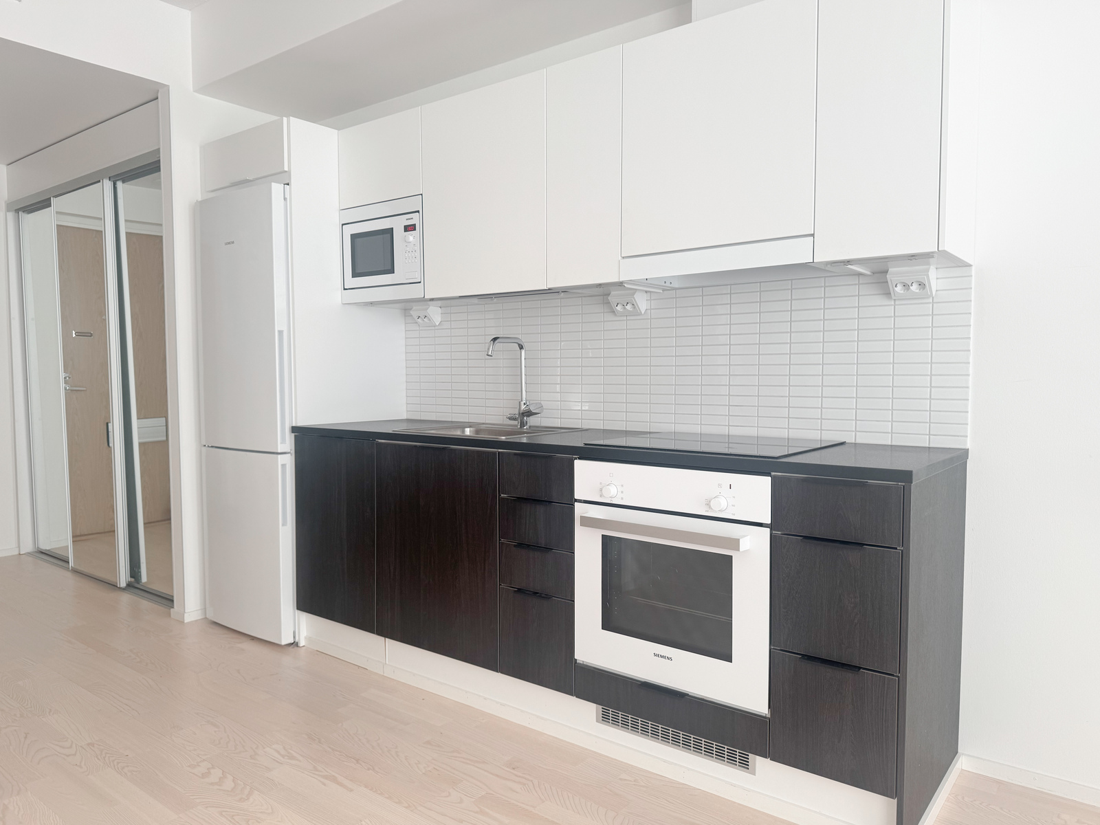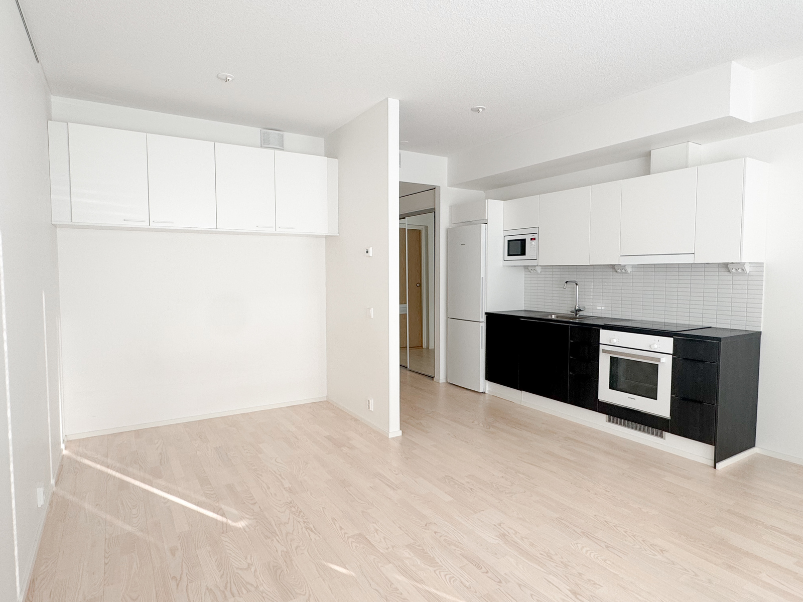 Asunnossa on laadukkaat parkettilattiat, vaaleat seinät ja avokeittiö, joka yhdistyy saumattomasti olohuoneeseen. Hyvin varustellusta keittiöstä löytyy astianpesukone, tilava jääkaappi/pakastin sekä integroitu mikroaaltouuni. Kylpyhuoneessa on paikka pesutornille sekä lattialämmitys. Oleskelutilasta on käynti lasitetulle parvekkeelle johon paistaa kauniisti aamupäivän aurinko. Säilytystilaa on runsaasti kaapistojen ja irtaimistovaraston ansiosta. Vuokraan sisältyy DNA:n 25 M taloyhtiönetti.