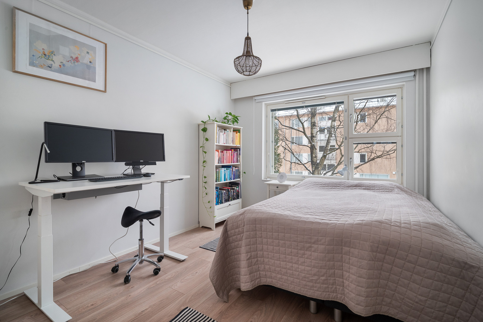 Kodin selkeä huonejako toimii hienosti: Makuuhuoneen sekä keittiön ikkunat suuntaavat itään, ja keittiöstä voi nähdä jopa Vanhankaupunginlahdelle asti. Olohuone on fiksusti toisella puolella asuntoa ja sen ikkunat suuntaavat länteen, pitäen asunnon valoisana juuri oikeaan aikaan. Se toimii myös erinomaisena illanviettopaikkana, sillä sinne mahtuu oleskeluryhmän lisäksi myös ruokapöytä. Asunnon säilytystilat ovat poikkeuksellisen hyvät, sillä kaapistoja on runsaasti.