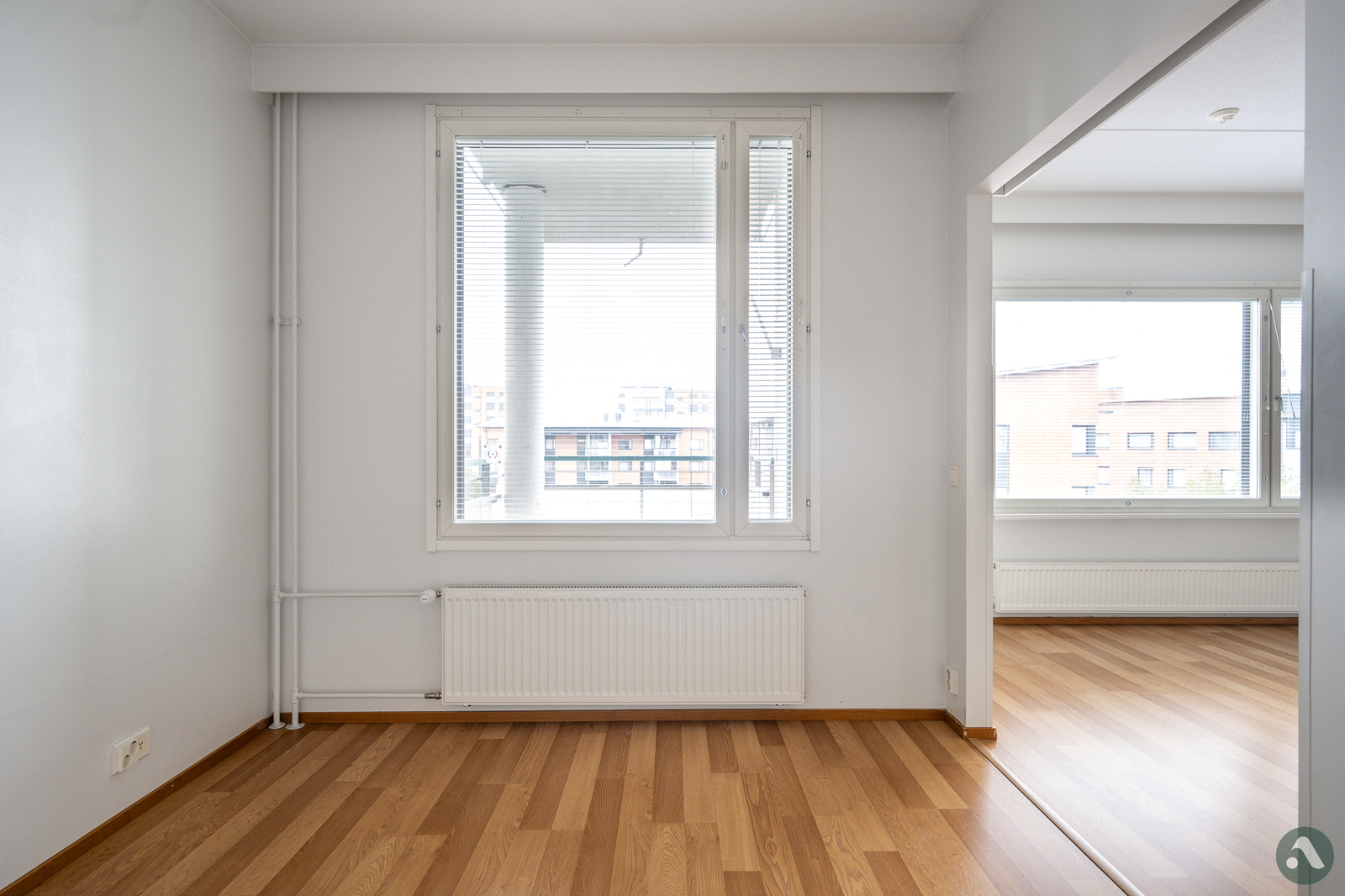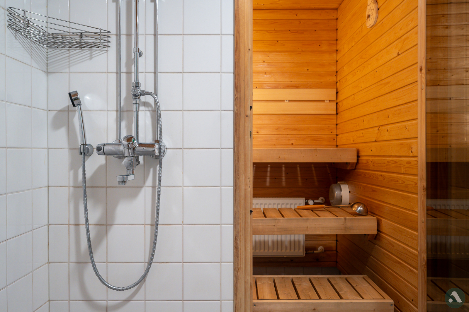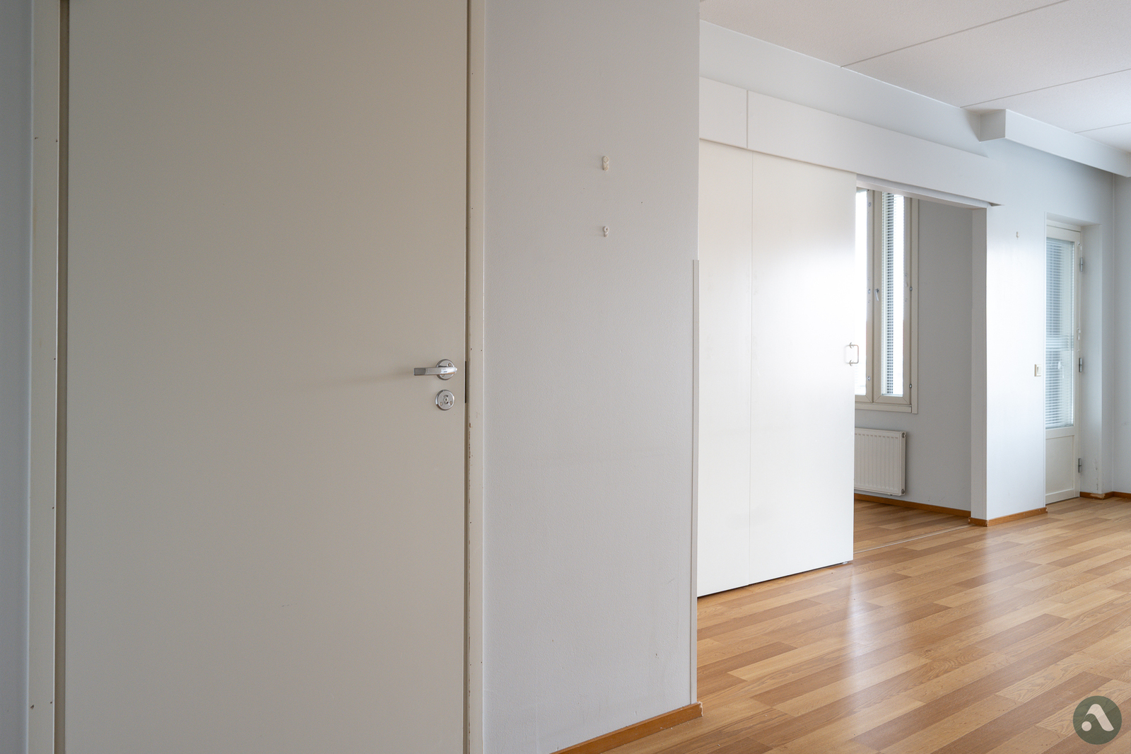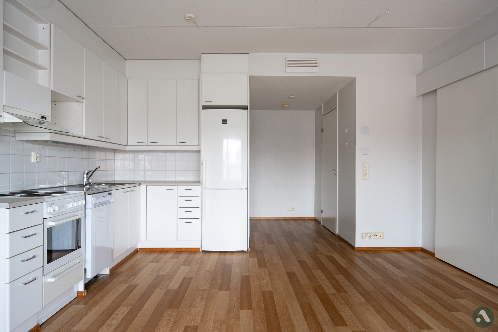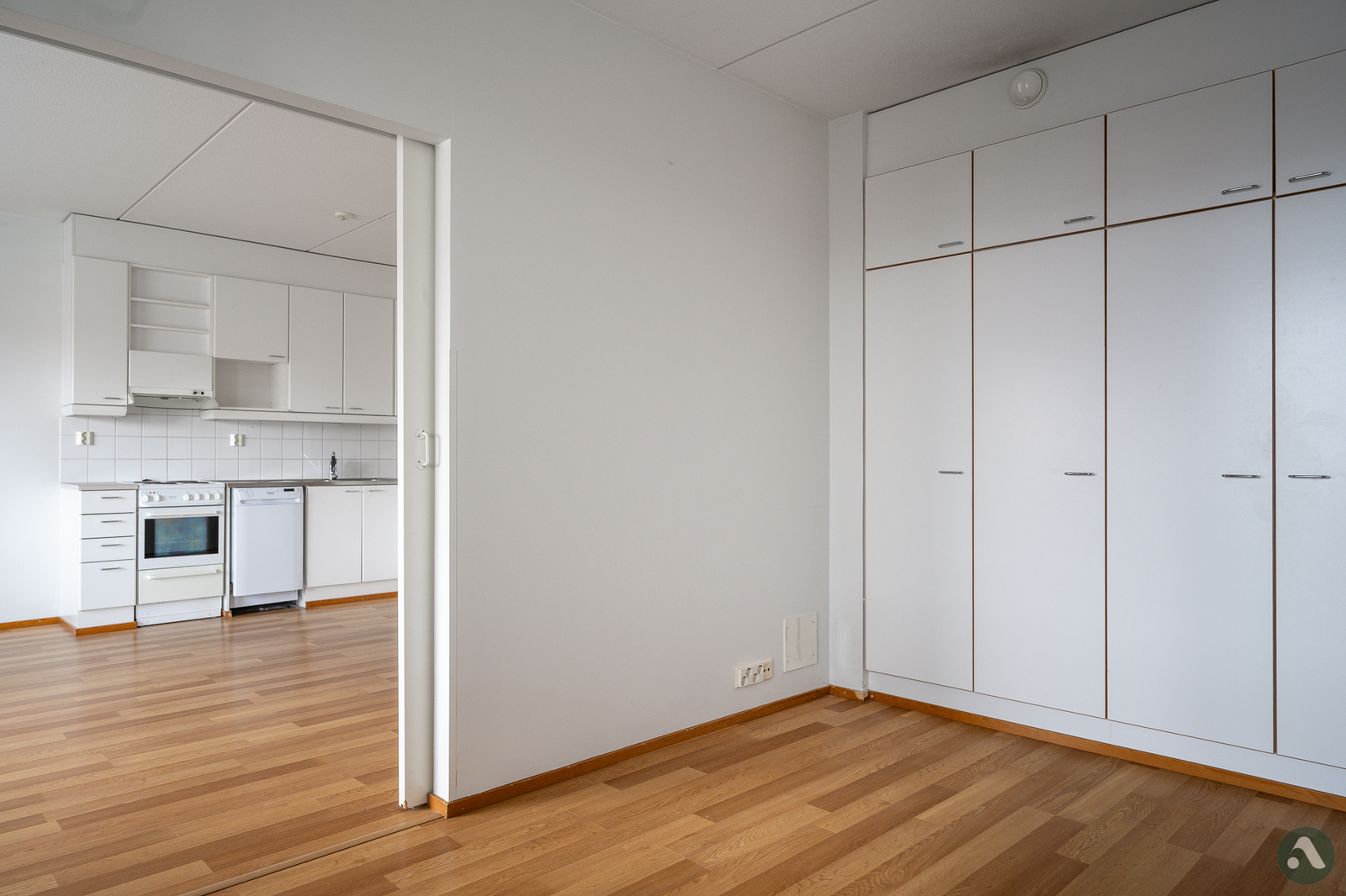 Asunnossa on selkeä ja tehokas pohjaratkaisu: olohuoneessa ja makuuhuoneessa on laminaattilattiat ja vaaleasävyiset, maalatut seinät, jotka tuovat tilaan avaruutta ja valoisuutta. Makuuhuoneessa on kaapistot valmiina, ja säilytystilaa löytyy riittävästi. Keittiö on kompakti, mutta tarjoaa hyvin tilaa arjen kokkailuun. Laatoitettu kylpyhuone on siisti ja käytännöllinen, ja oma, paneloitu sauna kruunaa asumismukavuuden.