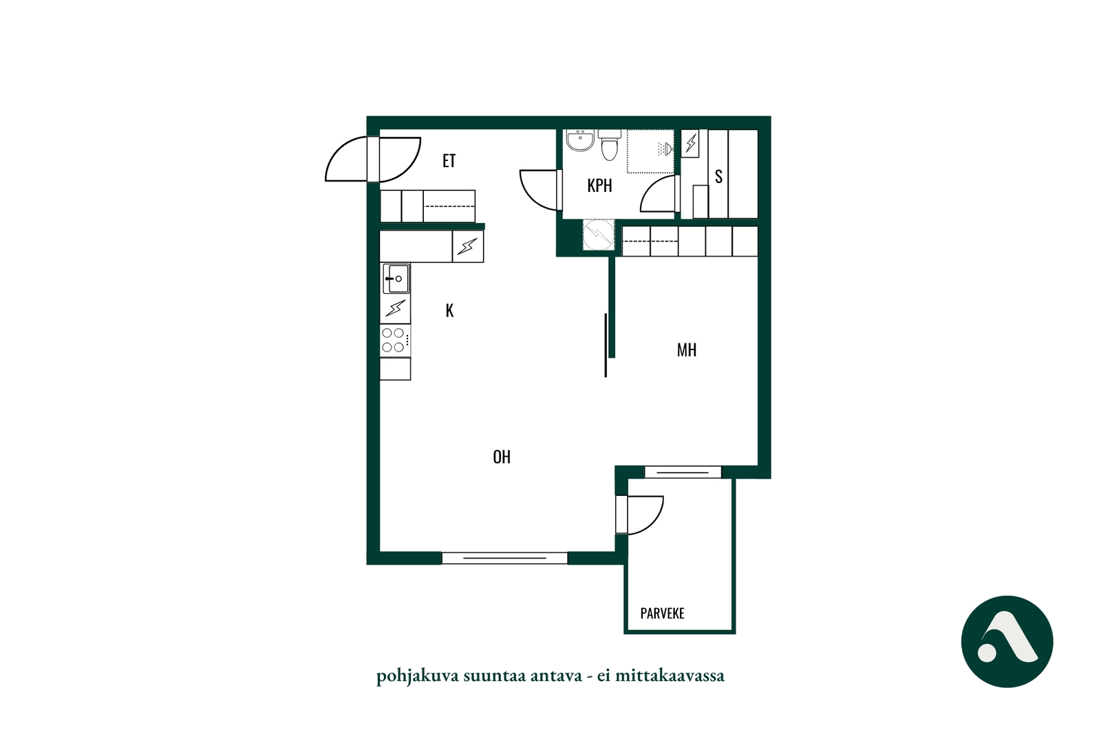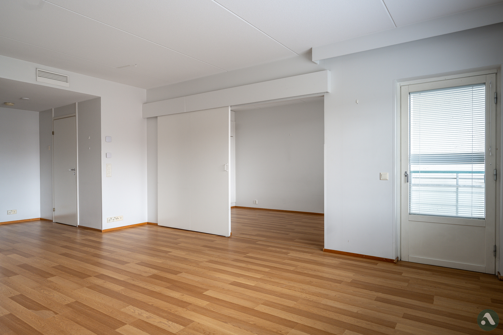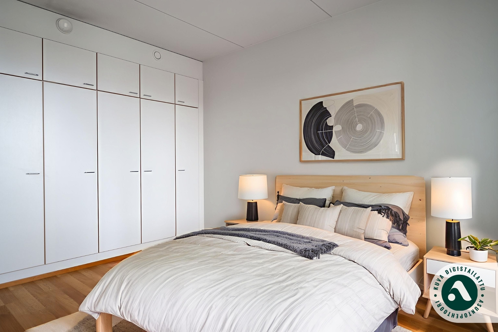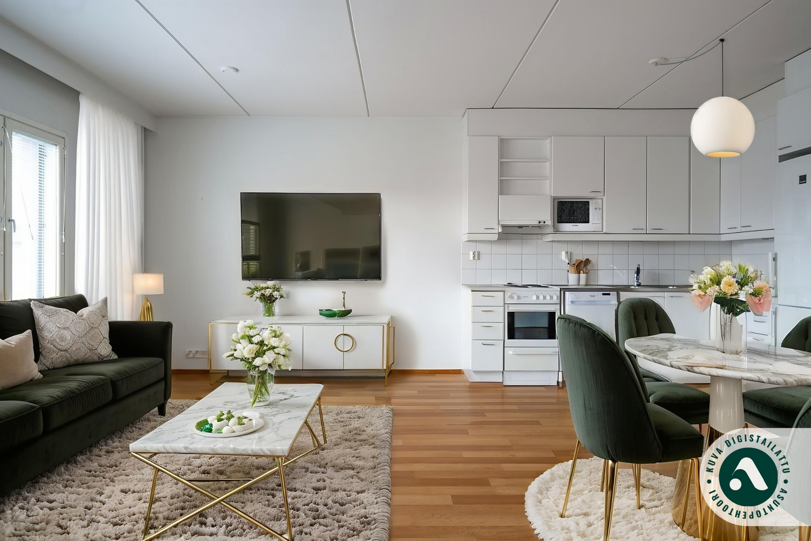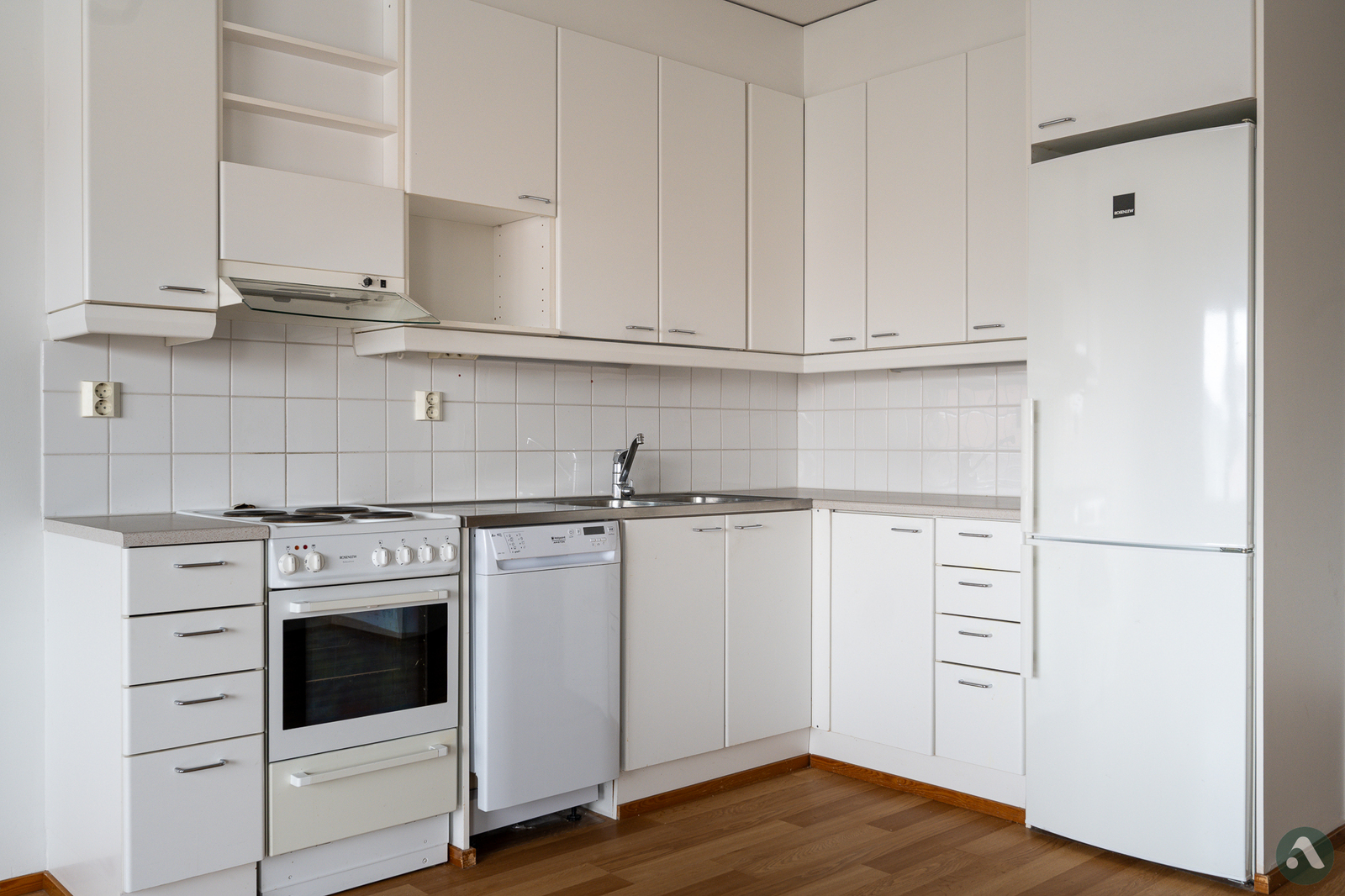 Asunnossa on selkeä ja tehokas pohjaratkaisu: olohuoneessa ja makuuhuoneessa on laminaattilattiat ja vaaleasävyiset, maalatut seinät, jotka tuovat tilaan avaruutta ja valoisuutta. Makuuhuoneessa on kaapistot valmiina, ja säilytystilaa löytyy riittävästi. Keittiö on kompakti, mutta tarjoaa hyvin tilaa arjen kokkailuun. Laatoitettu kylpyhuone on siisti ja käytännöllinen, ja oma, paneloitu sauna kruunaa asumismukavuuden.