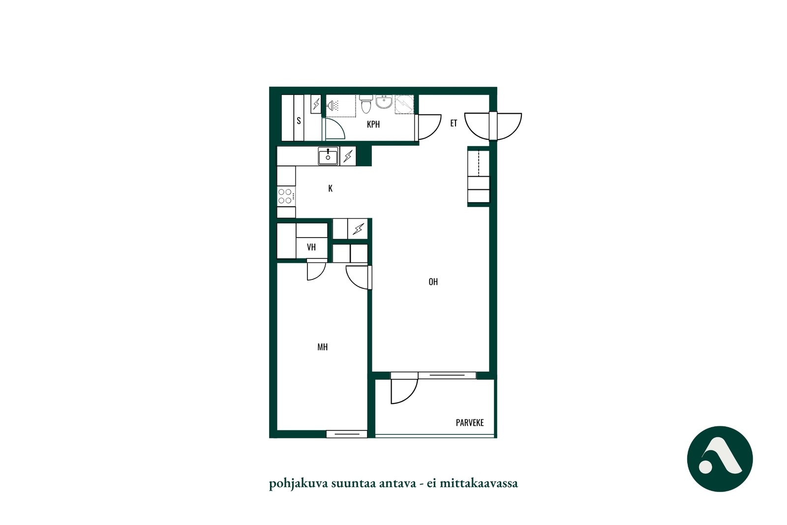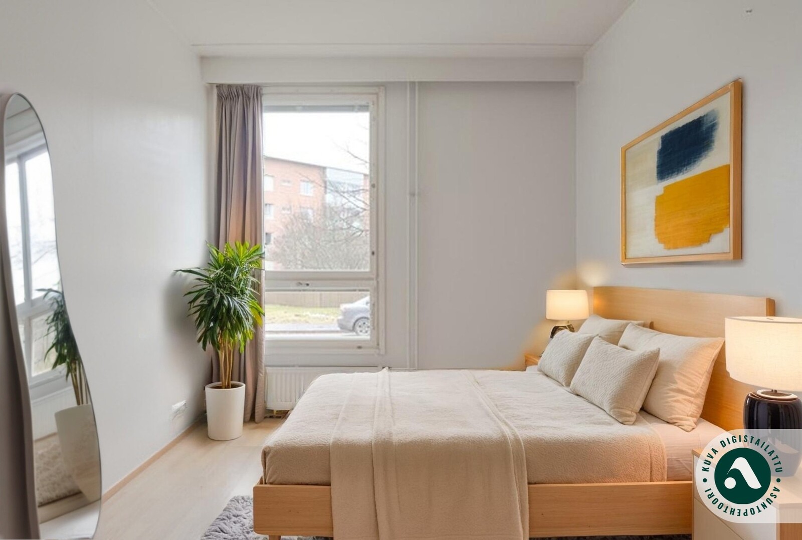 Asunnossa on selkeä ja tehokas pohjaratkaisu: olohuoneessa ja makuuhuoneessa on laminaattilattiat ja vaaleasävyiset, maalatut seinät, jotka tuovat tilaan avaruutta ja valoisuutta. Makuuhuoneessa yhteydessä on vaatehuone, ja säilytystilaa löytyy riittävästi. Keittiö on kompakti, mutta tarjoaa hyvin tilaa arjen kokkailuun. Laatoitettu kylpyhuone on siisti ja käytännöllinen, ja oma, paneloitu sauna kruunaa asumismukavuuden.