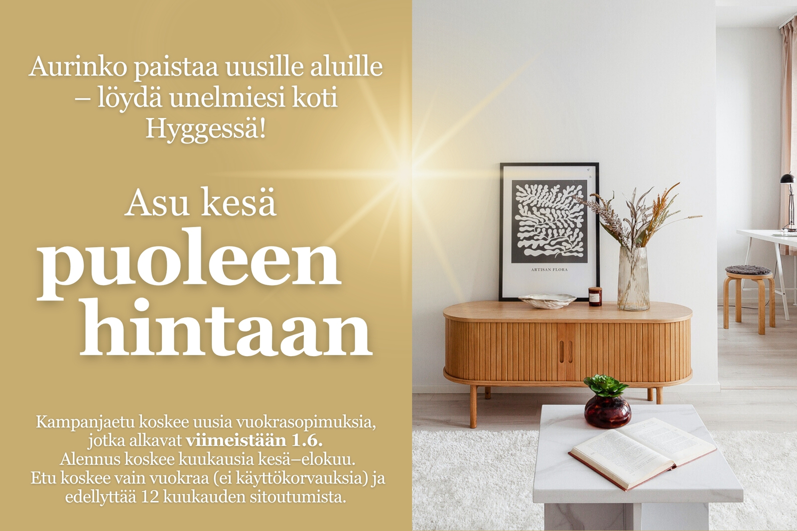 Kampanjaetu koskee ainoastaan uusia vuokrasopimuksia, jotka alkavat viimeistään 1.6.2026. Alennus koskee kuukausia kesä-elokuu.